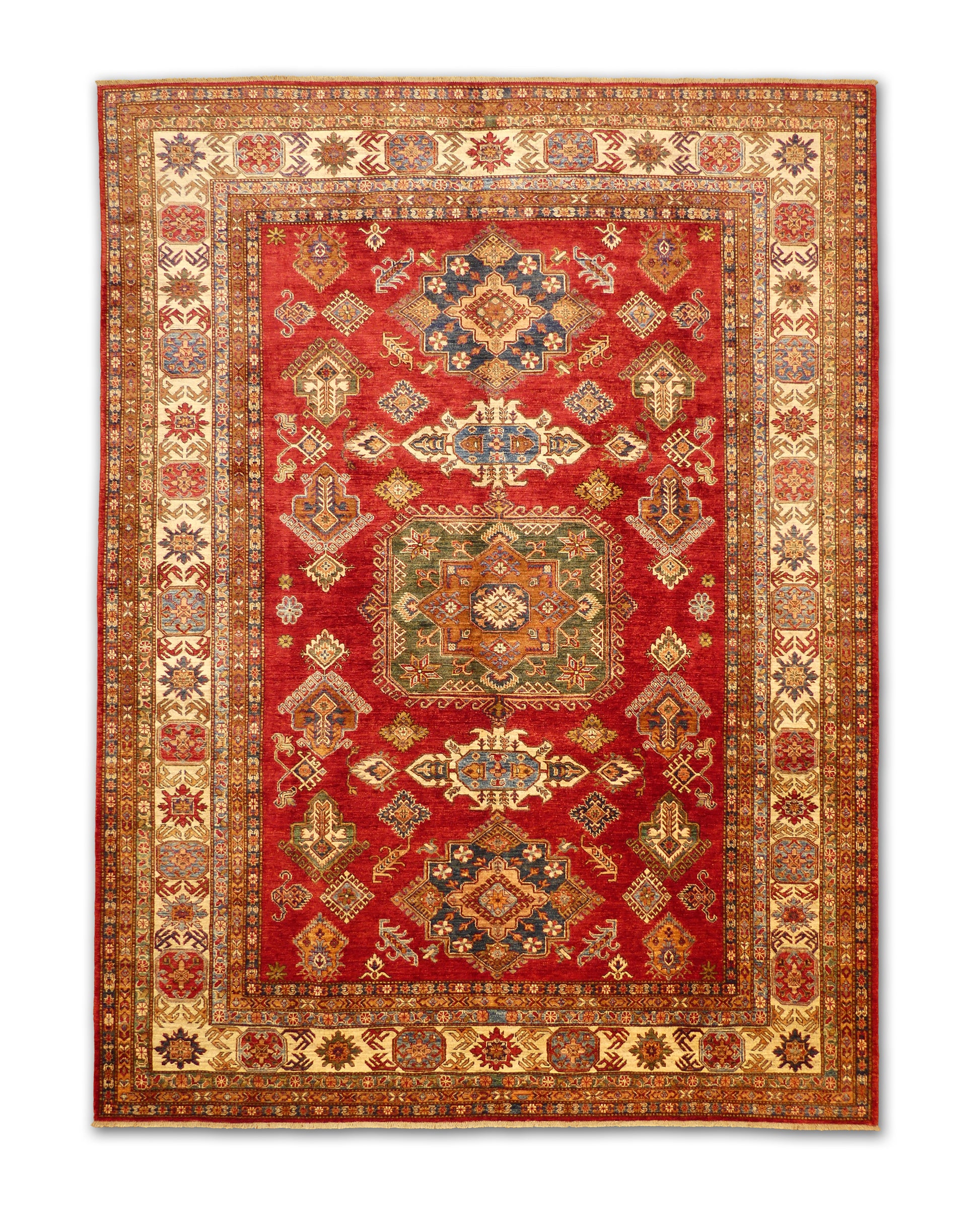 This handmade rug displays a striking geometric medallion design across a rich red field, accented by tones of gold, navy, ivory, and deep green. The interplay of angular motifs and floral details gives it a refined tribal character, while the intricate ivory border enhances its visual depth. Its warm palette and bold symmetry make it an ideal centerpiece for traditional and transitional interiors alike.