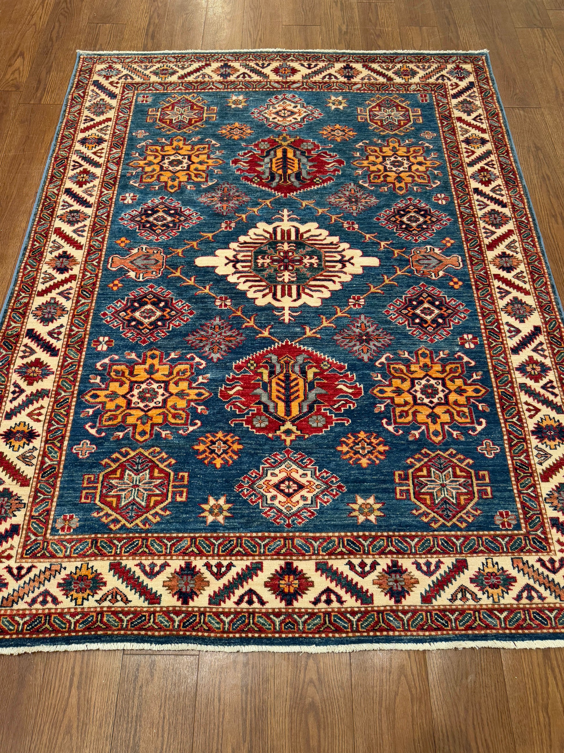 This rug displays a bold tribal medallion design set against a vibrant blue field. The central ivory medallion is surrounded by stylized geometric rosettes, hooked diamonds, and latch-hook motifs in shades of red, gold, and ivory. A strong border filled with angular floral forms and repeating geometric elements frames the composition, creating balance and structure. The saturated colors and crisp lines give this piece a timeless appeal rooted in Caucasian weaving traditions.