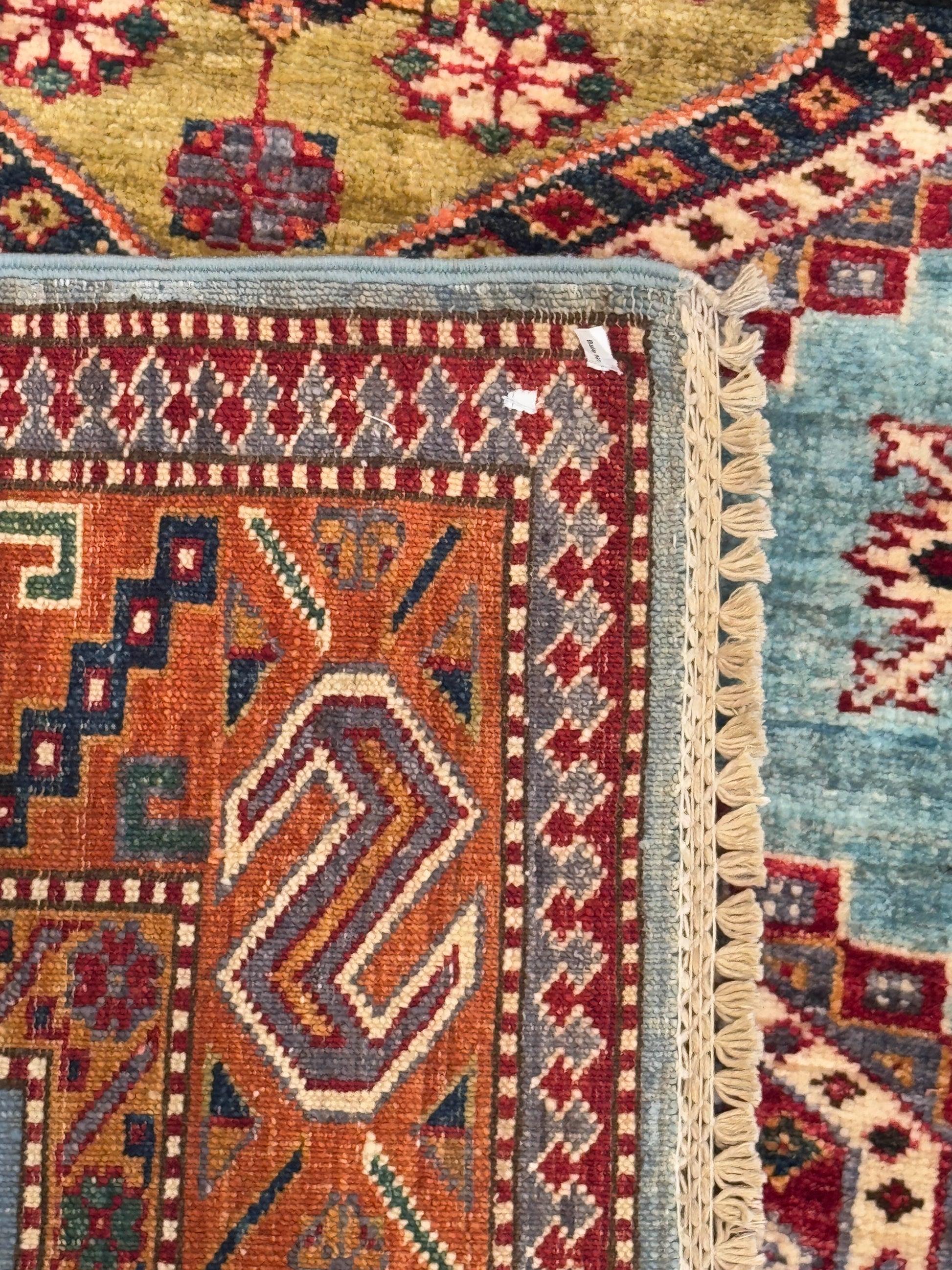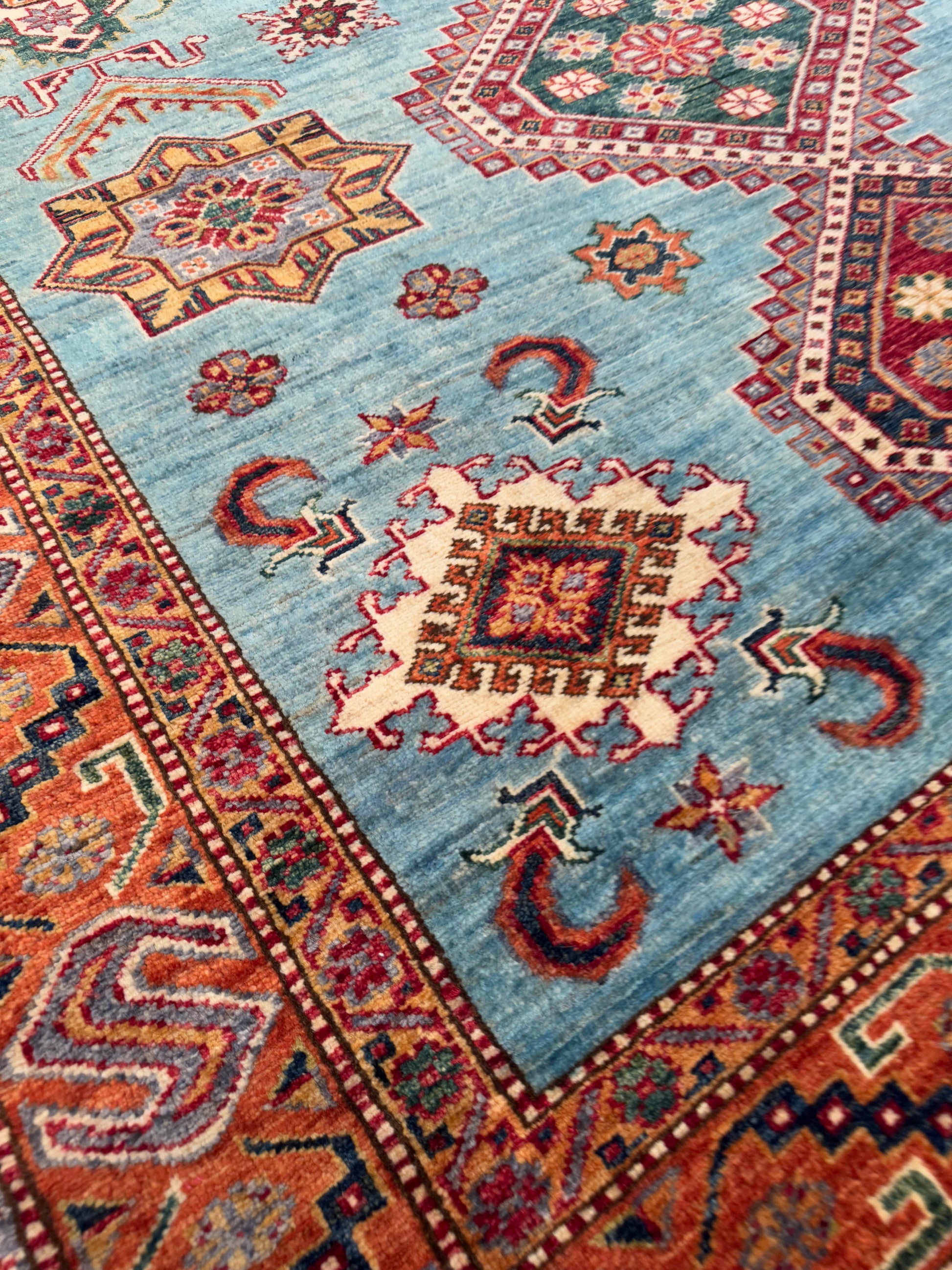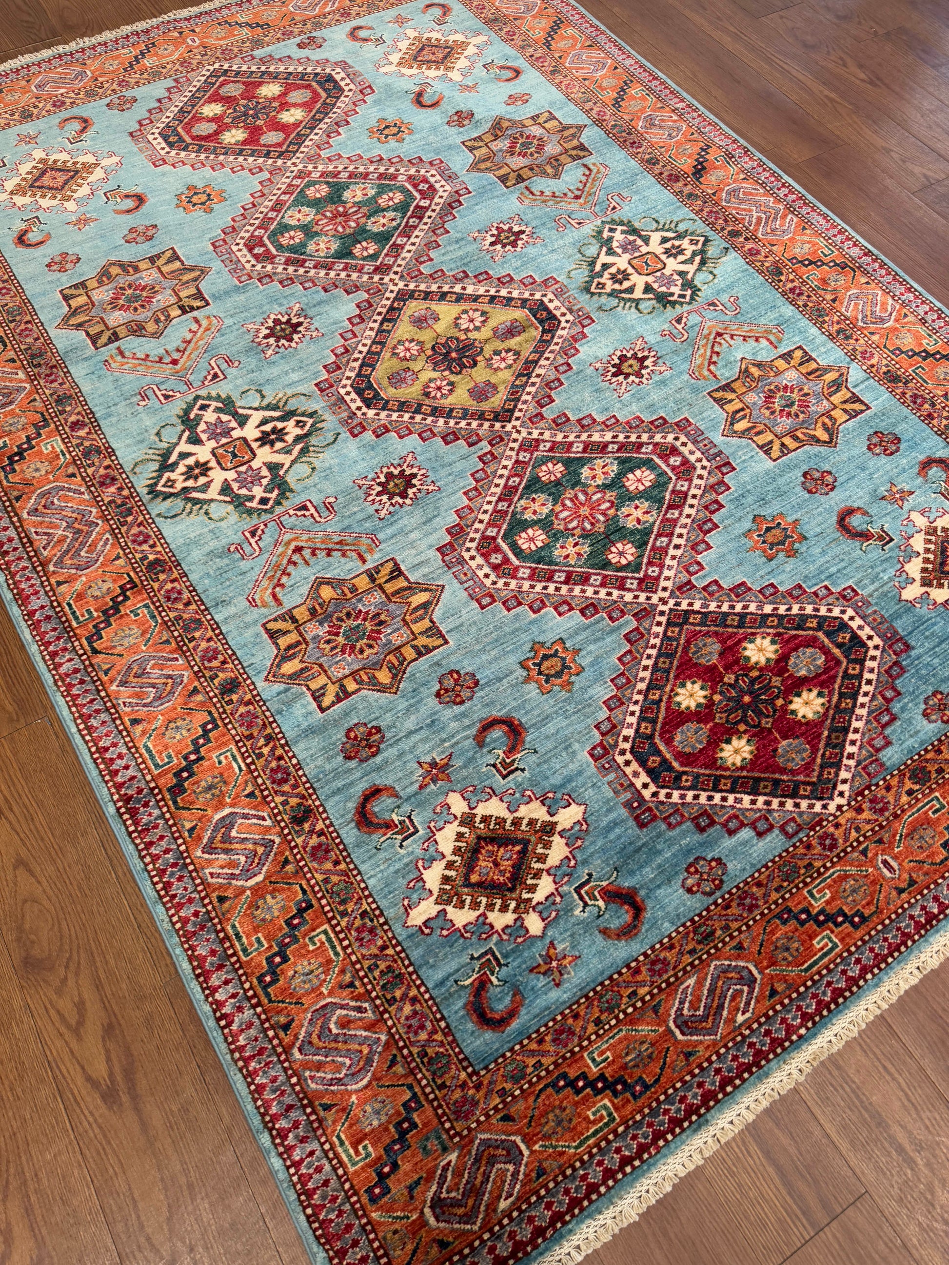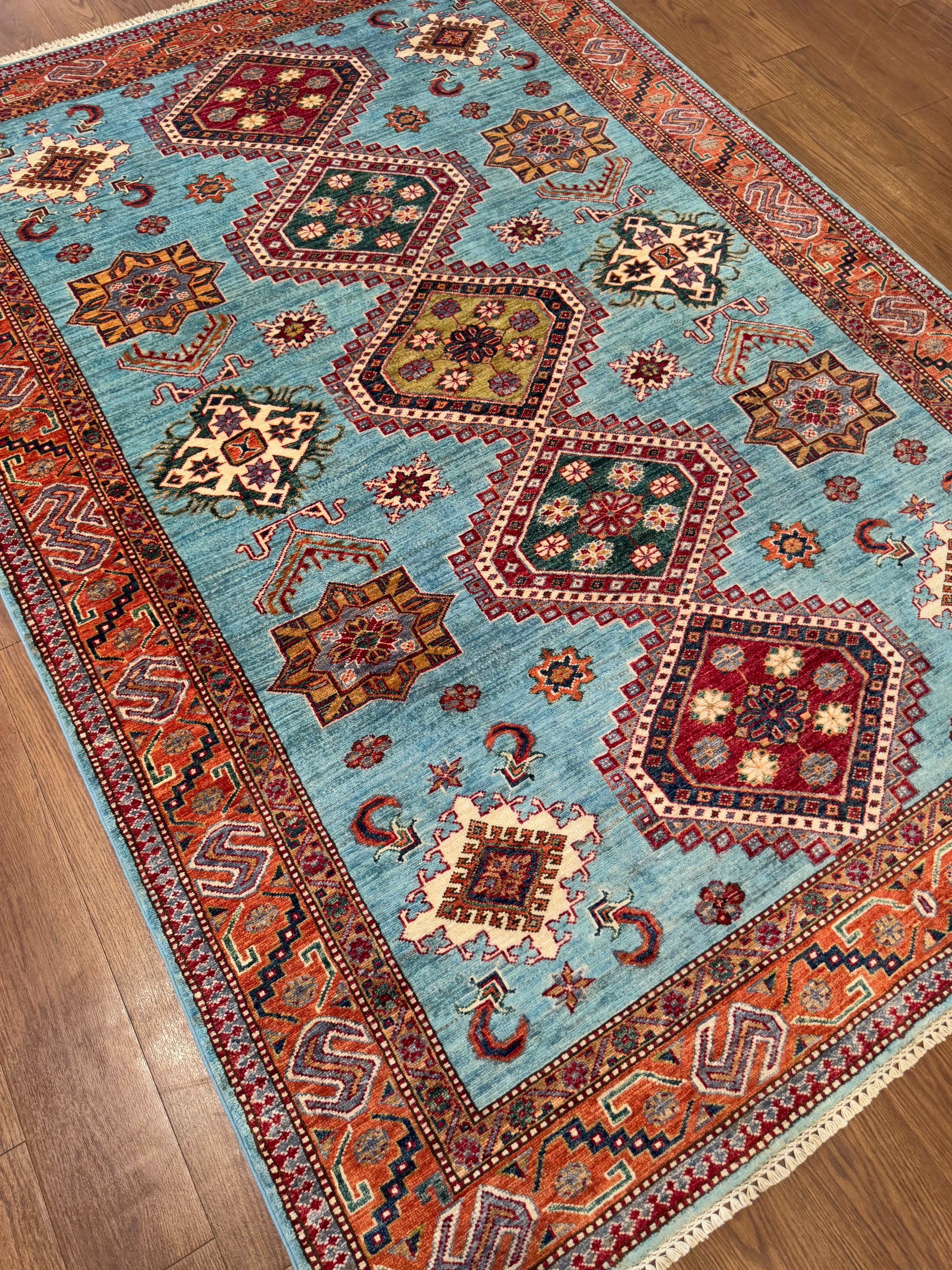 This rug presents a dynamic geometric lattice design with a series of diamond-shaped medallions aligned down the center. The soft blue field contrasts beautifully with the rich reds, golds, and ivory tones of the medallions, each filled with stylized floral rosettes and intricate tribal detailing. The border features bold geometric motifs in terracotta and deep red, adding strength and framing the central pattern with balance. Its combination of sharp geometry and warm, saturated colors captures the essence of tribal artistry.