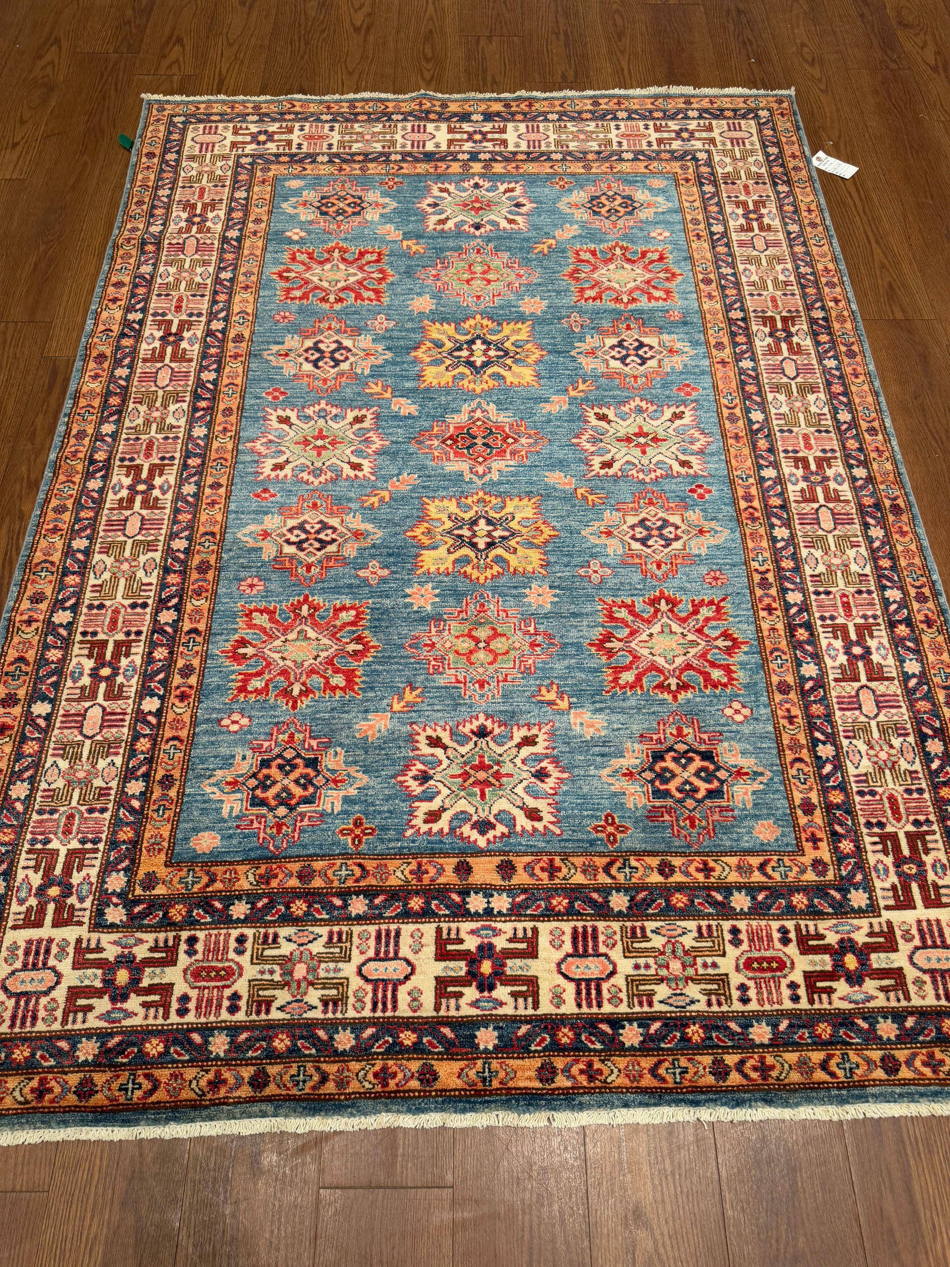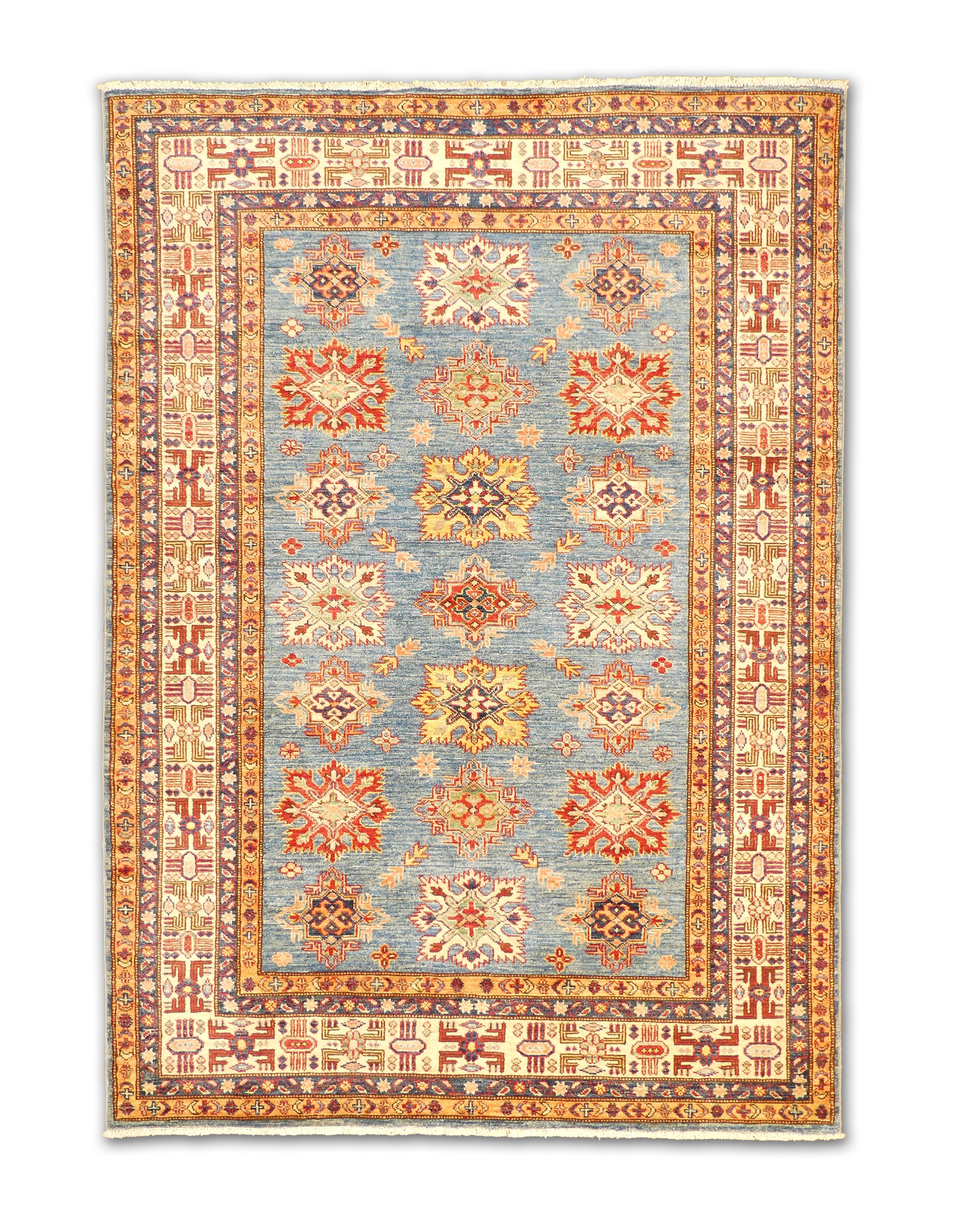 This rug showcases a lively arrangement of starburst medallions scattered across a soft blue field. Each motif radiates with vibrant shades of red, gold, ivory, and navy, giving the piece a striking visual rhythm. The wide ivory border is filled with repeating geometric and tribal symbols, framed by multiple guard stripes in warm terracotta and deep indigo. Its balance of bold central motifs and detailed borders creates a harmonious composition that brings both energy and refinement to any space.