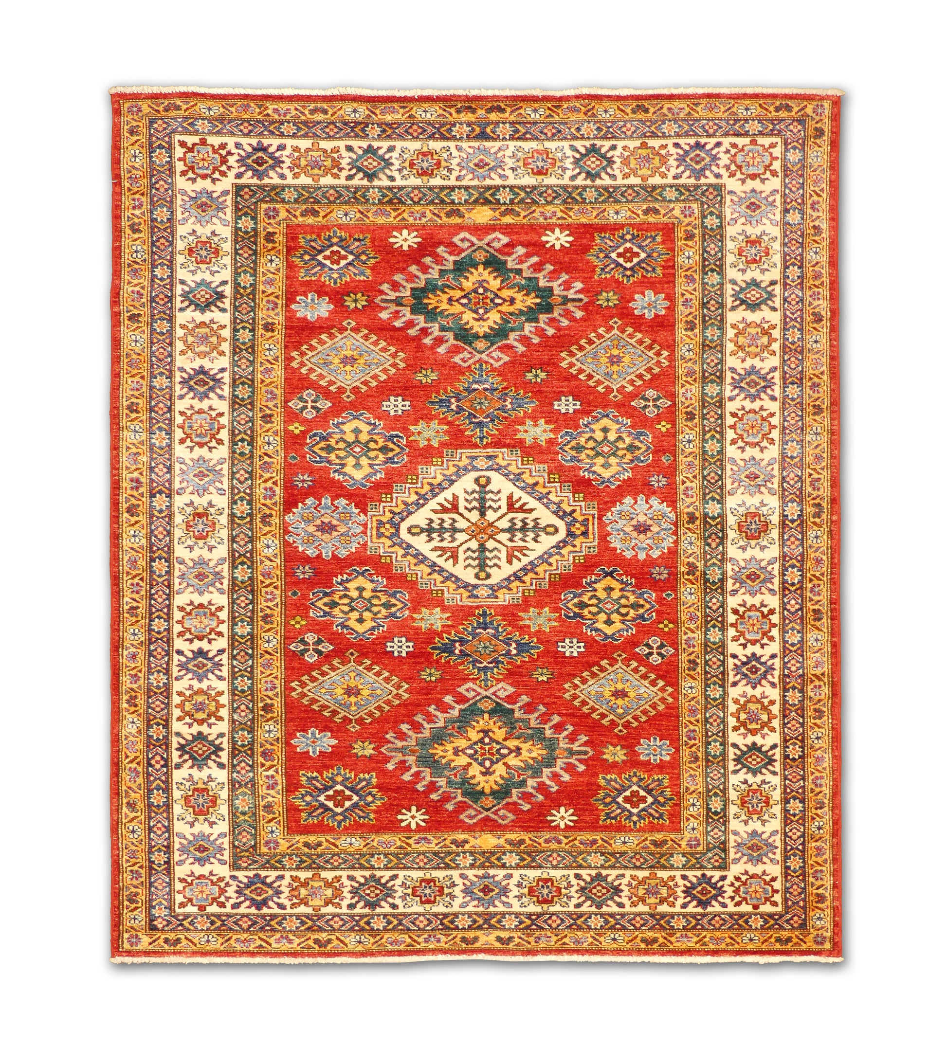 This rug features a bold red field adorned with a central diamond medallion and surrounding star-shaped motifs. Accents of gold, blue, ivory, and green bring depth and variation, while smaller geometric rosettes are scattered throughout the design. The ivory border is filled with alternating floral and tribal symbols framed by layered guard stripes, creating a strong visual balance. Its vivid color palette and classic structure make it both decorative and versatile for a variety of interiors.