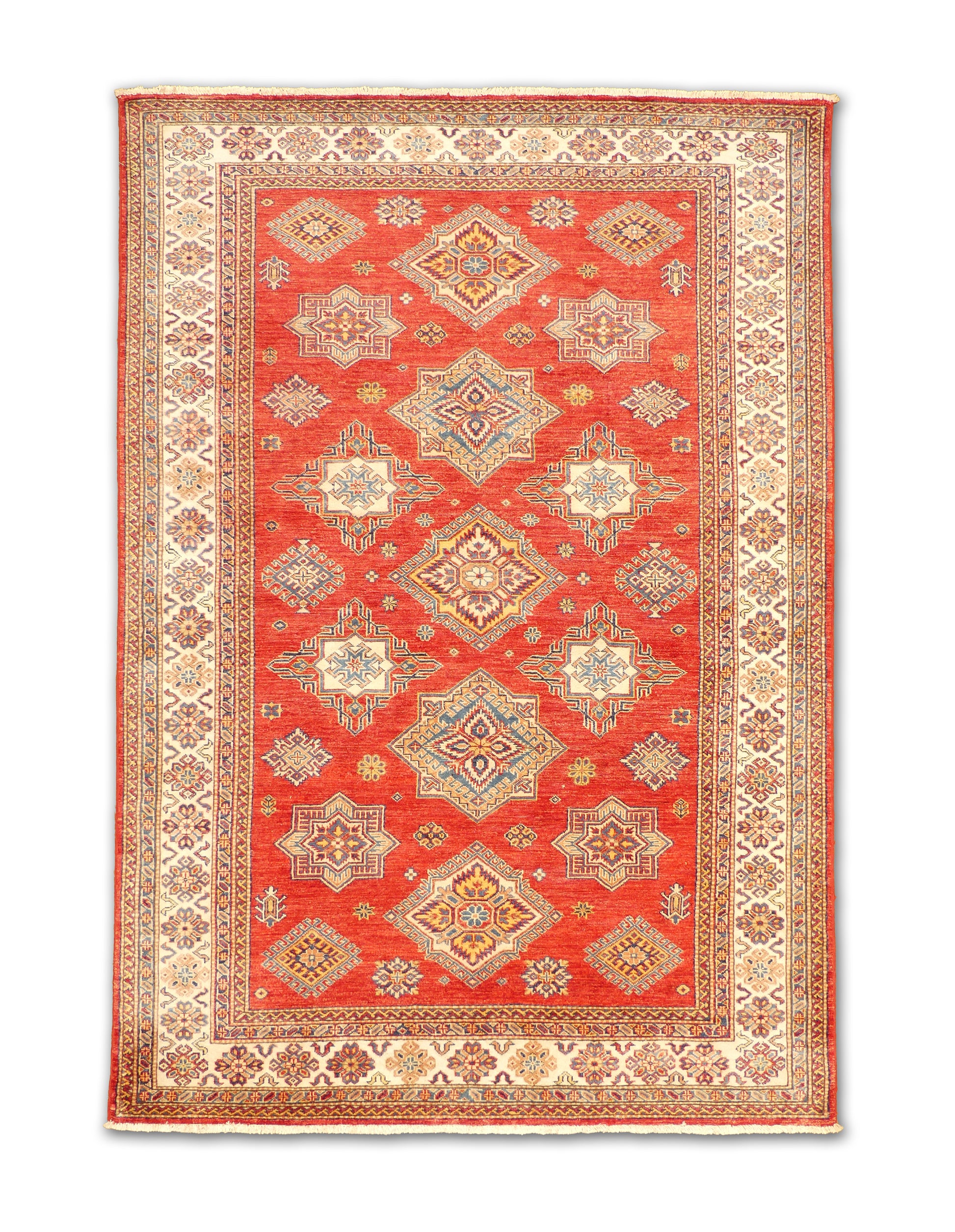 This rug features a brilliant crimson field adorned with a series of diamond-shaped and starburst medallions arranged in a repeating lattice. The medallions are filled with intricate geometric detailing in ivory, navy, and soft turquoise, creating striking visual contrast against the red background. A broad ivory border frames the field with stylized floral and vine motifs, accented by smaller guard stripes that reinforce the symmetry. The combination of bold colors and sharp angular forms captures a sense of both strength and elegance, making this piece a versatile addition to both traditional and eclectic interiors.