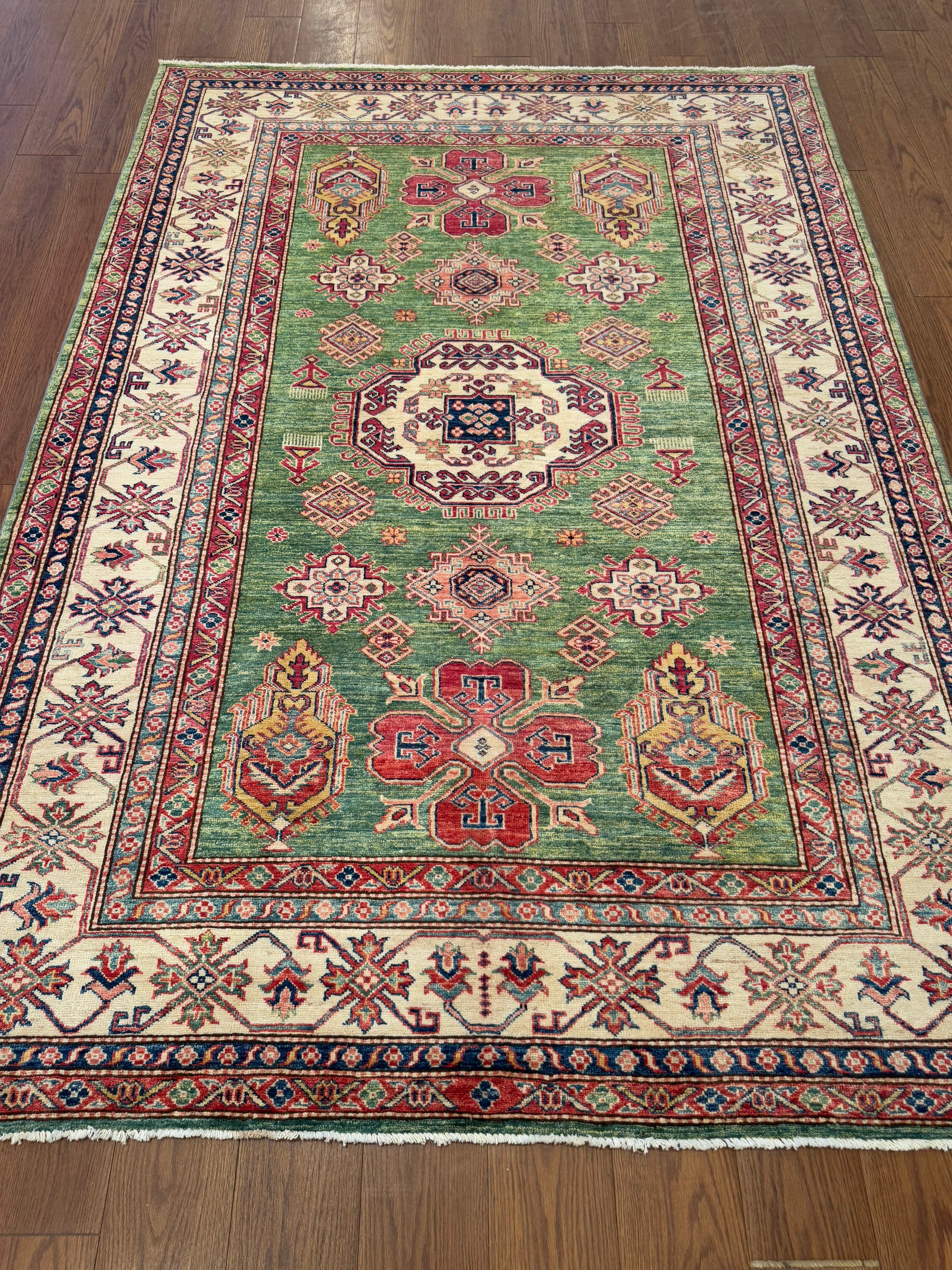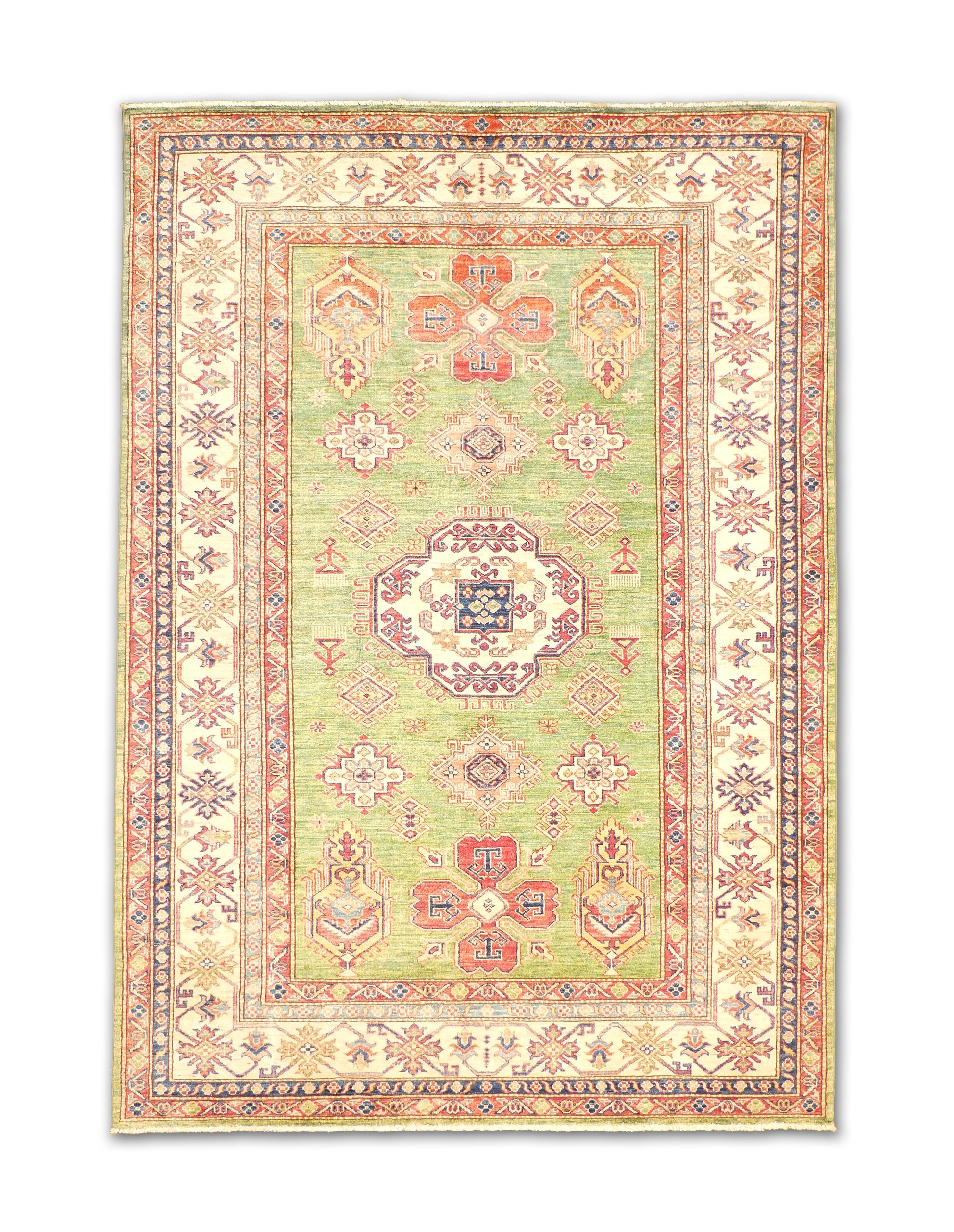 This rug presents a refreshing green field highlighted by bold geometric medallions and tribal motifs. The central ivory and red medallion anchors the design, while surrounding octagonal and floral-inspired shapes create a harmonious rhythm. Elongated boteh-like forms at either end bring movement and balance. The ivory border, adorned with repeating star and vine patterns, provides a crisp frame that enhances the lively colors of the field. Red, blue, and soft gold accents add depth, making this piece a vibrant expression of Caucasian-inspired artistry.