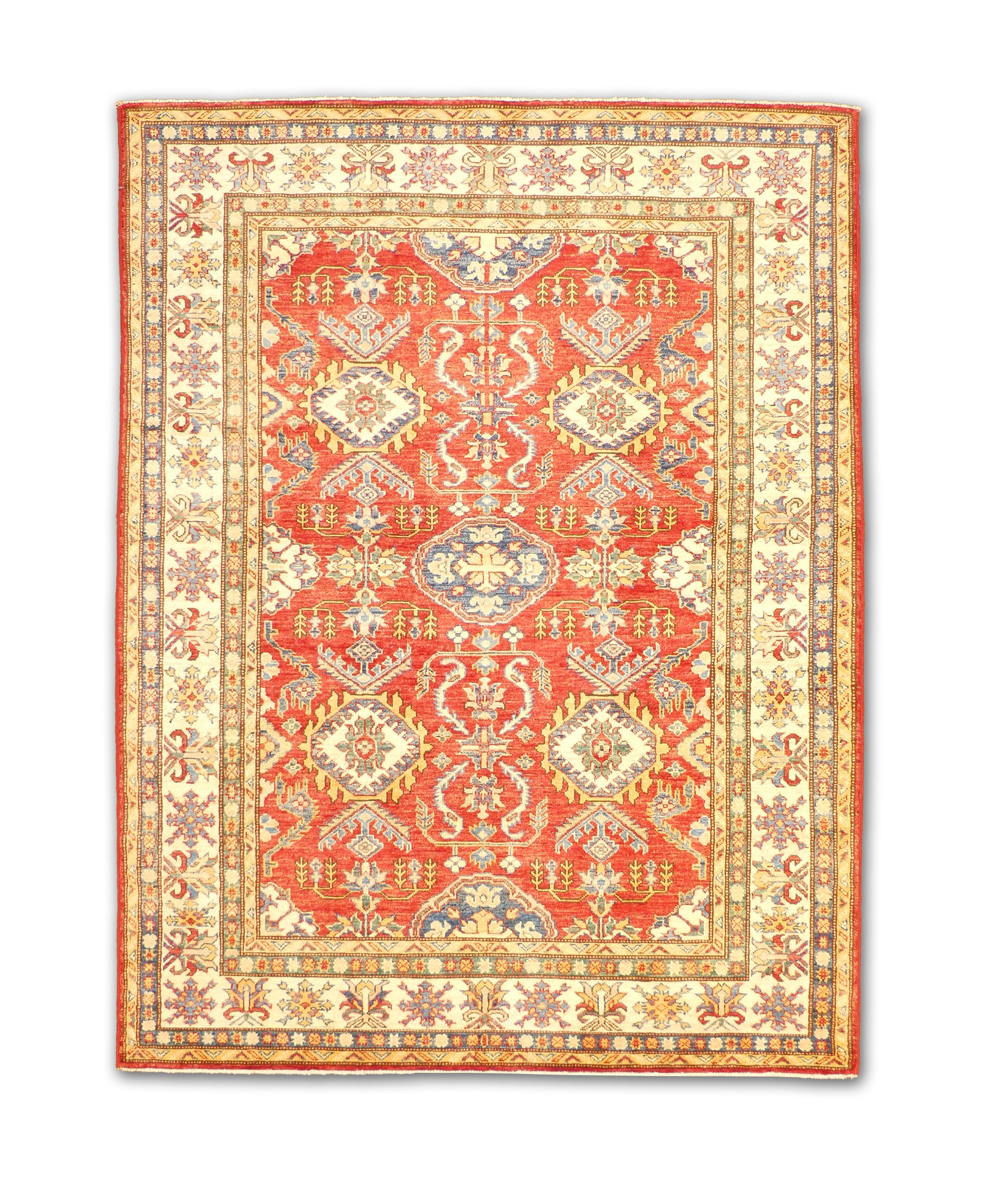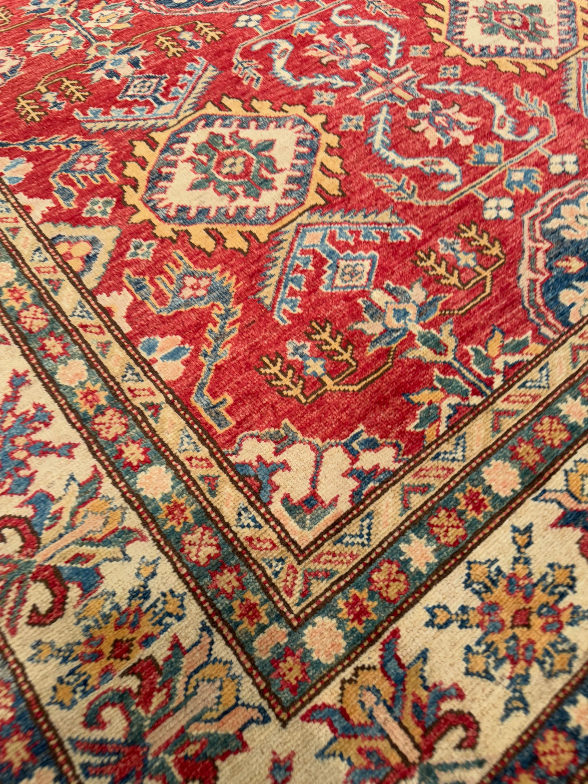 This rug displays a bold red field enriched with an array of geometric medallions and stylized botanical elements. Repeated diamond motifs run vertically through the center, connected by vine-like tendrils that evoke movement and growth. The deep blue, ivory, and gold accents create striking contrast against the vibrant red ground. An ivory border, filled with floral rosettes and angular vine motifs, frames the composition with balance and refinement. The overall effect blends tribal strength with delicate ornamentation, making this piece versatile for both traditional and eclectic interiors.