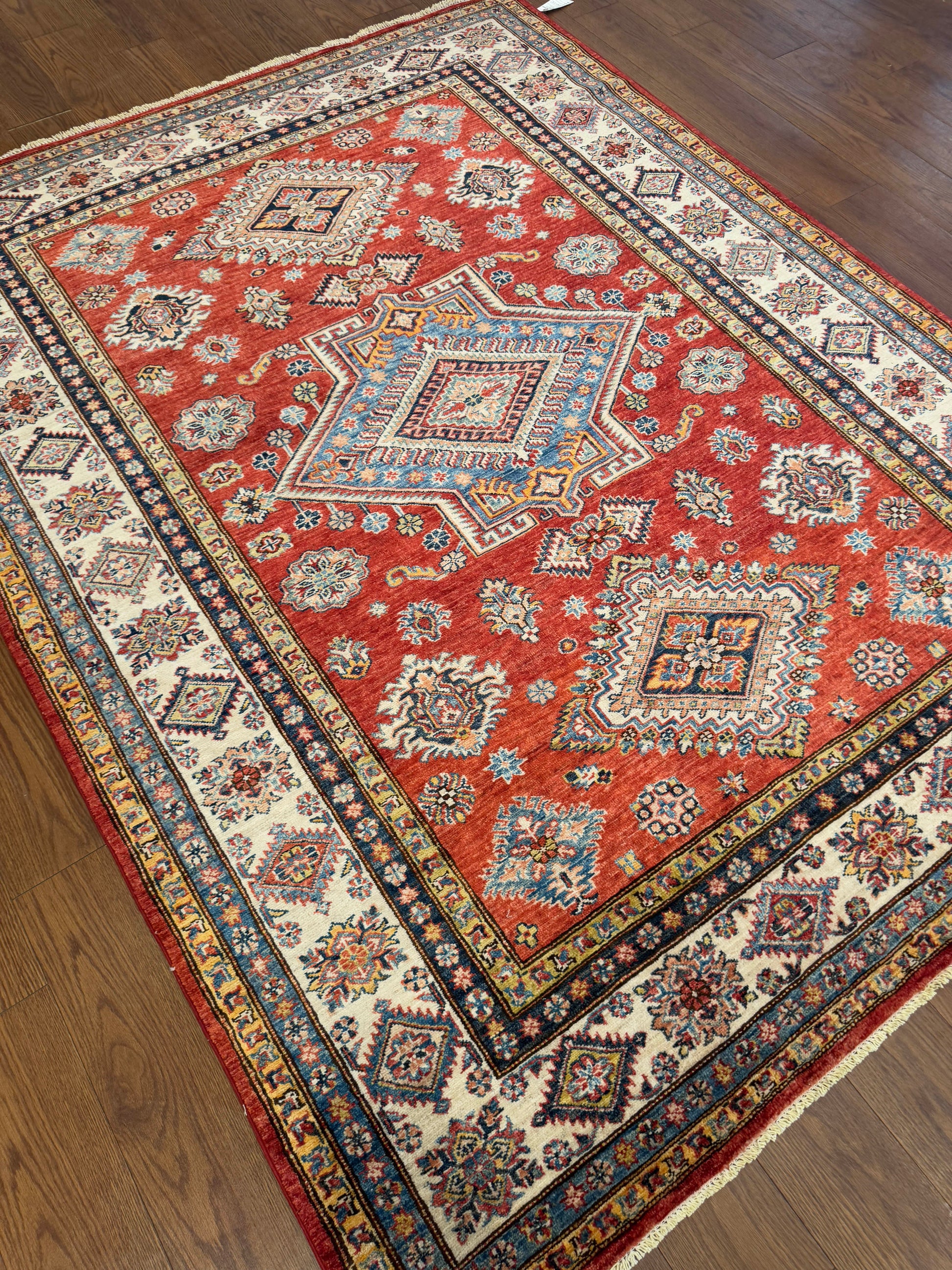This rug showcases a bold geometric composition with a terracotta-red field and large diamond-shaped medallions running vertically through the center. Each medallion is finely detailed with stepped outlines, hooked motifs, and smaller nested diamonds, highlighted in shades of blue, ivory, and gold. The surrounding field is dotted with stylized floral rosettes and boteh-like motifs, softening the strong geometry with organic rhythm. Wide ivory borders, adorned with diamond rosettes and intricate secondary guard stripes, frame the composition with balance and harmony. The interplay of strong tribal geometry and floral detailing gives the piece both power and refinement.