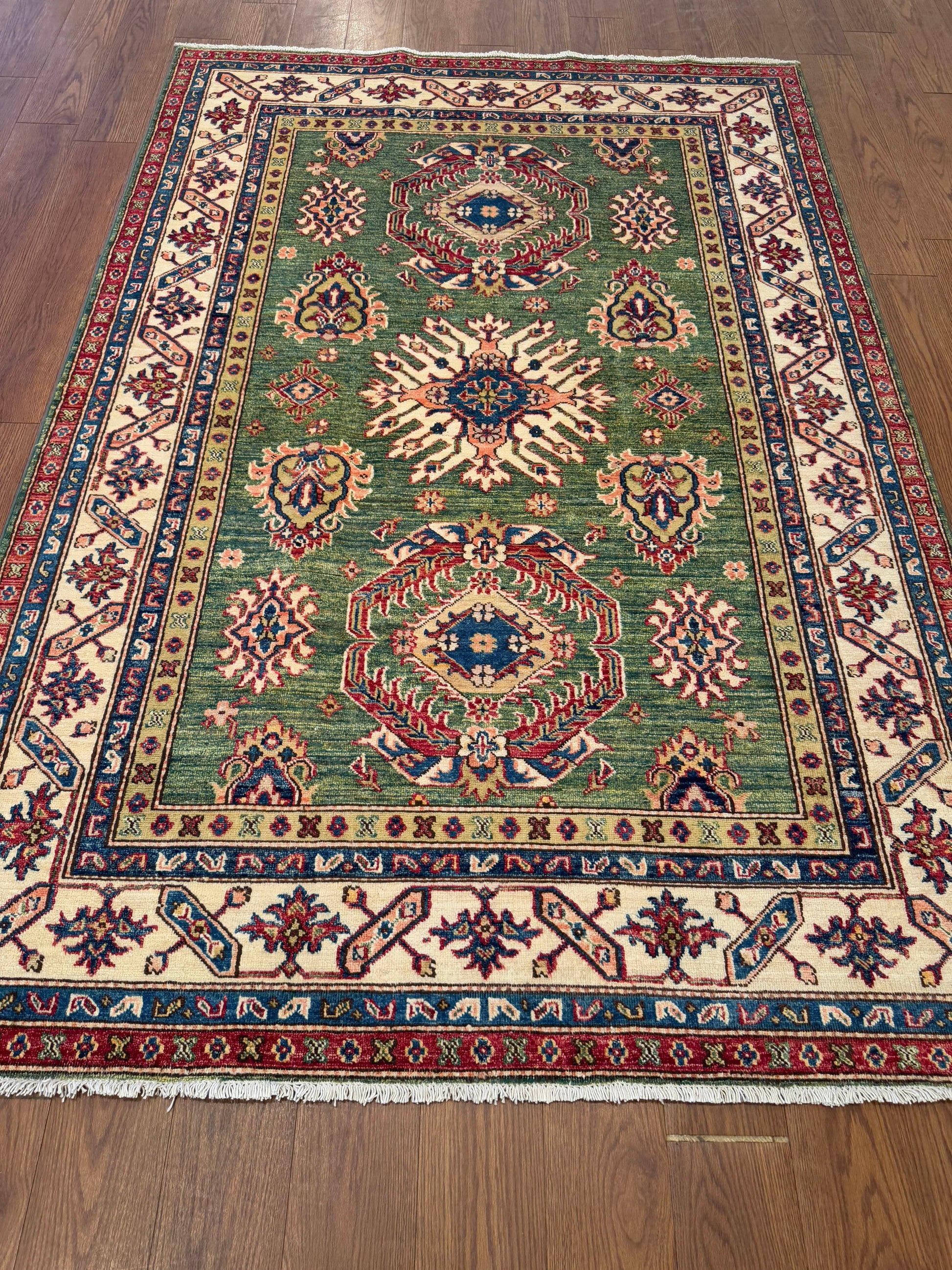 This rug features a vivid green field with a striking series of large, stylized floral medallions arranged vertically along the center. Each medallion combines bold geometric outlines with petal-like extensions in ivory, red, and blue, creating a strong tribal rhythm. Smaller boteh and floral rosettes are scattered throughout the field, adding intricacy without overwhelming the main design. The ivory border is richly decorated with alternating angular rosettes and geometric vine motifs, framed by narrow guard stripes in red and blue. The interplay of its rich green ground with jewel-tone highlights gives this piece both freshness and timeless character.