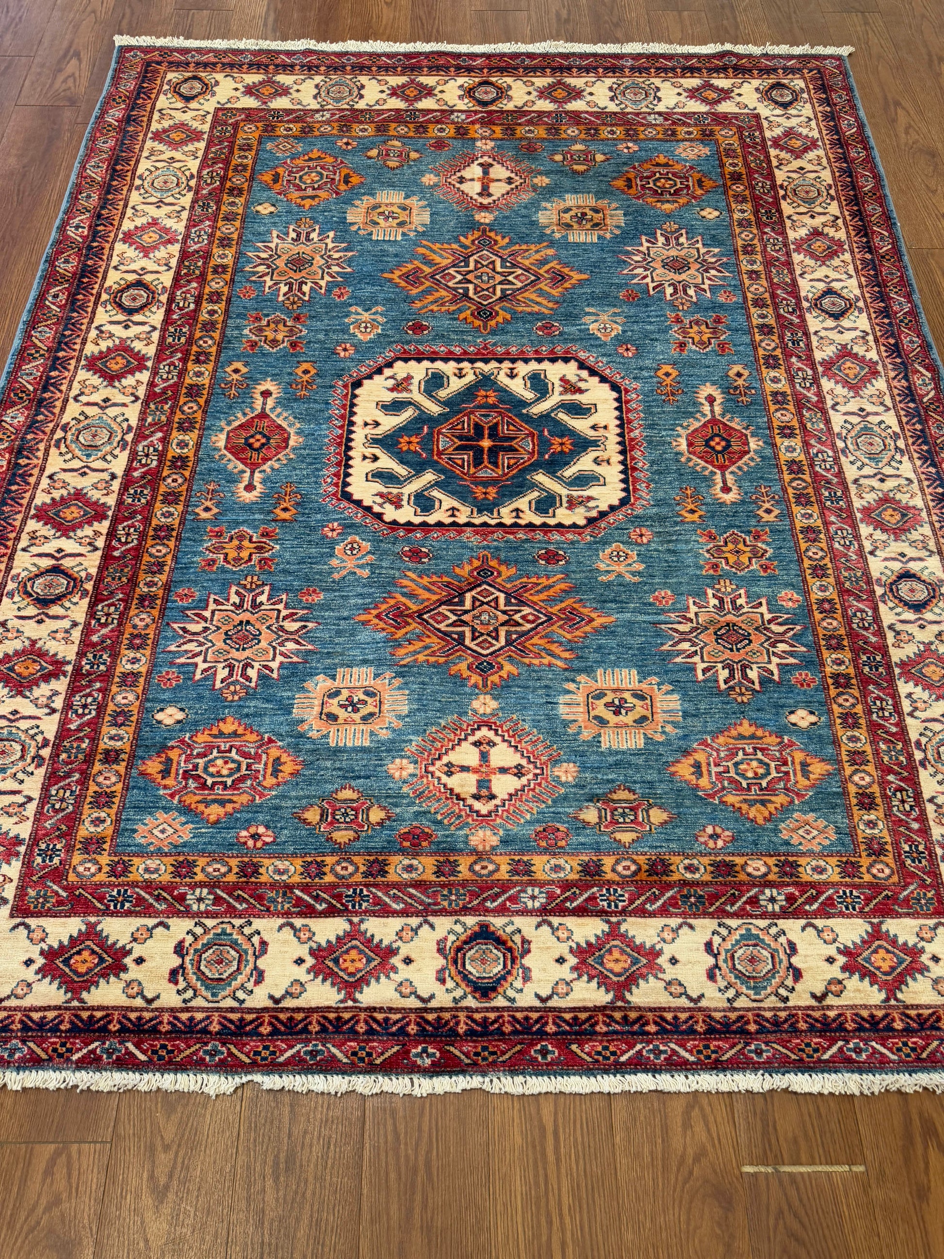 This handwoven rug showcases a bold central medallion framed by smaller diamond motifs and layered floral accents. The light blue field contrasts beautifully with the ivory and crimson border, while golden tones add warmth and balance. Its striking symmetry and fine details make it an elegant centerpiece for any room. The craftsmanship highlights both durability and artistry, ensuring it will remain a timeless addition to your home.