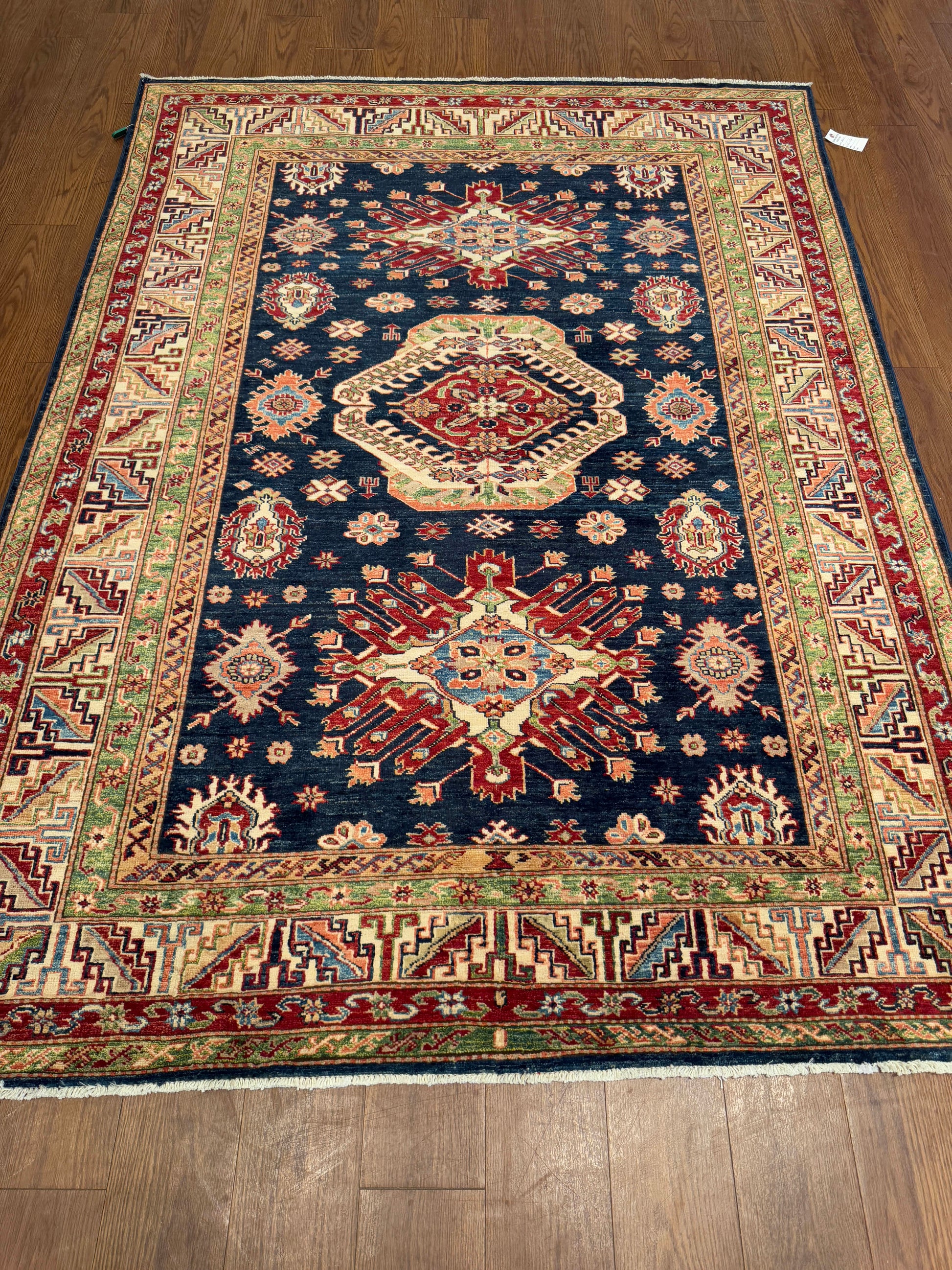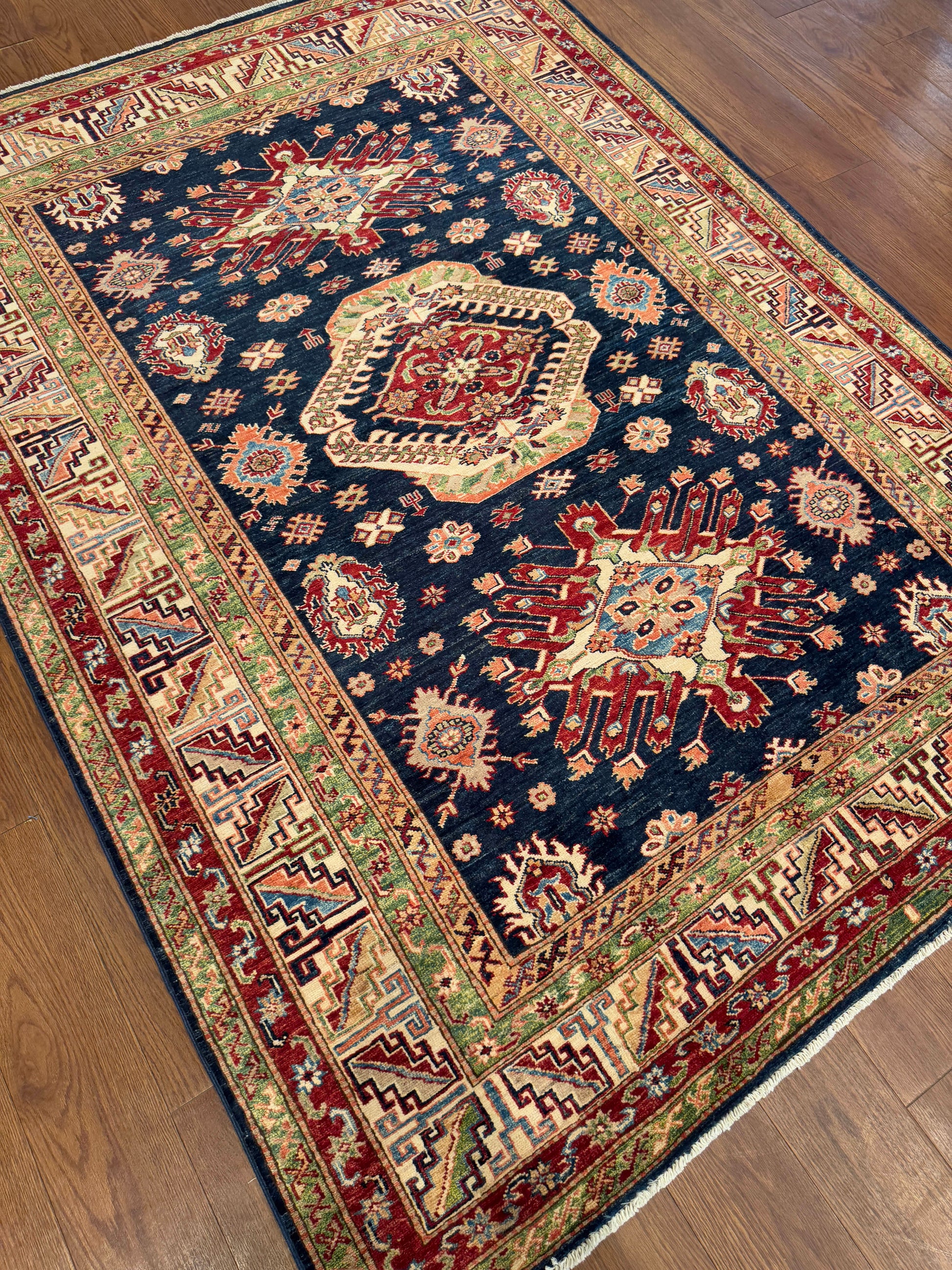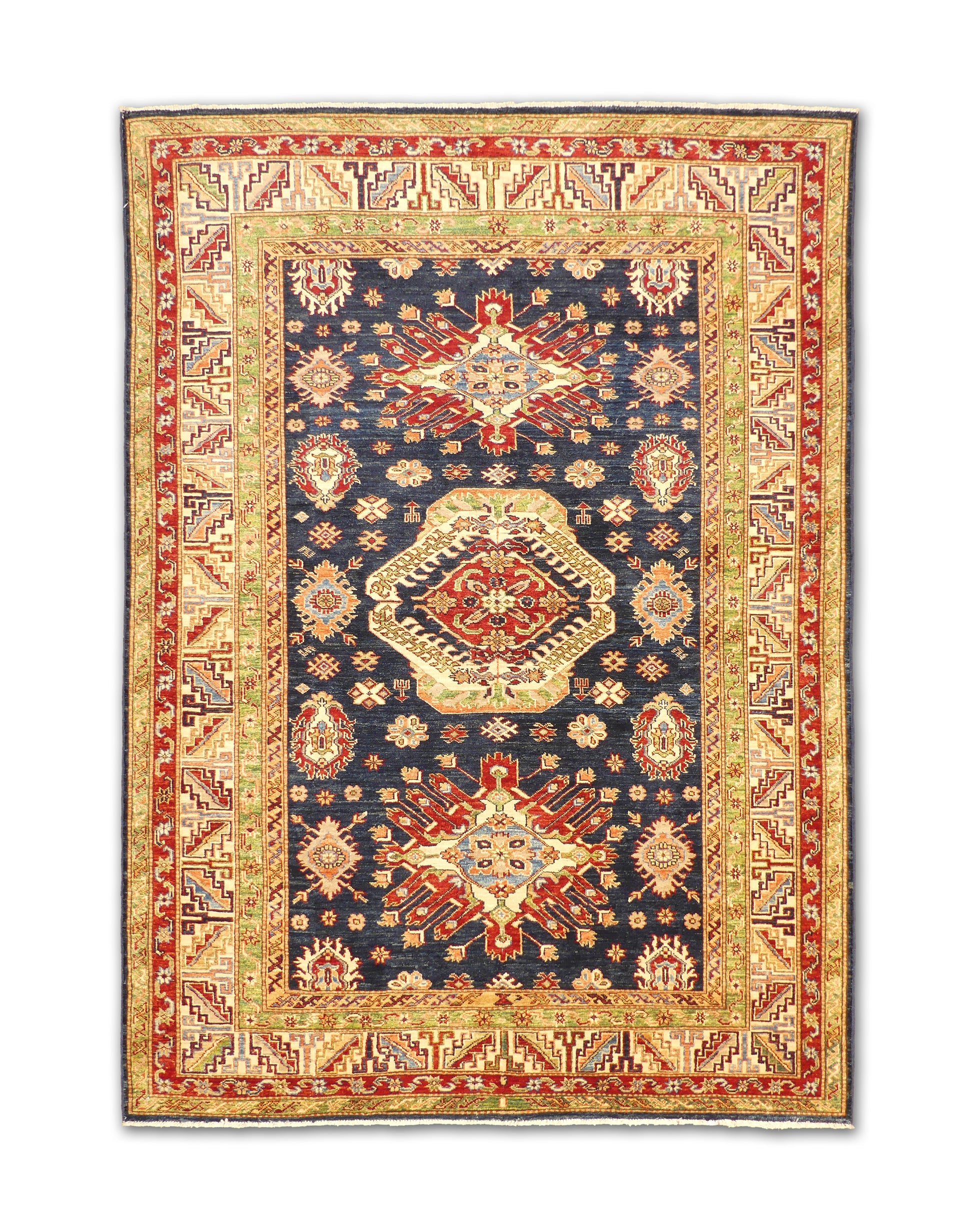 This handwoven rug showcases a striking navy field adorned with bold geometric medallions and floral-inspired motifs. Accents of crimson, ivory, and soft green create a rich contrast, while the intricate borders add depth and harmony to the overall composition. The balance of strong geometry and refined detailing gives this piece a timeless elegance. Its durable wool weave ensures not only beauty but also long-lasting use, making it ideal for both everyday living and more formal spaces.
