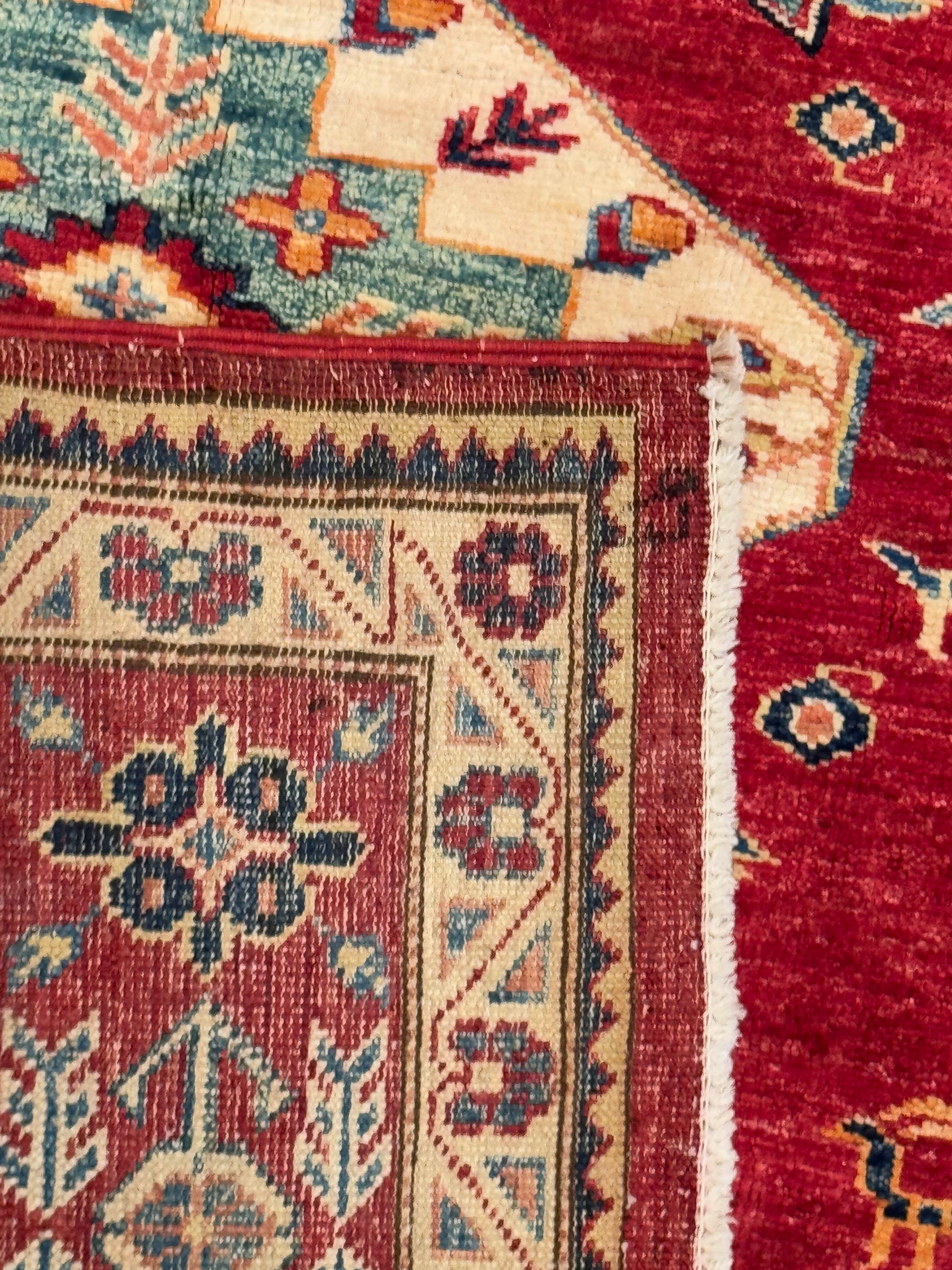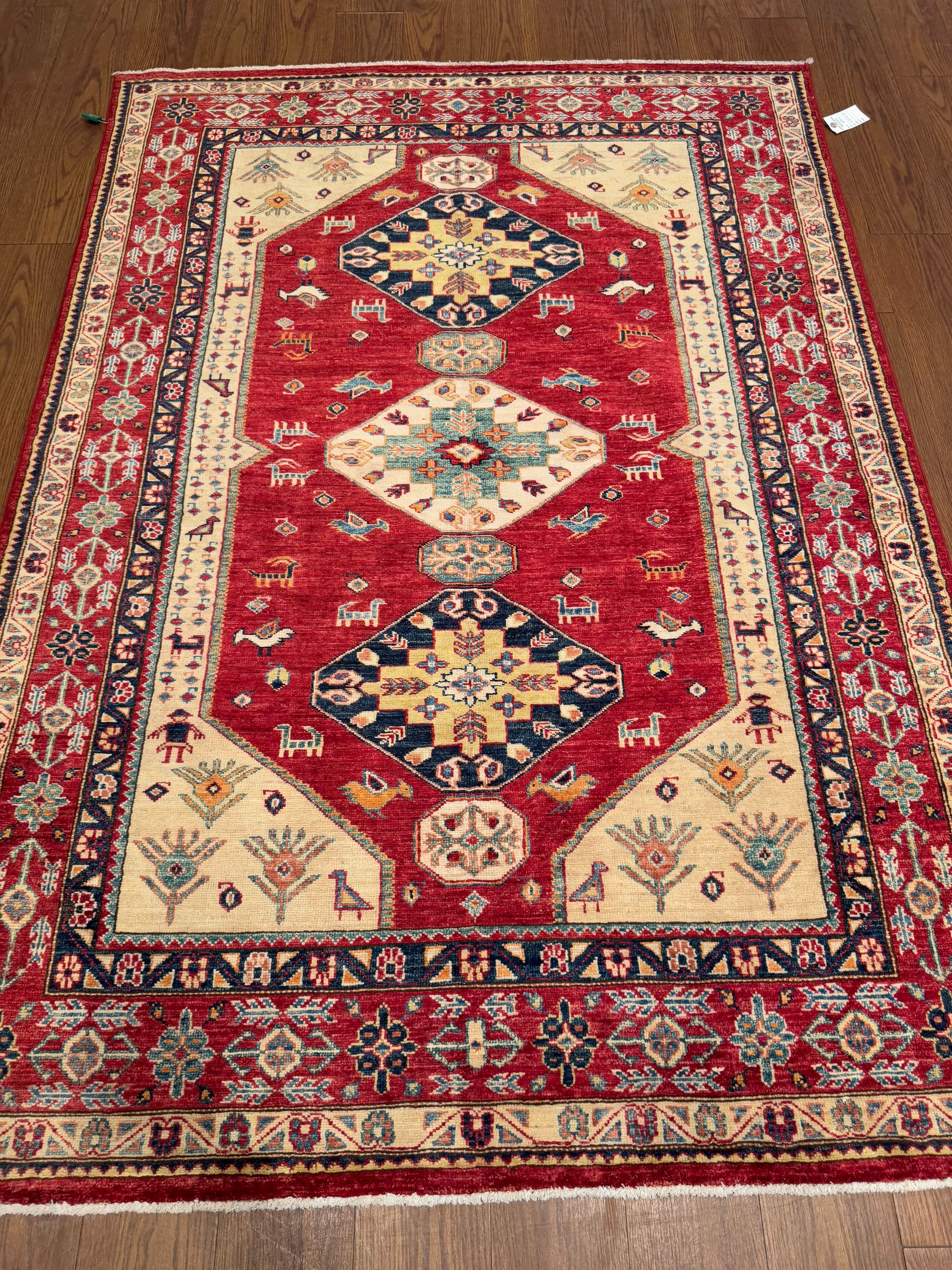 This rug presents a striking red field anchored by a series of elongated hexagonal medallions in shades of ivory, navy, and teal. Surrounding the medallions are playful woven motifs depicting animals, birds, and small figures, adding charm and character to the design. The ivory corner spandrels and detailed floral-and-geometrics in the borders bring a sense of depth and artistry. Its lively composition makes it not only a floor covering but also a conversation piece for any room.