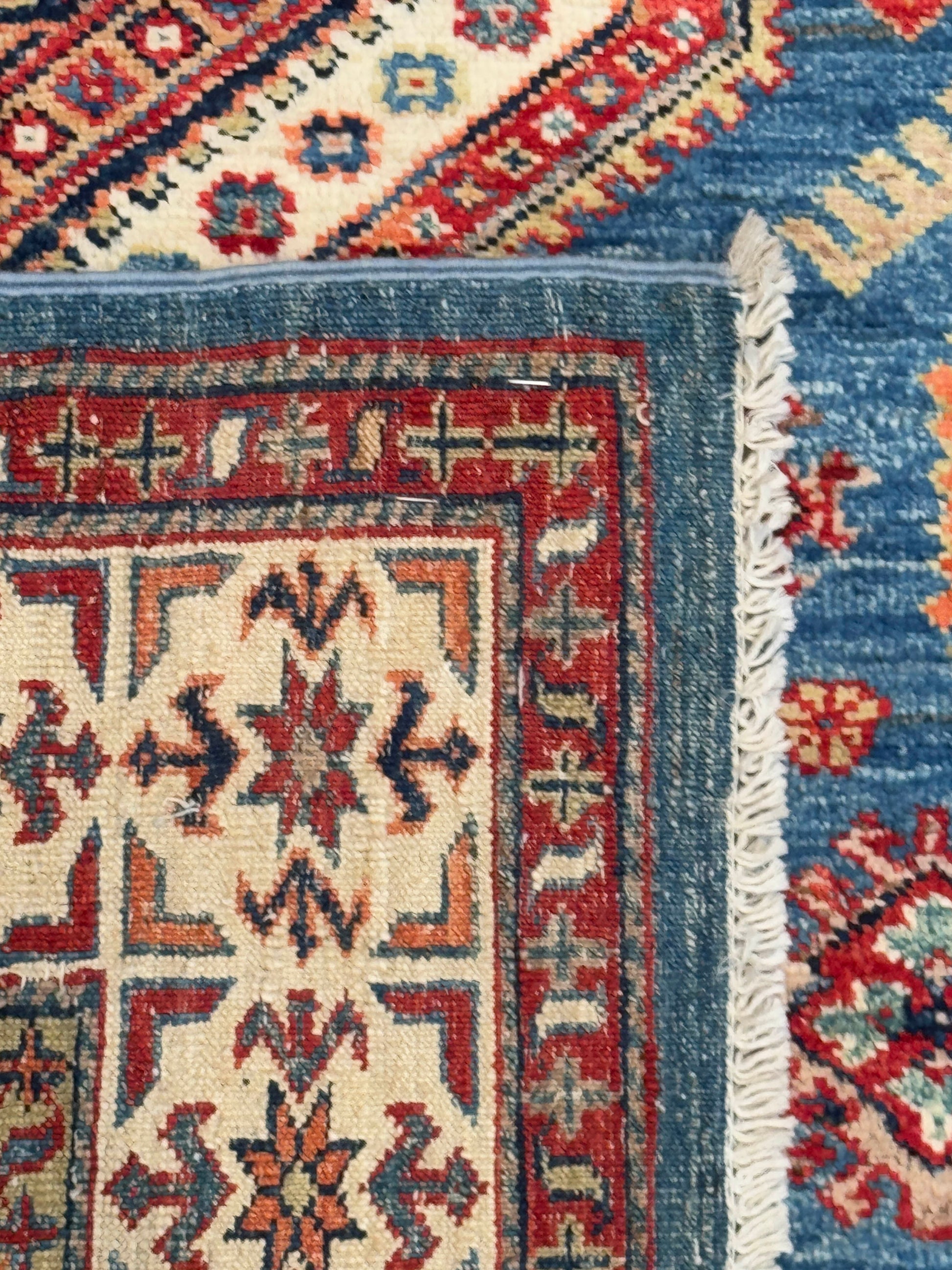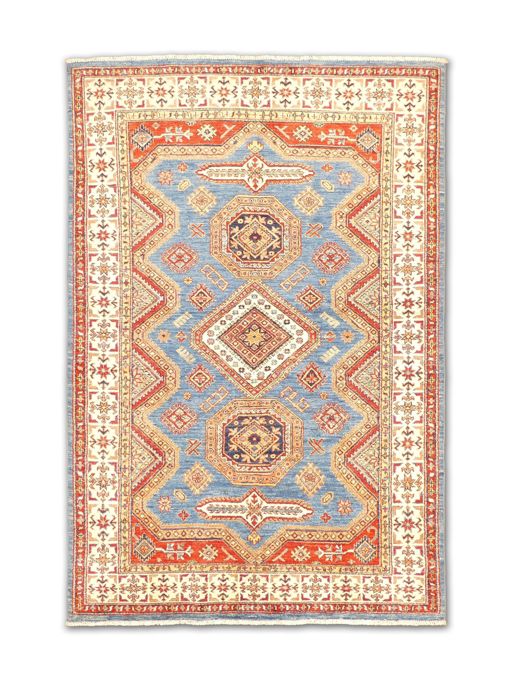 This vibrant handwoven rug features a bold blue field highlighted by striking hexagonal medallions in shades of red, ivory, and gold. The geometric motifs are accented with star and cross-like patterns, lending depth and movement to the design. Surrounded by ivory borders adorned with repeating floral and angular elements, the rug achieves a perfect balance of tradition and artistry. Its strong contrast and symmetry make it a captivating statement piece for any interior.
