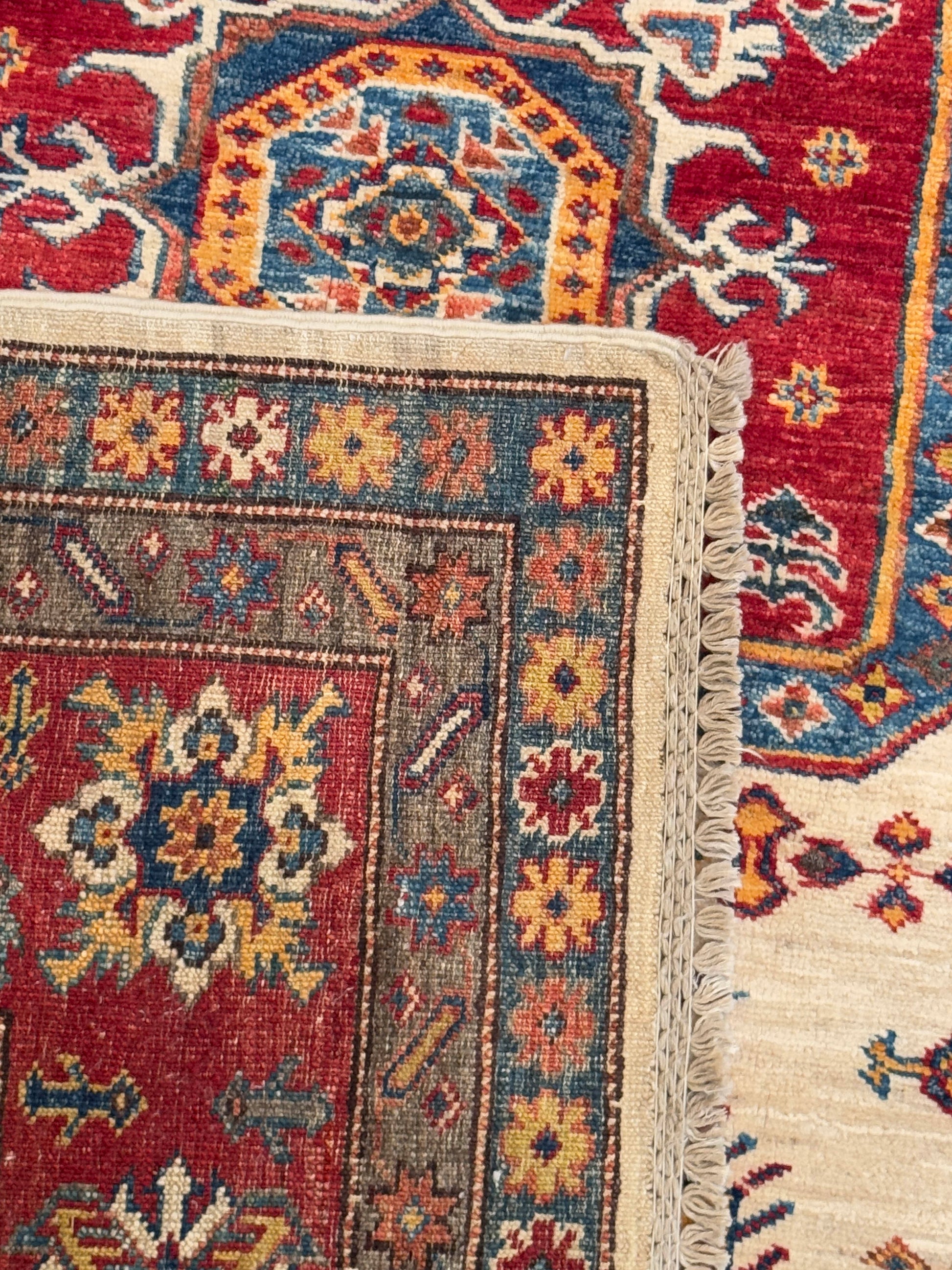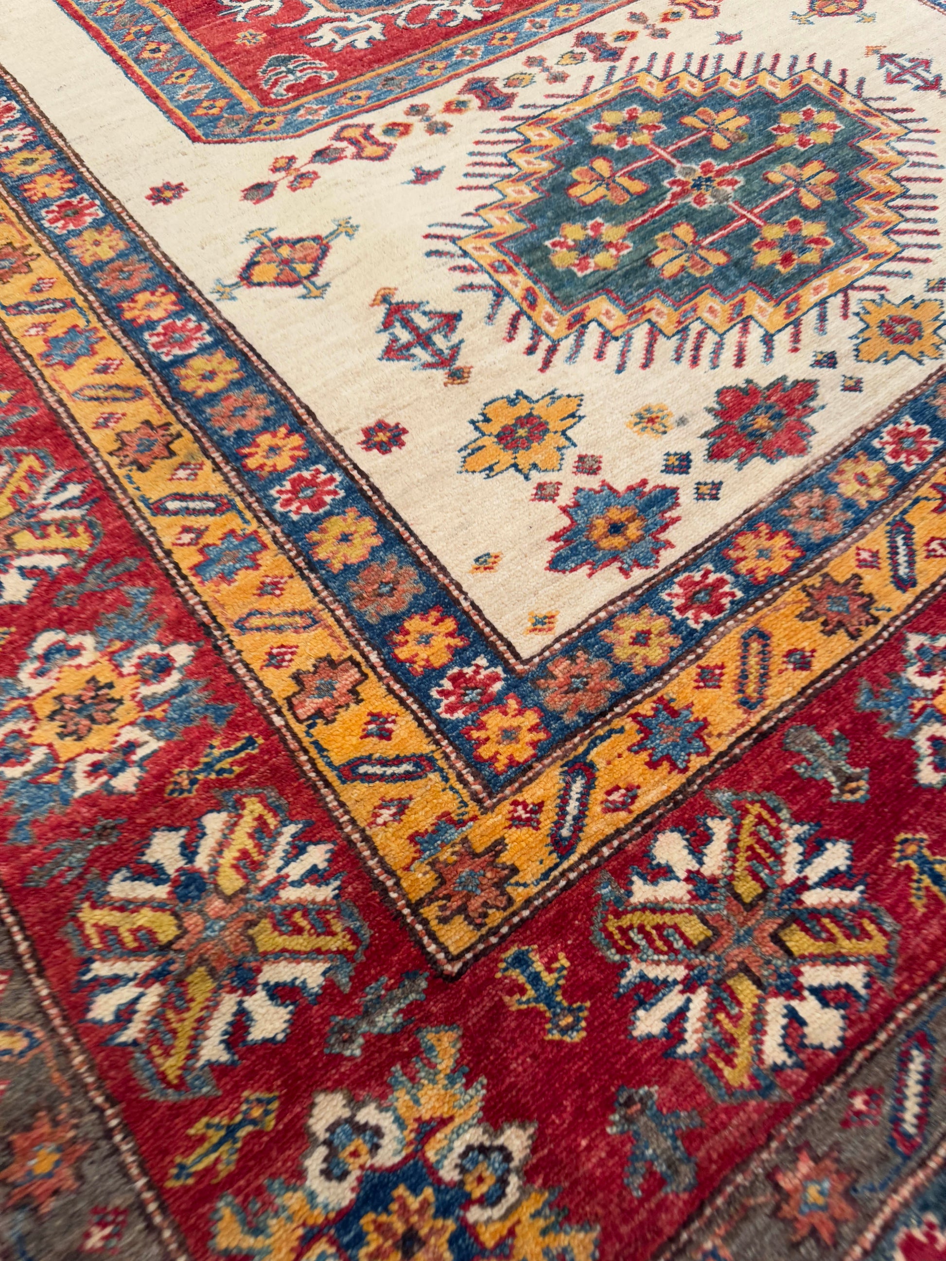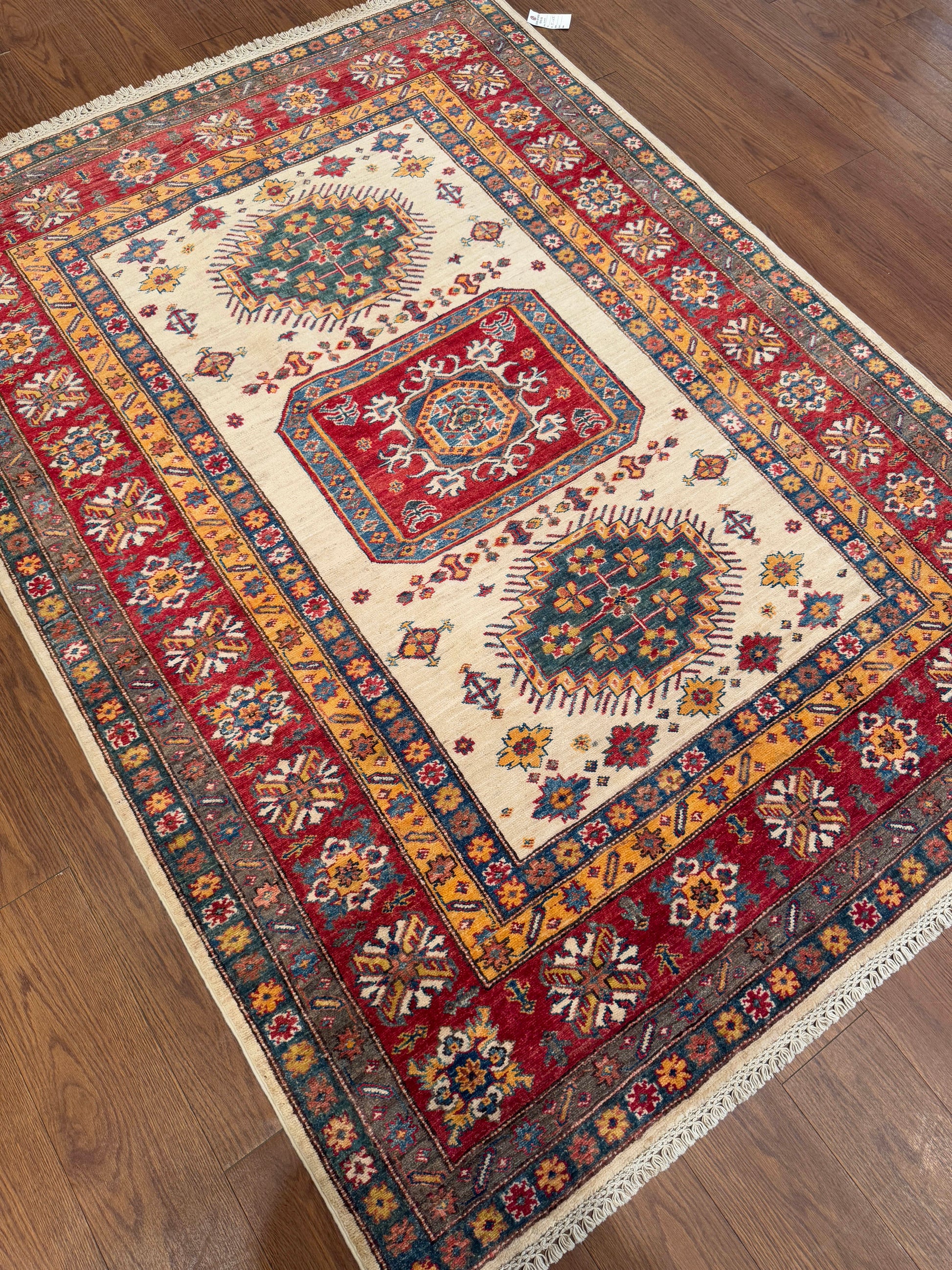 This handmade rug showcases three bold medallions set against a warm ivory field, framed by a vibrant red and gold border. Intricate floral and geometric motifs add depth and balance, highlighting the artistry of its traditional design. With its striking palette of red, ivory, green, blue, and gold, this rug is both elegant and versatile, perfect for brightening any room.