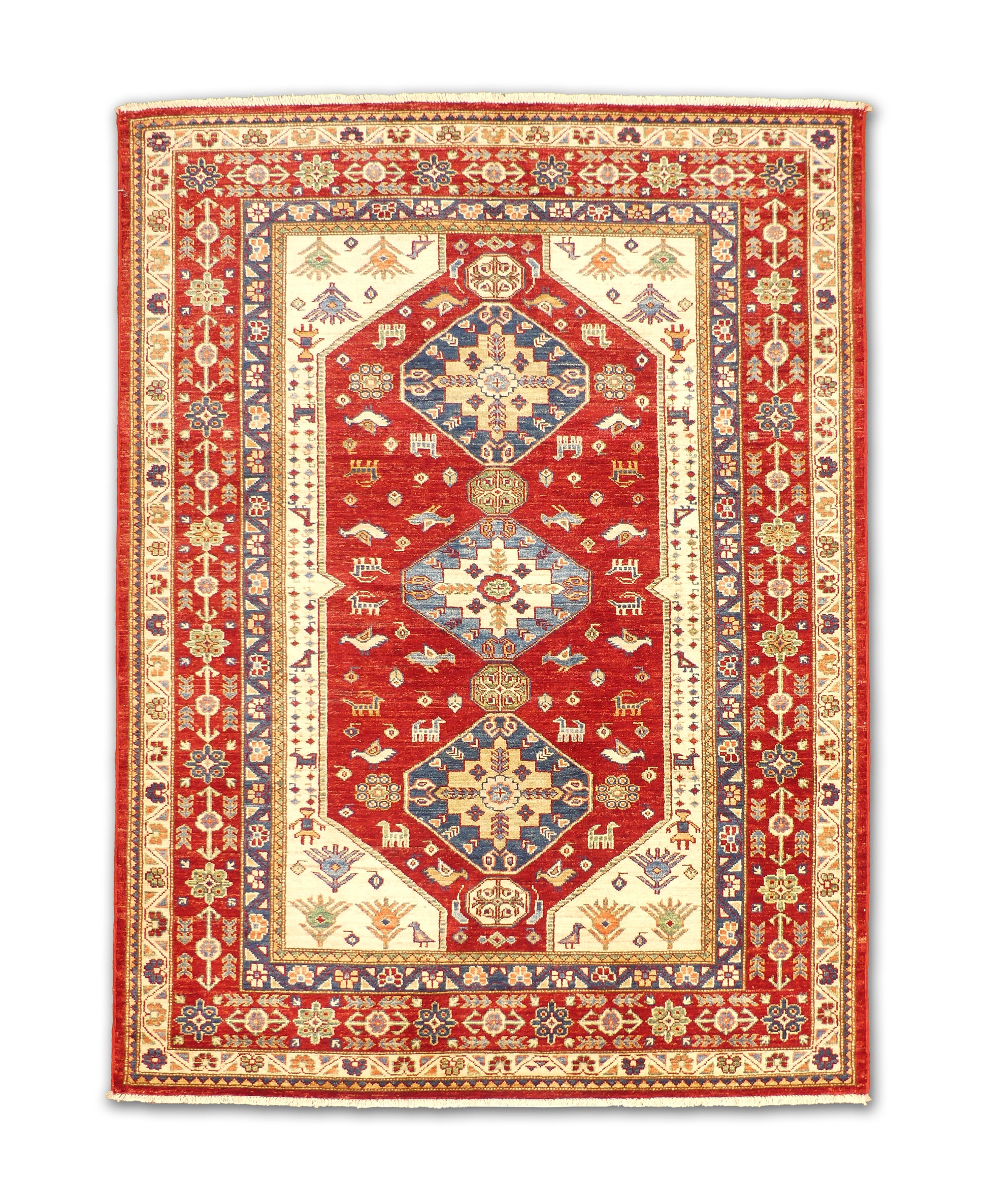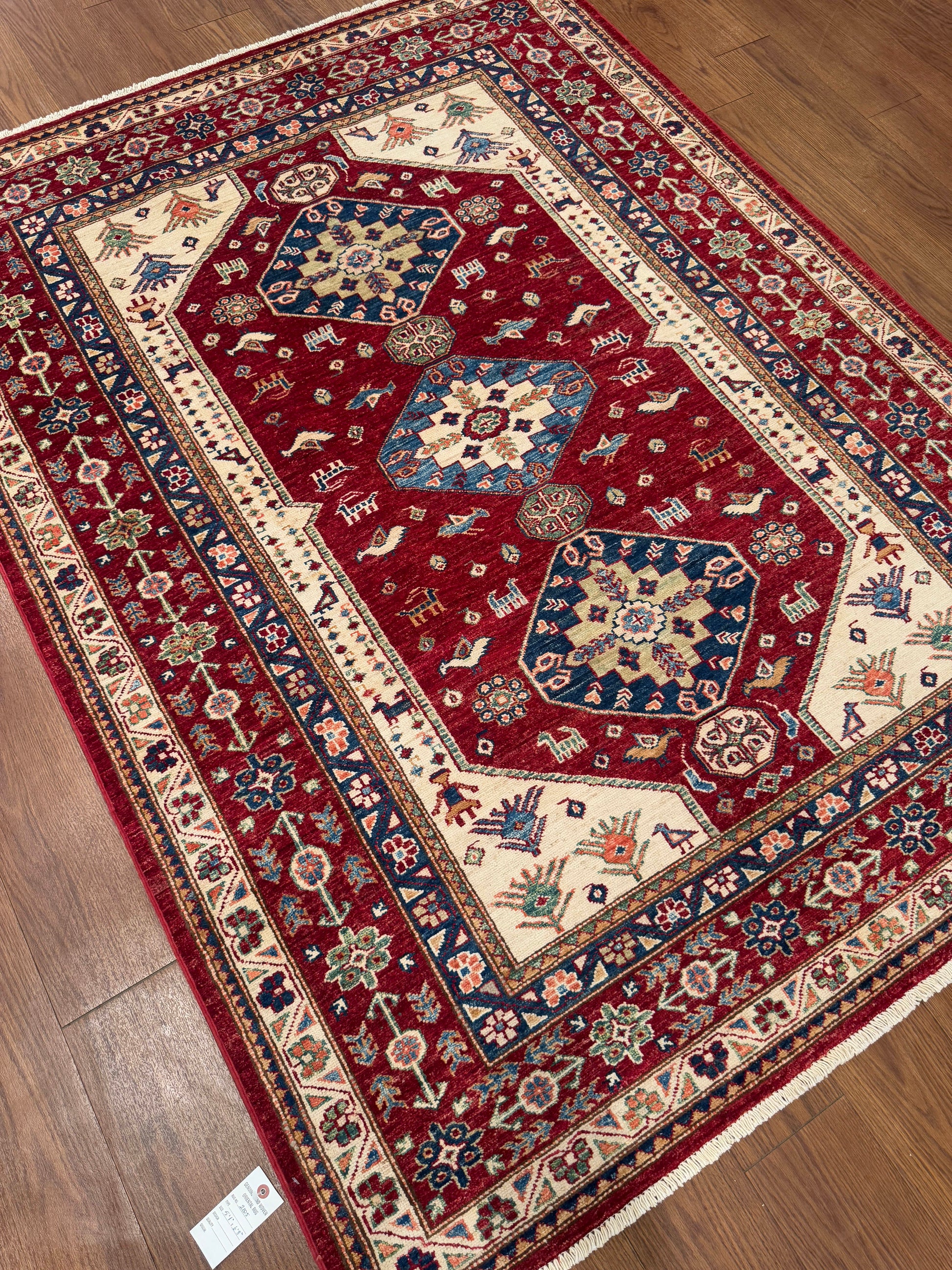 This handwoven rug features a striking red field adorned with multiple hexagonal medallions, surrounded by detailed motifs of animals, birds, and geometric accents. The ivory corners and intricate border add balance and depth, showcasing traditional craftsmanship with vibrant contrasts. Its design brings both cultural richness and timeless appeal to any setting.