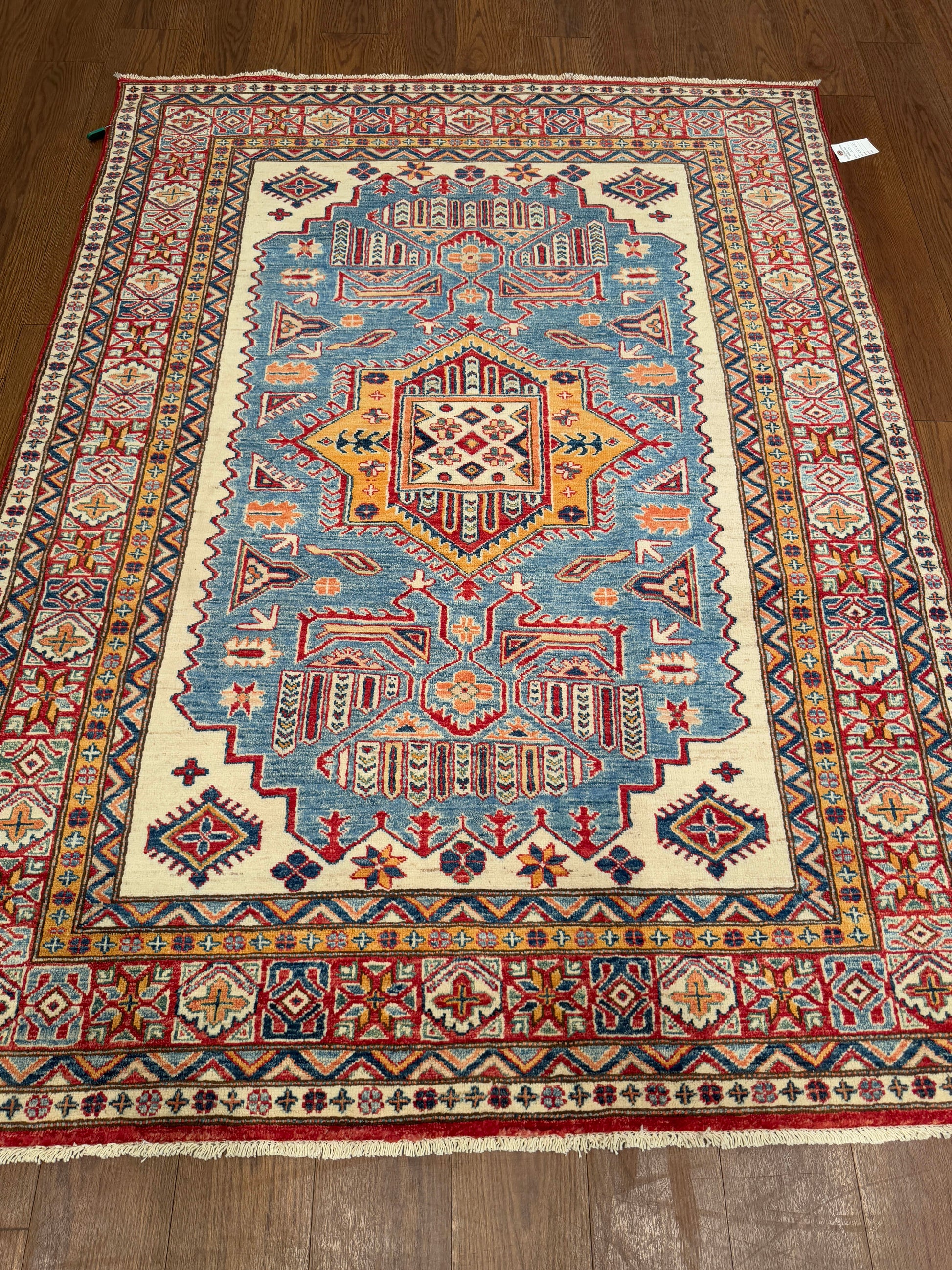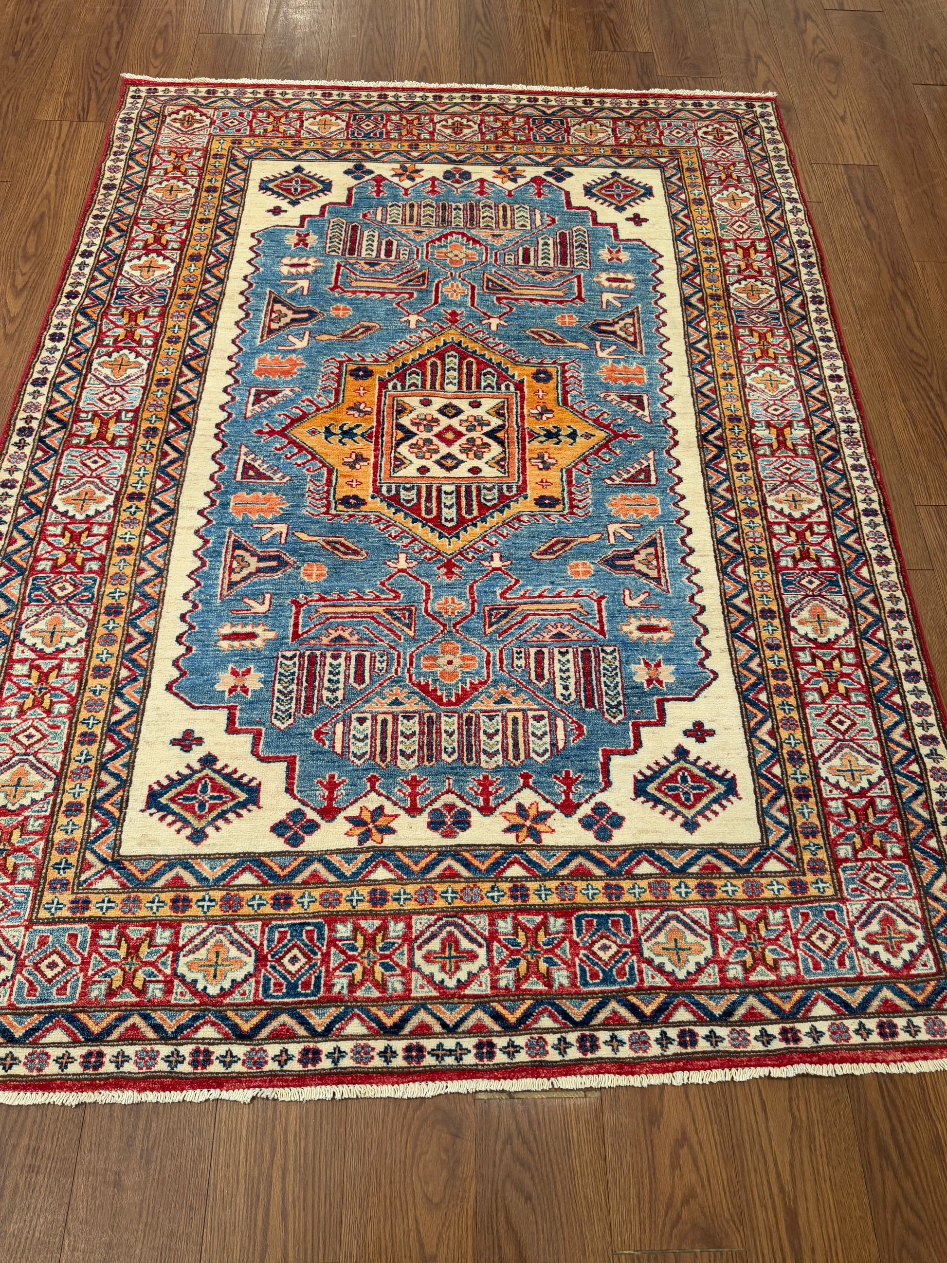 This handwoven rug showcases a striking central medallion in warm gold, set against a soft blue field that adds depth and contrast. The intricate geometric motifs are accented by layered red and ivory borders, giving the piece a sense of structure and refinement. Vivid tones of red, blue, gold, and ivory come together in a harmonious balance that feels both traditional and timeless. Its bold presence and artistic detailing make it an ideal statement piece for interiors that value cultural richness and handcrafted design.