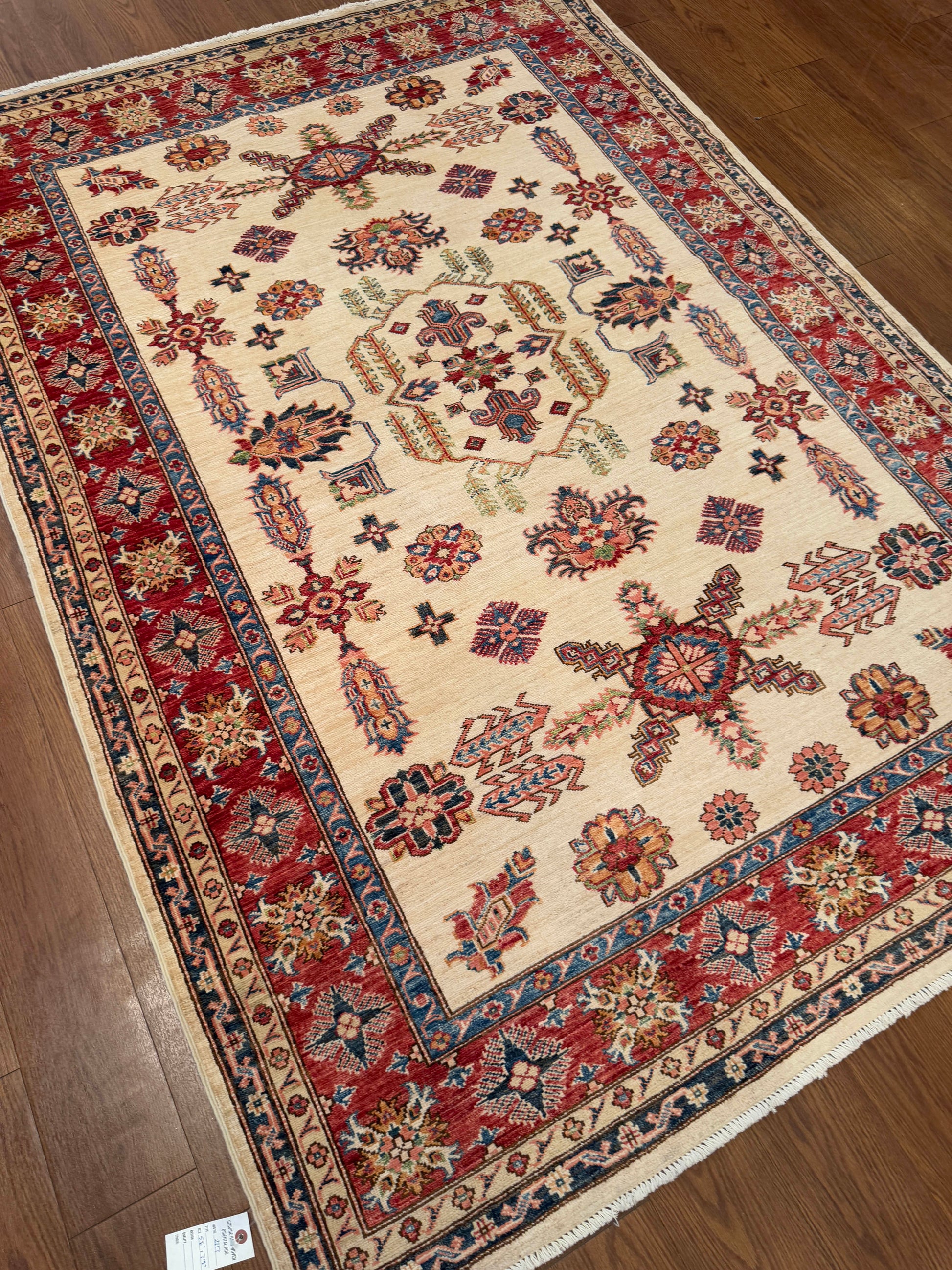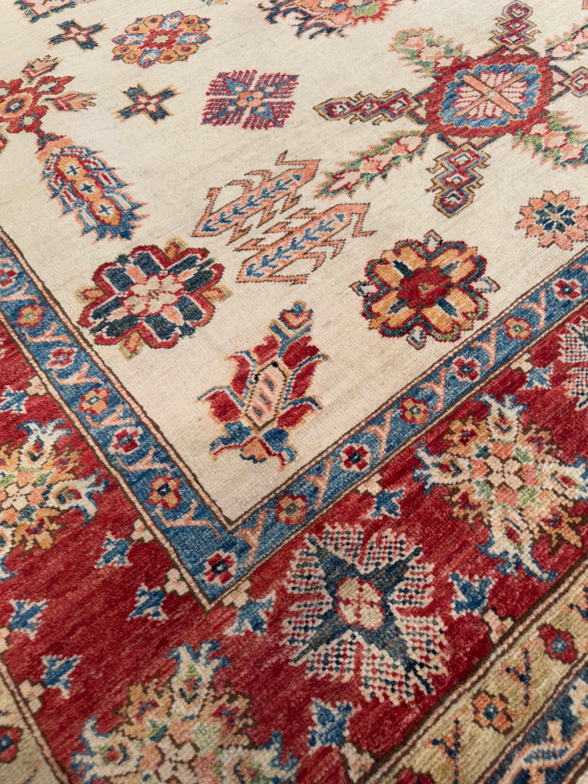This handwoven rug features a striking all-over design with a balance of geometric medallions and floral accents. The ivory field creates a bright backdrop that enhances the vibrant reds, blues, and greens throughout. With its symmetrical layout and detailed motifs, it offers a timeless sense of craftsmanship. A piece that blends boldness with elegance, perfect for enhancing both modern and traditional interiors.