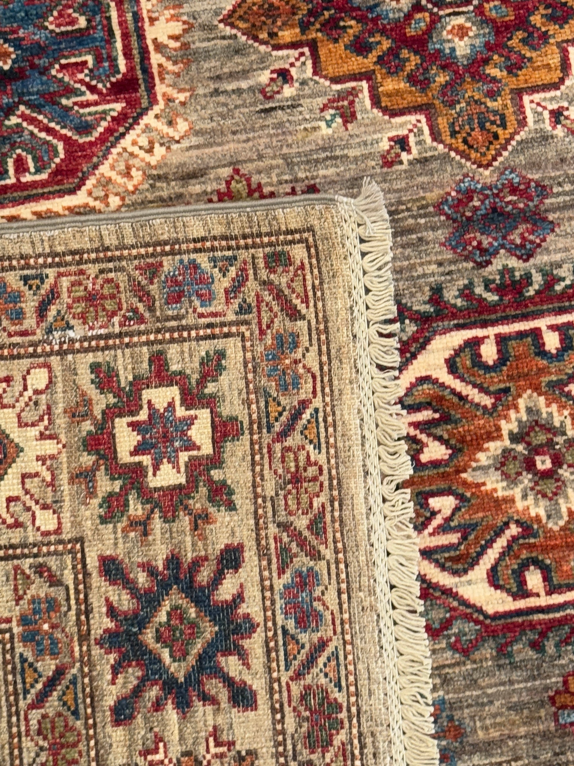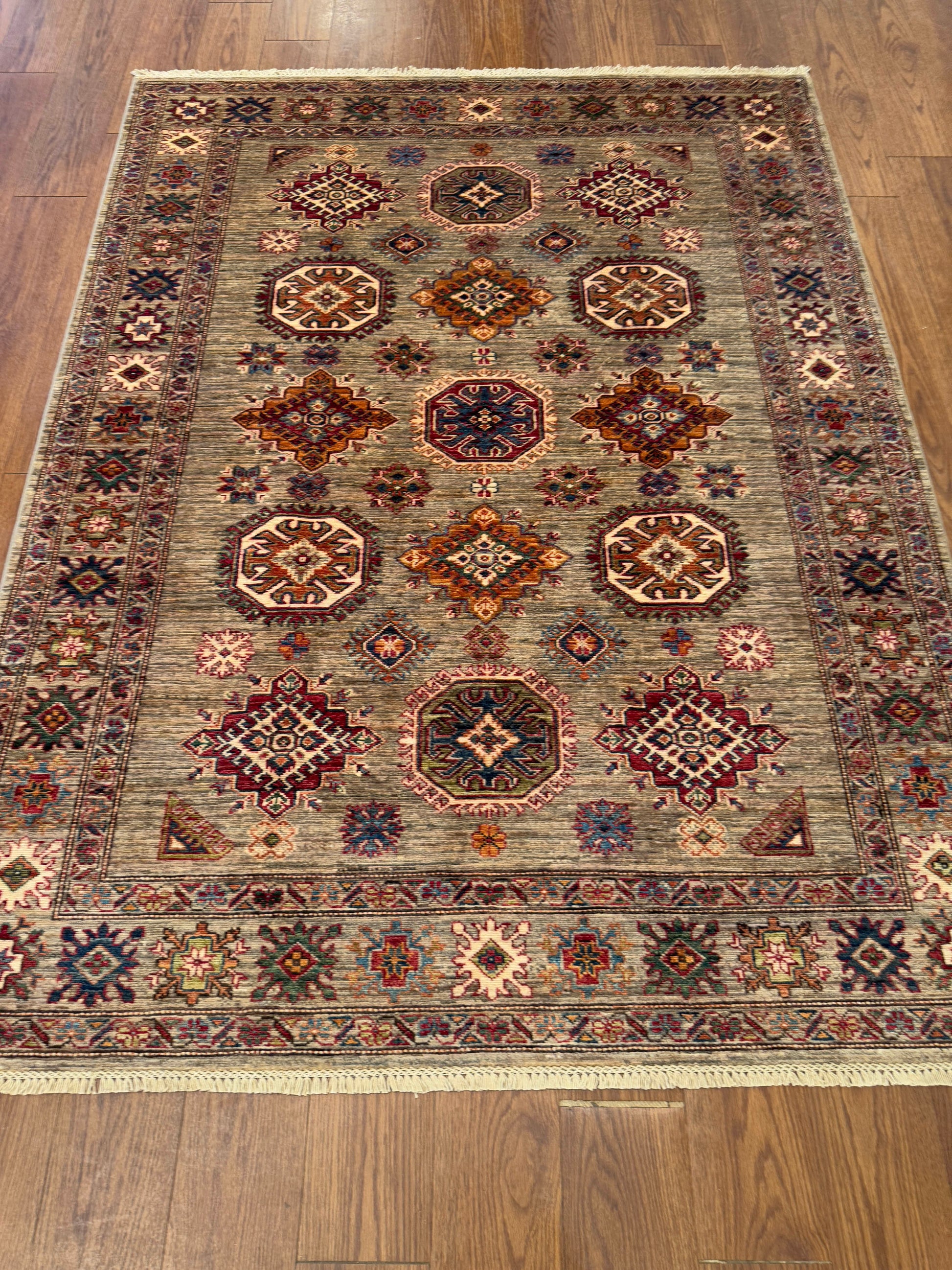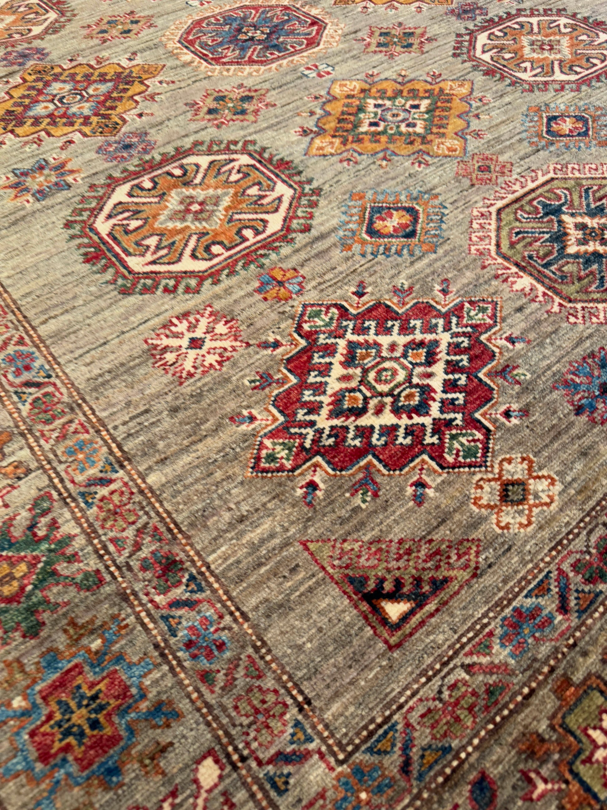 This handwoven rug displays a striking arrangement of octagonal medallions and diamond motifs set against a soft gray field. The design is highlighted with rich tones of red, gold, ivory, and blue, blending together to create both warmth and depth. A detailed border filled with smaller floral and geometric elements enhances its balance and artistry. This rug offers timeless character and durability, perfect for anchoring both traditional and modern interiors.