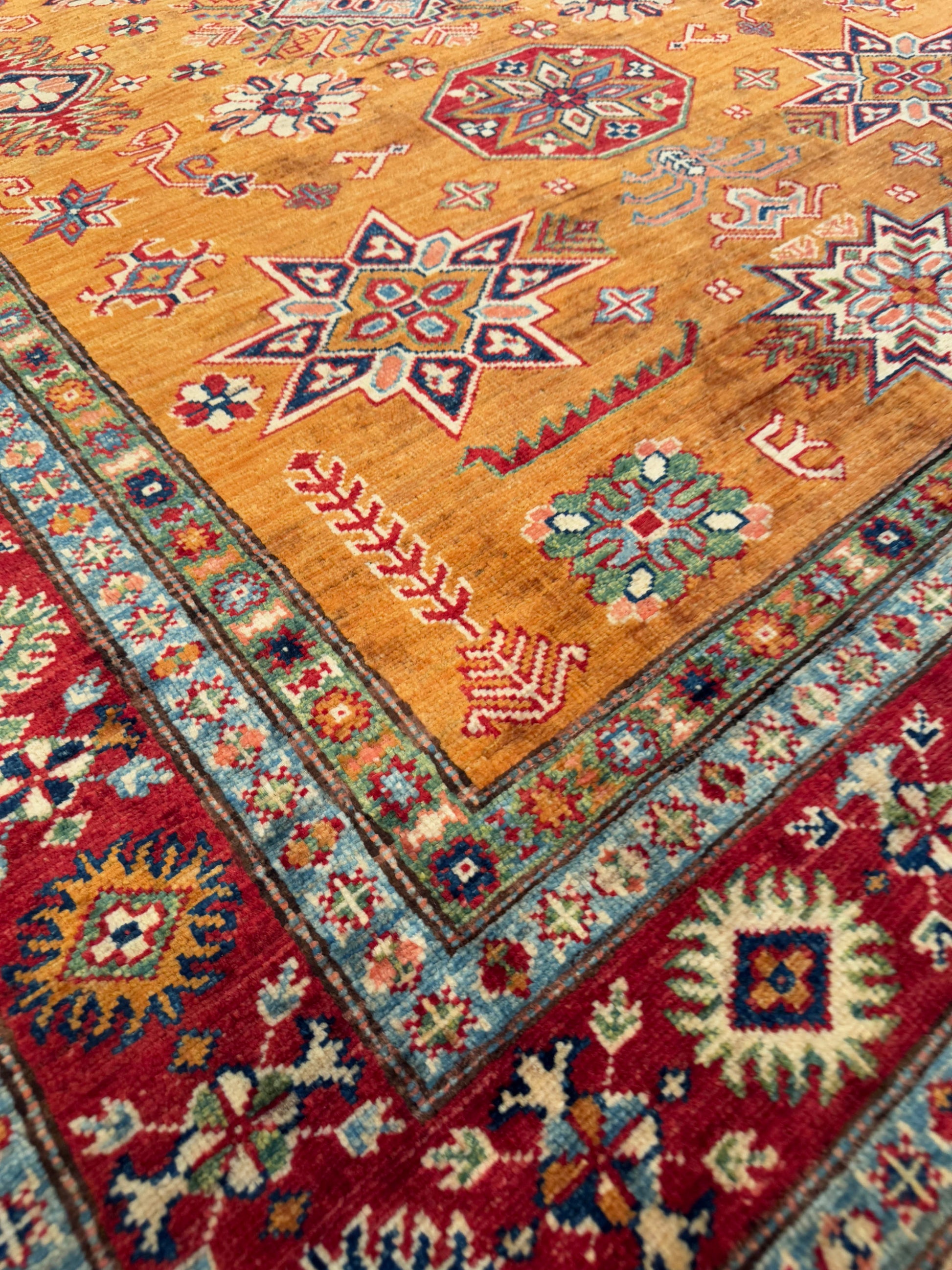 This vibrant handwoven rug features a brilliant golden-orange field adorned with geometric starbursts and diamond medallions. Bold red borders filled with intricate motifs provide a striking contrast that enhances the design’s depth and symmetry. The detailed craftsmanship showcases a balance of tradition and artistry, making it both decorative and durable. Its bold palette makes it an eye-catching centerpiece for any interior.
