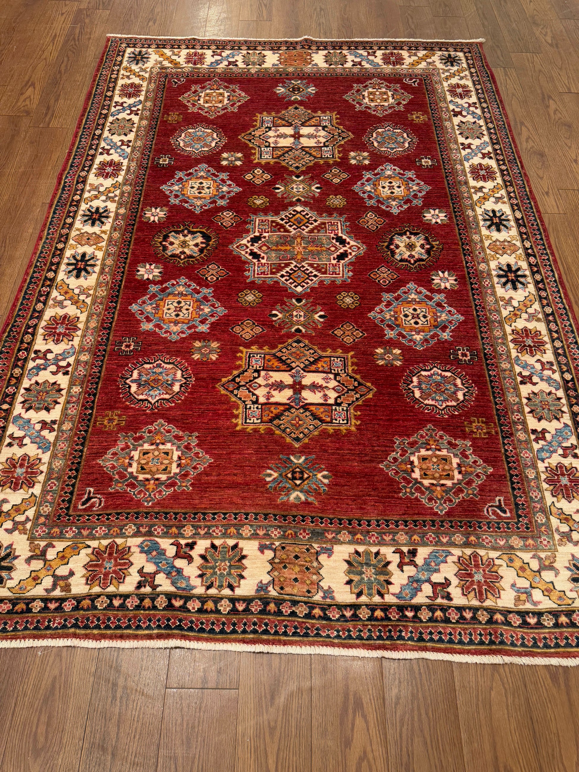 This handwoven rug displays a brilliant array of geometric medallions arranged across a vibrant red field. Each motif is finely detailed with floral and angular elements, highlighted by rich accents of ivory, blue, green, and gold. The wide border frames the composition beautifully, balancing boldness with intricate ornamentation. Its refined symmetry and bold palette make it an eye-catching centerpiece for both classic and contemporary interiors.