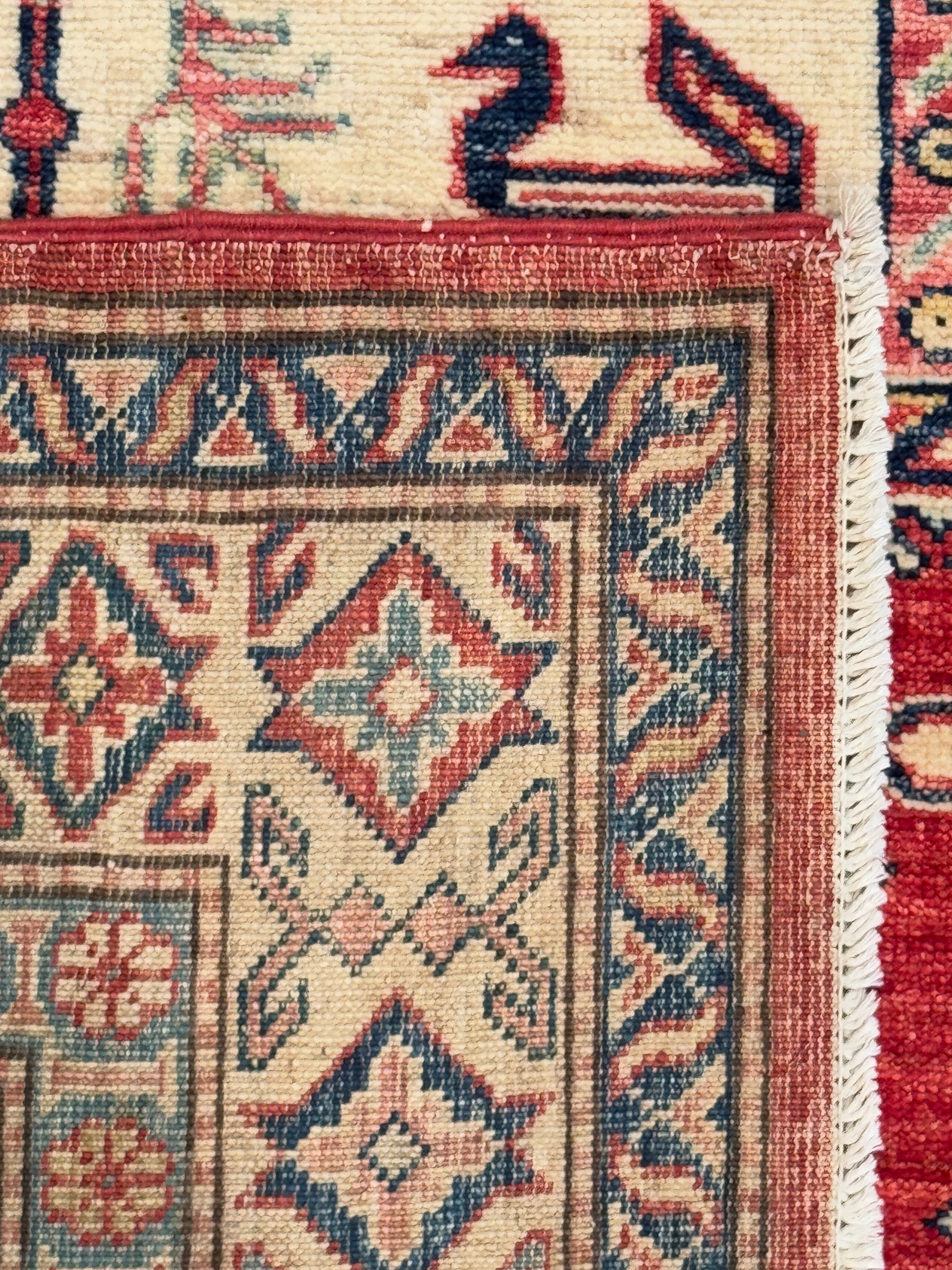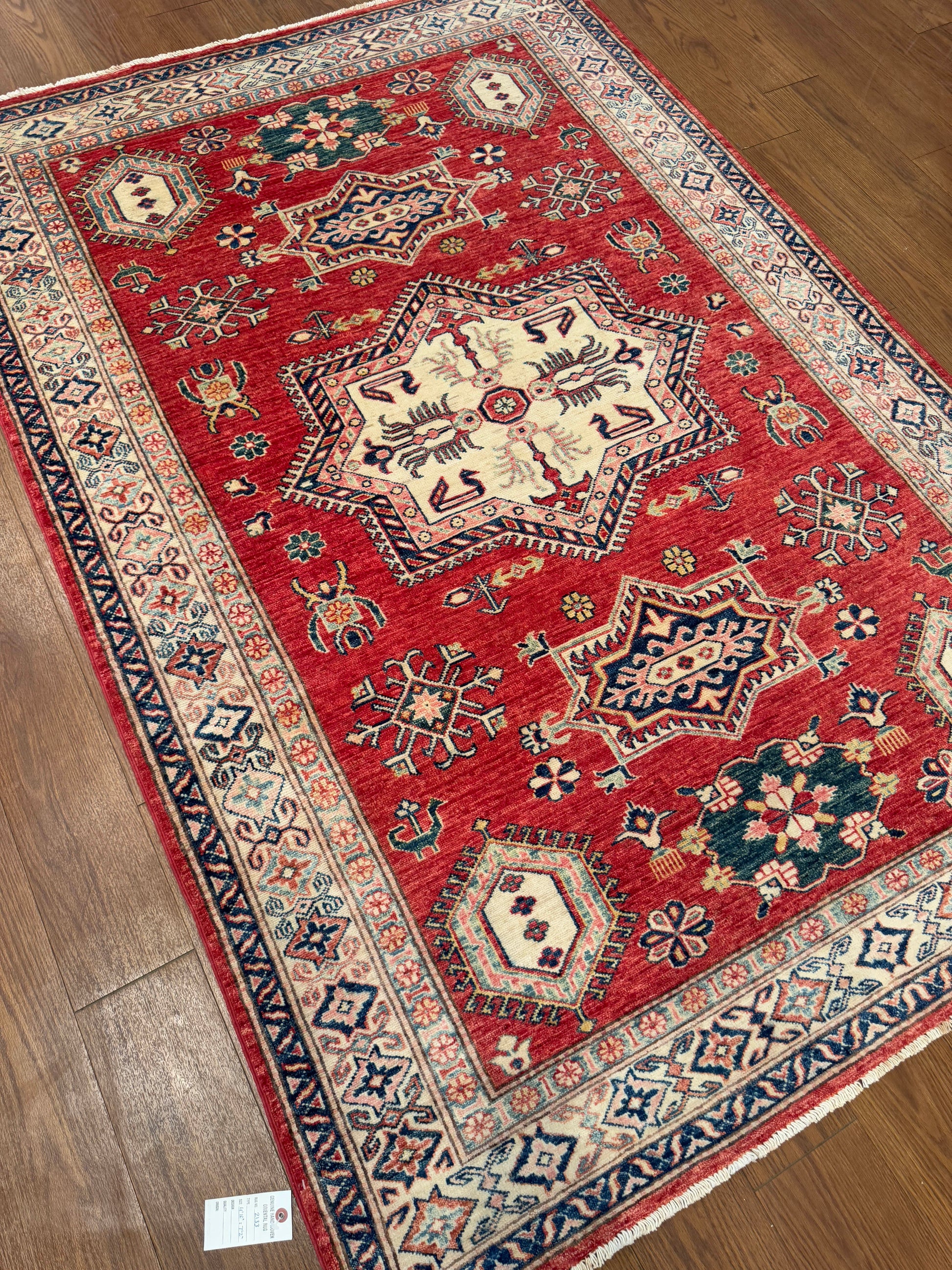 This vibrant handwoven rug features bold central medallions framed by stylized floral and geometric motifs. The rich red field is accented with ivory, teal, and navy elements, creating a dynamic contrast that highlights its intricate details. The surrounding borders incorporate repeating diamond and lattice forms, lending balance and symmetry. Its craftsmanship and striking palette make it a versatile piece that adds warmth and character to any room.