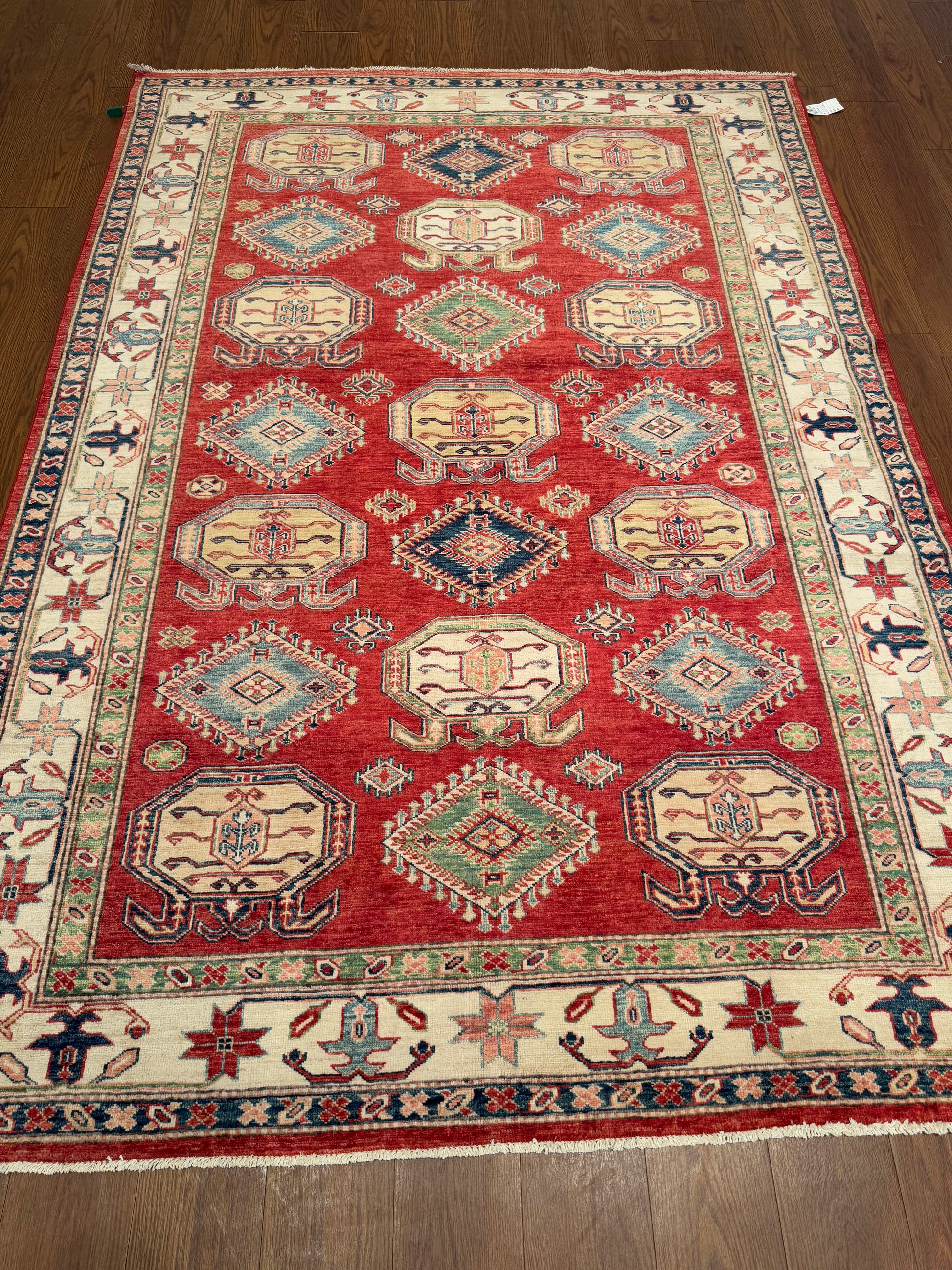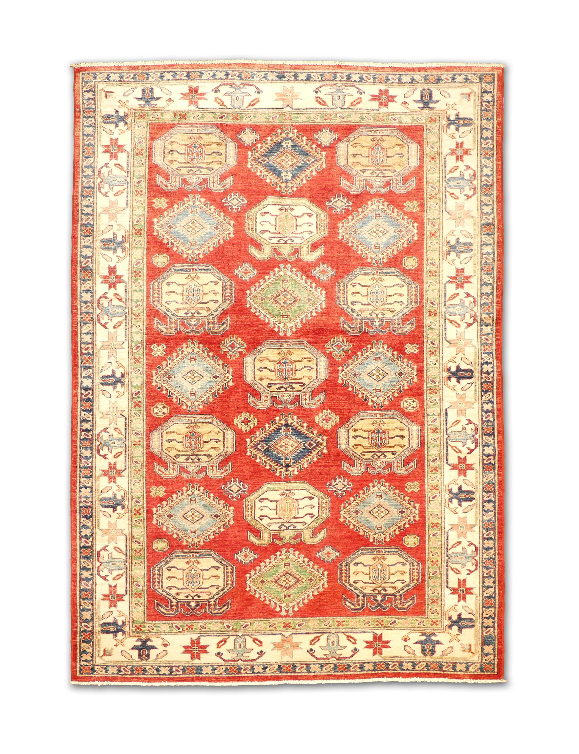This handwoven rug features a striking red field decorated with a series of bold octagonal medallions and geometric motifs. The ivory medallions contrast beautifully with light blue and green accents, while intricate details in navy and terracotta add richness. Its ivory border is adorned with stylized floral and tribal designs, framing the rug with balance and symmetry. This piece carries a strong traditional presence, ideal for rooms needing warmth and cultural charm.