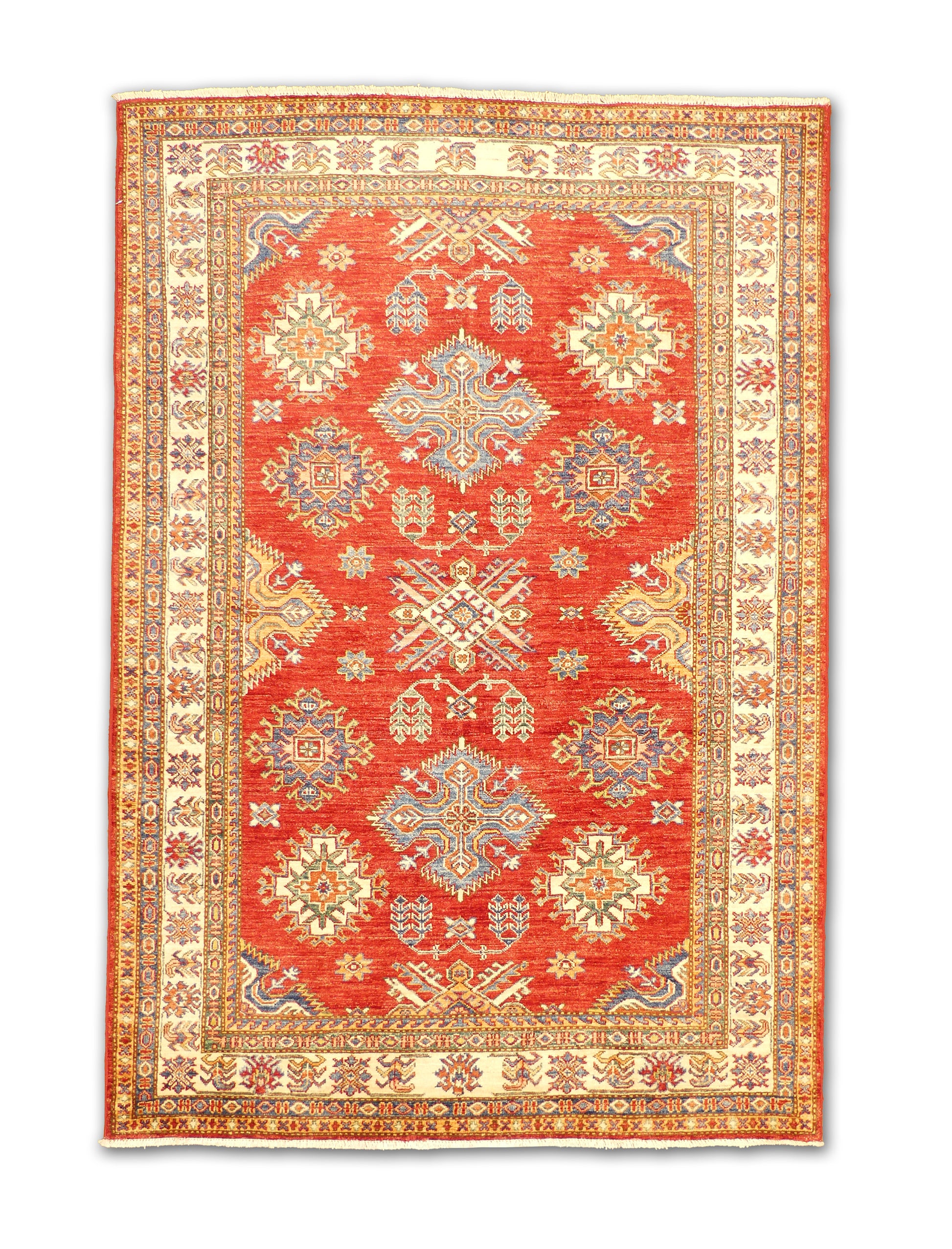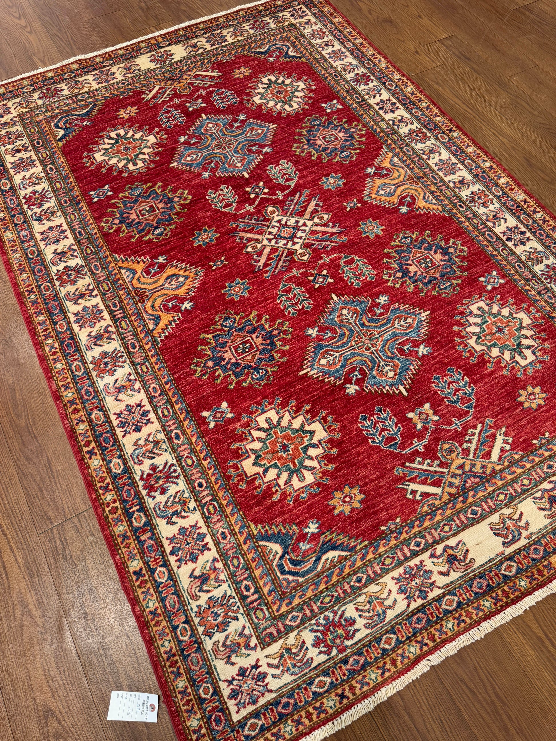 This handwoven rug displays a rich red field adorned with a variety of geometric star and medallion motifs in ivory, navy, and soft green. The intricate central design is balanced by a bold ivory border, accented with tribal floral and vine patterns. The strong contrast of colors highlights its detailed craftsmanship and timeless tribal artistry. Perfect for creating a warm and inviting focal point in any traditional setting.