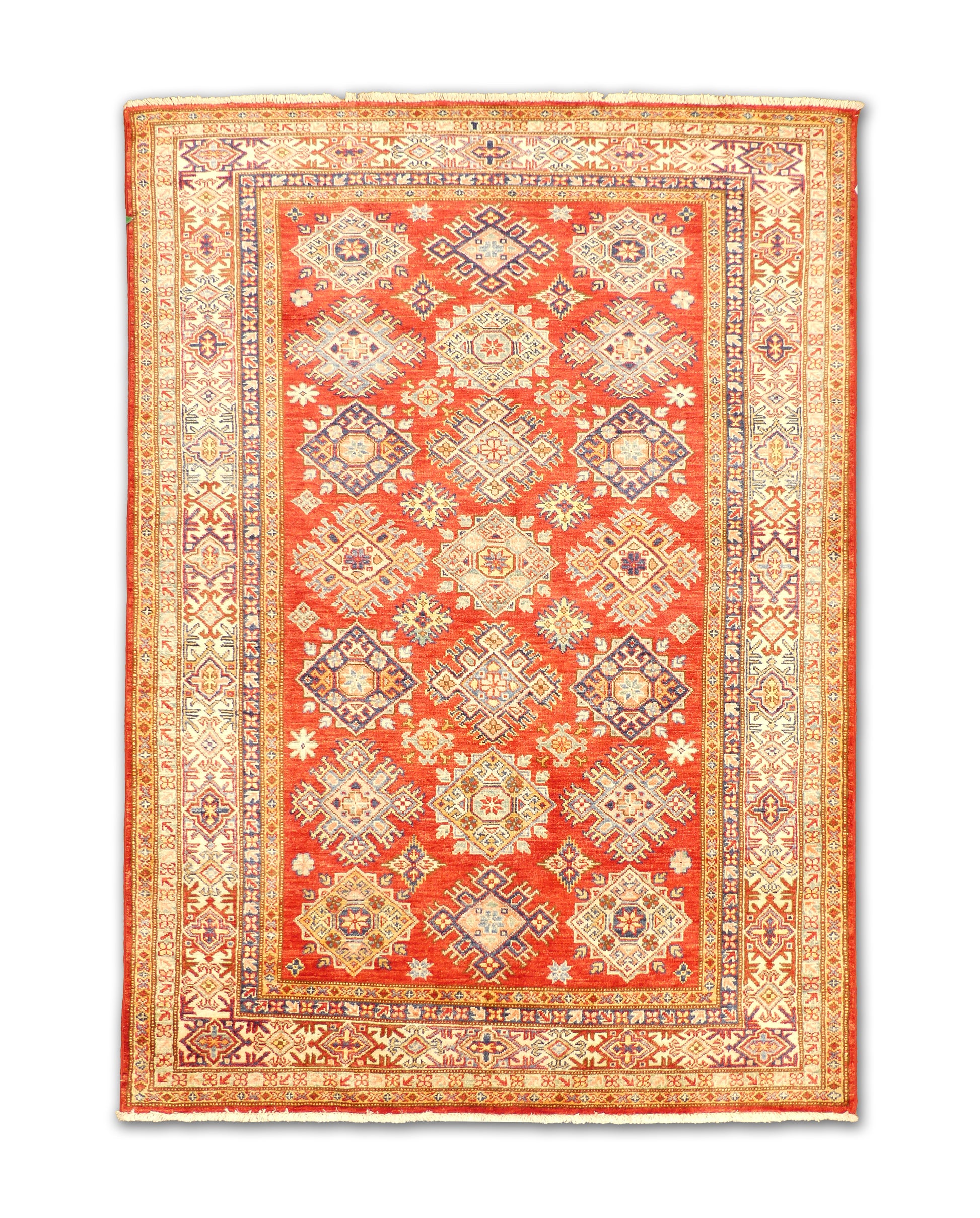 This handwoven wool rug showcases a radiant red field decorated with a series of geometric medallions in ivory, navy, and soft green. The repeating diamond and star motifs bring a sense of rhythm and movement, while the detailed ivory border frames the design with complementary geometric accents. Rich color contrasts and sharp patterns highlight its traditional Kazak character, giving it both boldness and versatility in a variety of interiors.