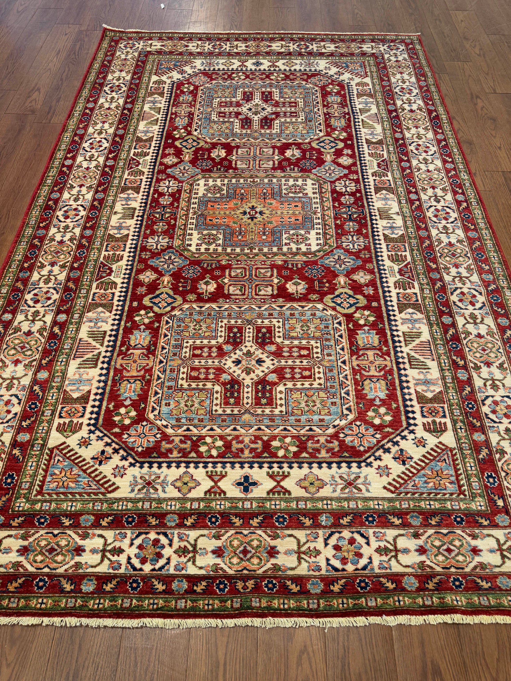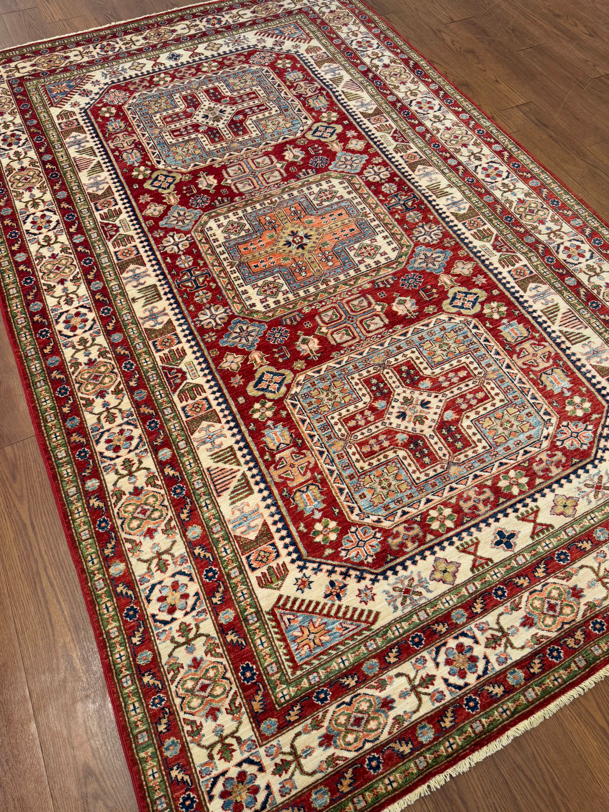 This striking handwoven wool rug features a bold red field anchored by prominent geometric medallions and layered ivory borders. Detailed accents in blue, green, and gold add depth and balance, creating a piece that feels both traditional and lively, ideal for elevating a range of interiors.