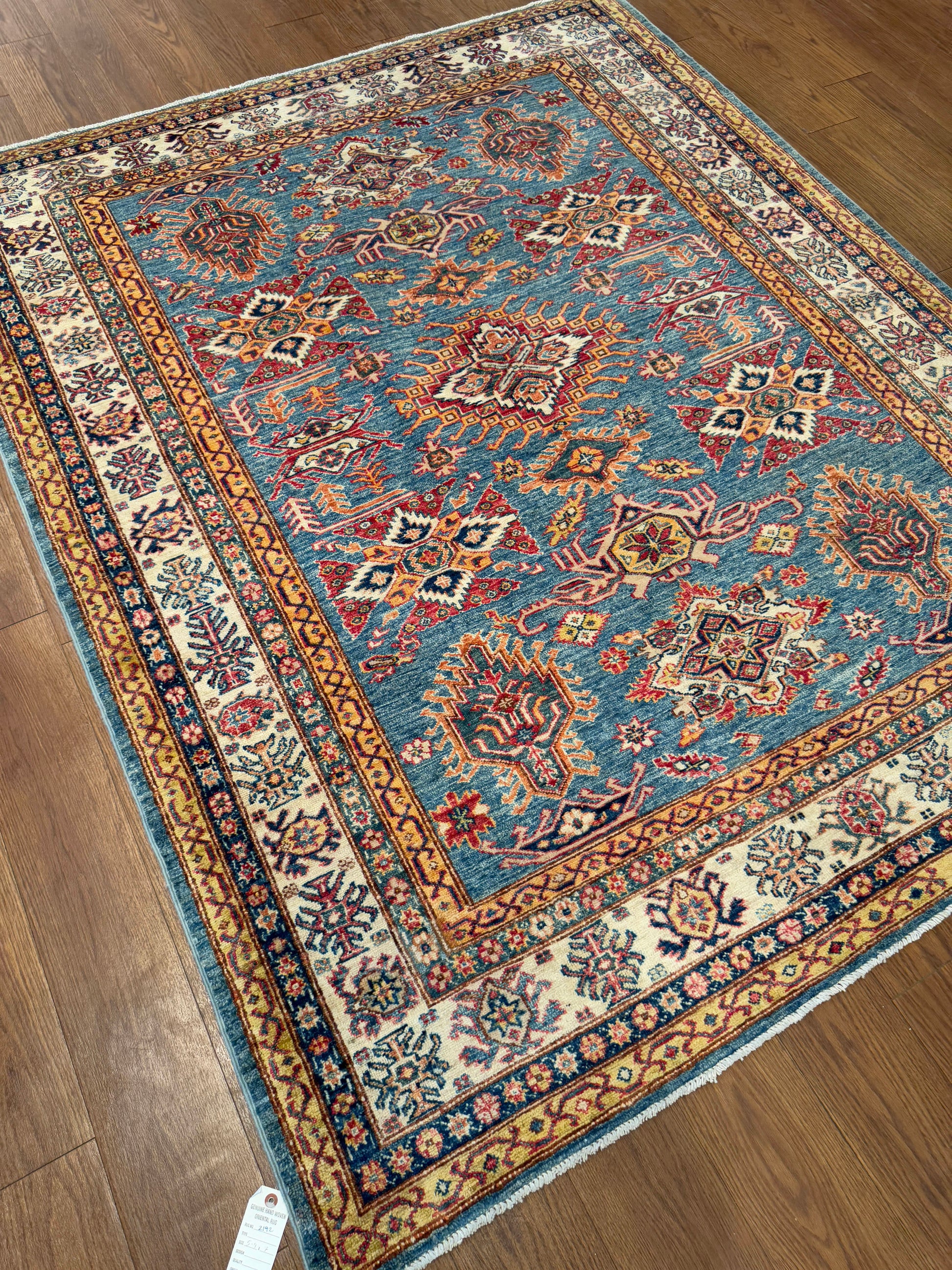 This handwoven Caucasian rug features a radiant sky-blue field filled with intricate medallions, floral rosettes, and stylized boteh motifs in warm shades of red, gold, ivory, and navy. The lively composition is balanced by a wide ivory border decorated with repeating floral and geometric patterns, creating a striking frame. The combination of cool blue tones with fiery accents brings vibrancy and balance, making it a centerpiece that feels both elegant and bold. Its wool construction ensures durability while preserving authentic craftsmanship.