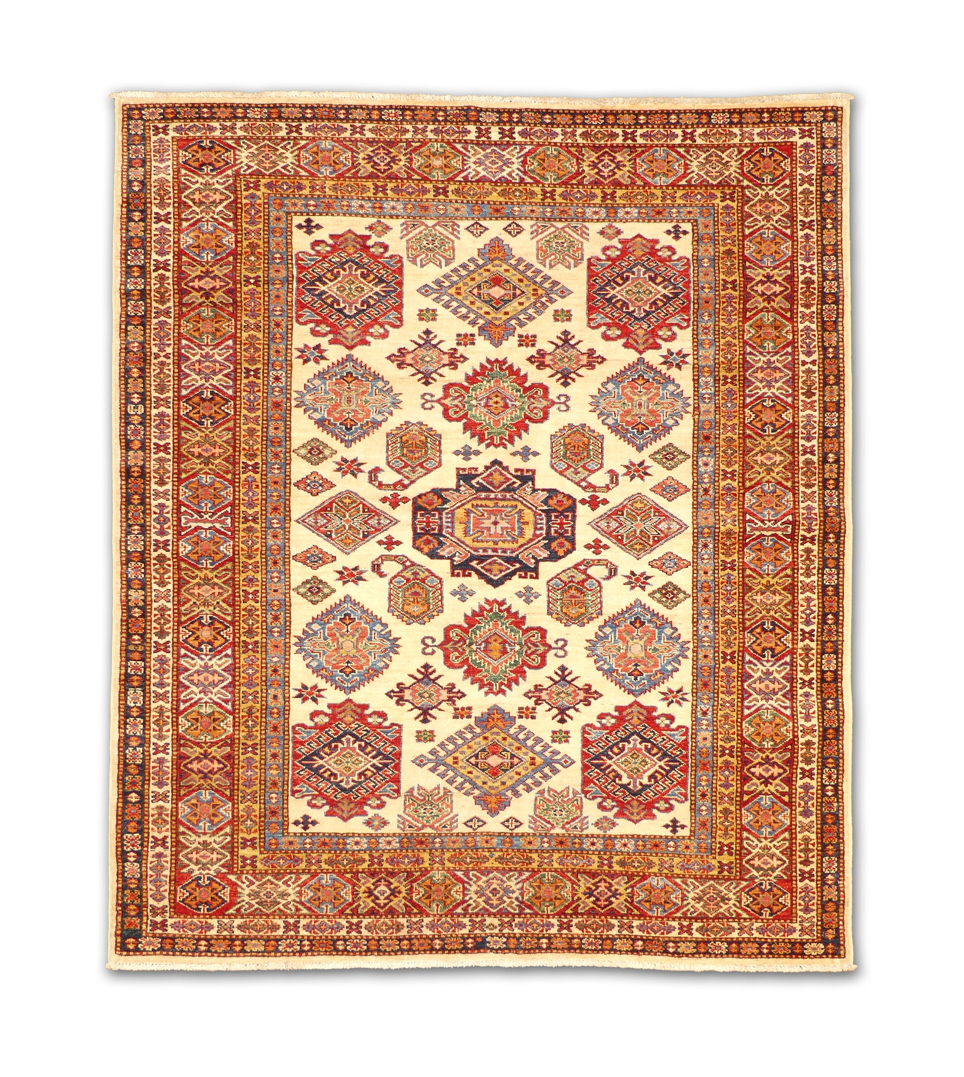 This handwoven Caucasian rug features a warm ivory field adorned with a striking arrangement of geometric medallions, diamonds, and rosettes in rich hues of red, navy, teal, and gold. The intricate all-over design conveys movement and depth, while the bold multi-layered border enhances its framing presence. With its bright ground and vivid accents, this rug strikes a balance between elegance and vibrancy, making it a versatile choice for both traditional and eclectic interiors. Crafted from fine wool, it ensures durability and timeless charm.