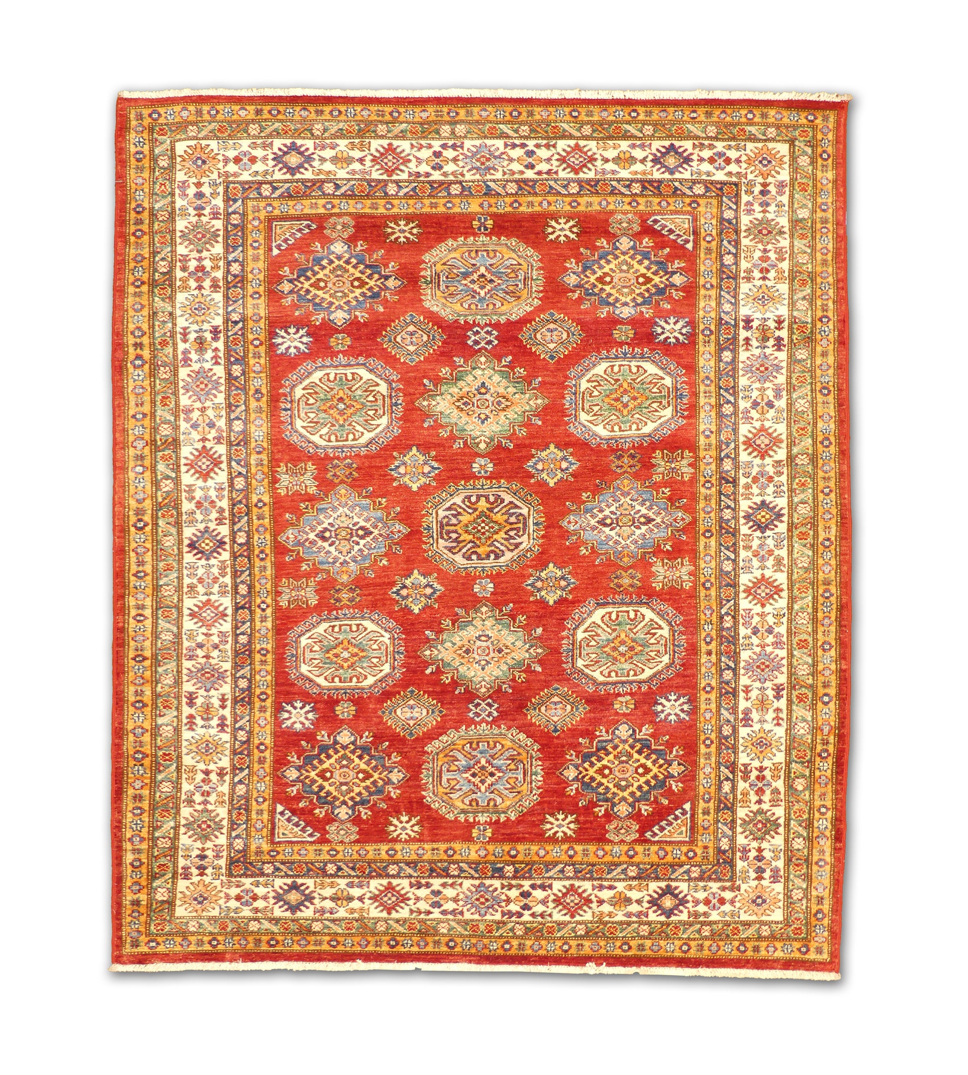 This handwoven rug showcases a rich red field filled with striking octagonal medallions and star-like floral motifs. The detailed ivory border is decorated with small geometric rosettes, enhancing the rug’s tribal artistry. Its warm color palette of red, ivory, blue, and gold creates both vibrance and elegance, making it a versatile addition to any home.