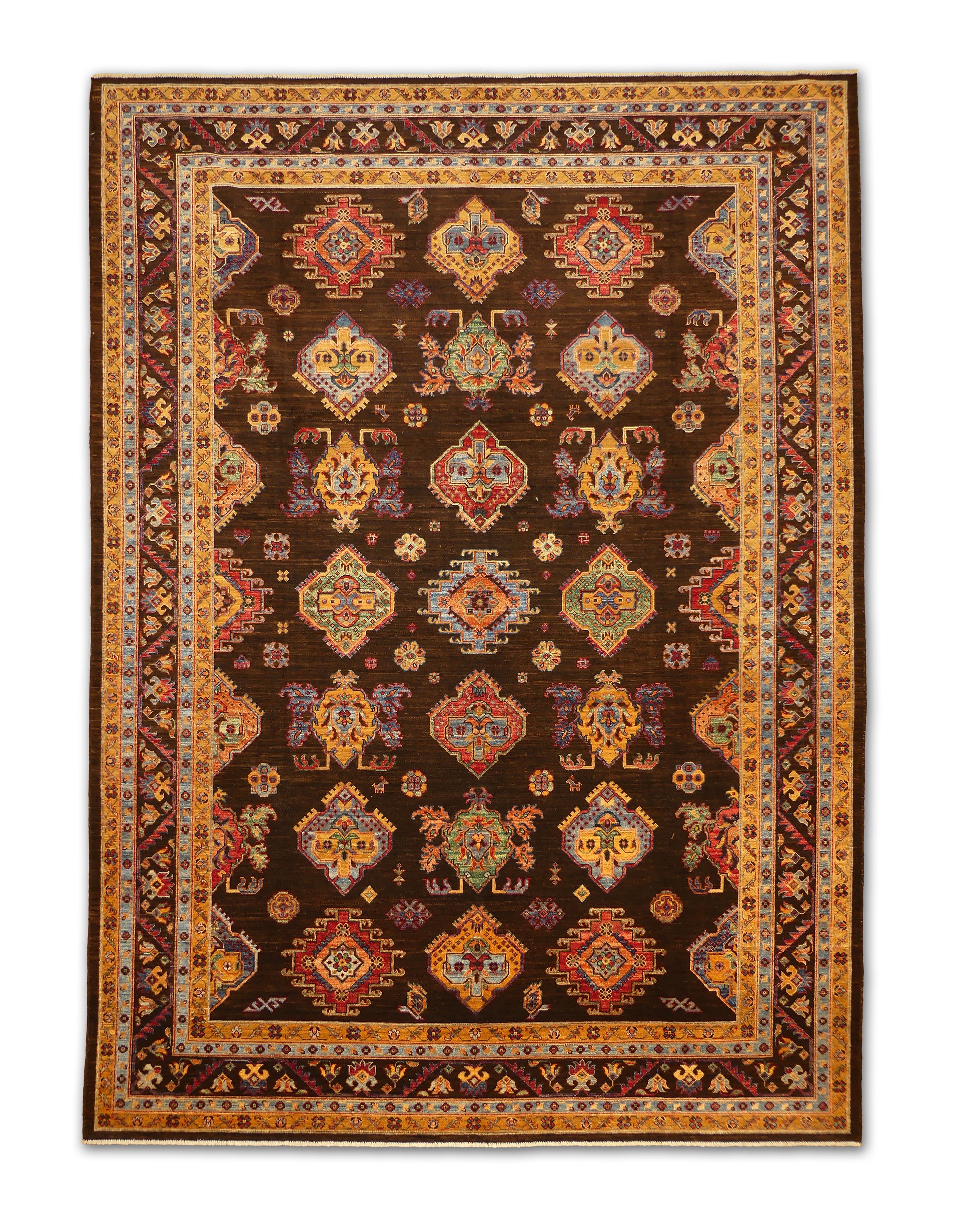 Bold and captivating, this handwoven rug showcases a rich espresso-brown field adorned with striking geometric medallions and stylized floral motifs. The vibrant hues of saffron, turquoise, coral, and rose burst against the dark backdrop, creating a stunning visual balance of warmth and sophistication. A golden border frames the composition beautifully, adding a refined finish to this contemporary take on tribal design.