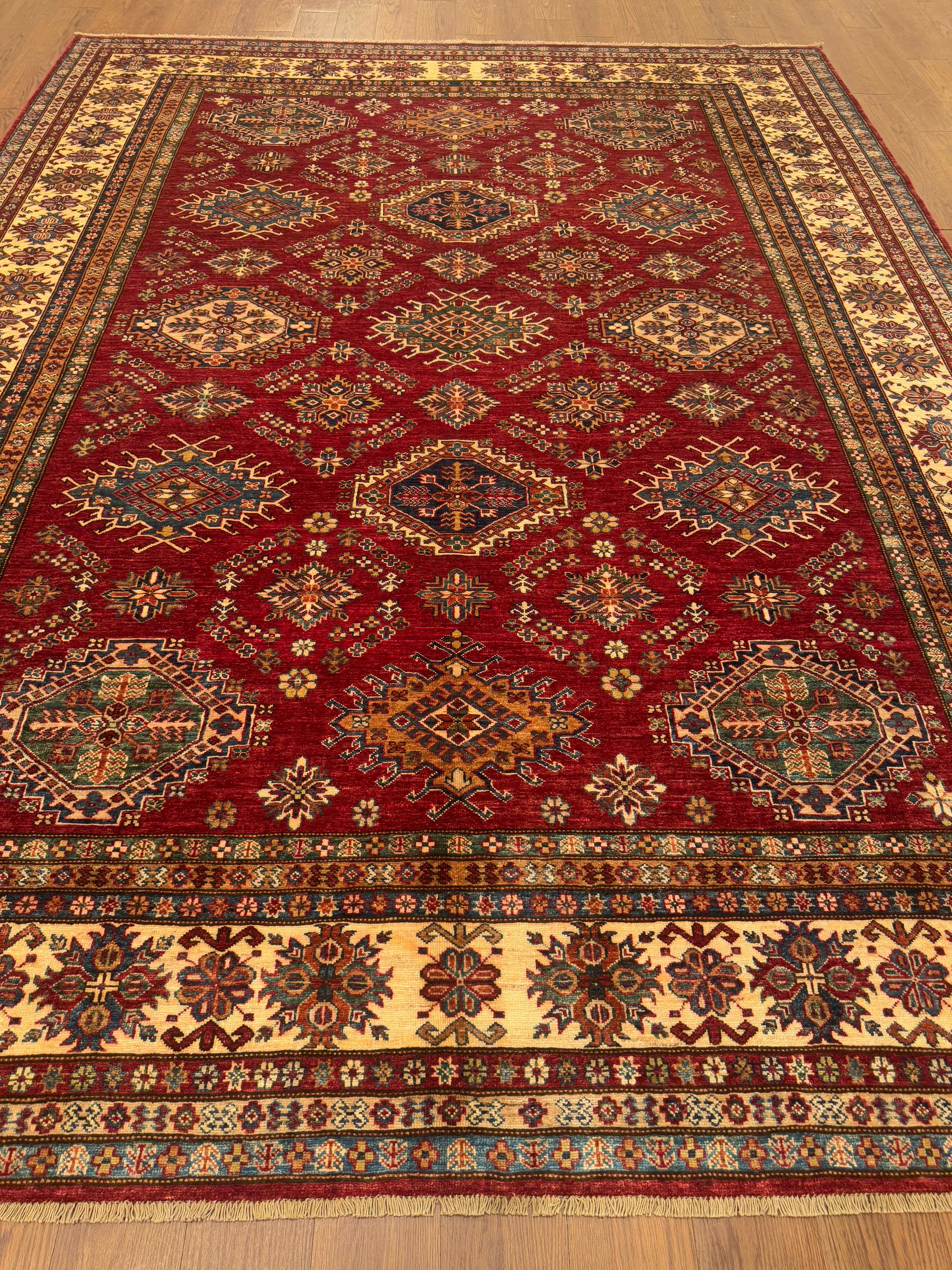 This handmade rug features a bold geometric medallion layout on a deep crimson red field, framed by intricate borders of ivory, gold, and blue. The interplay of diamond and star motifs creates a dynamic yet balanced pattern that exudes warmth and classic sophistication. Its refined craftsmanship and vibrant palette make it an excellent focal point for traditional or transitional interiors.