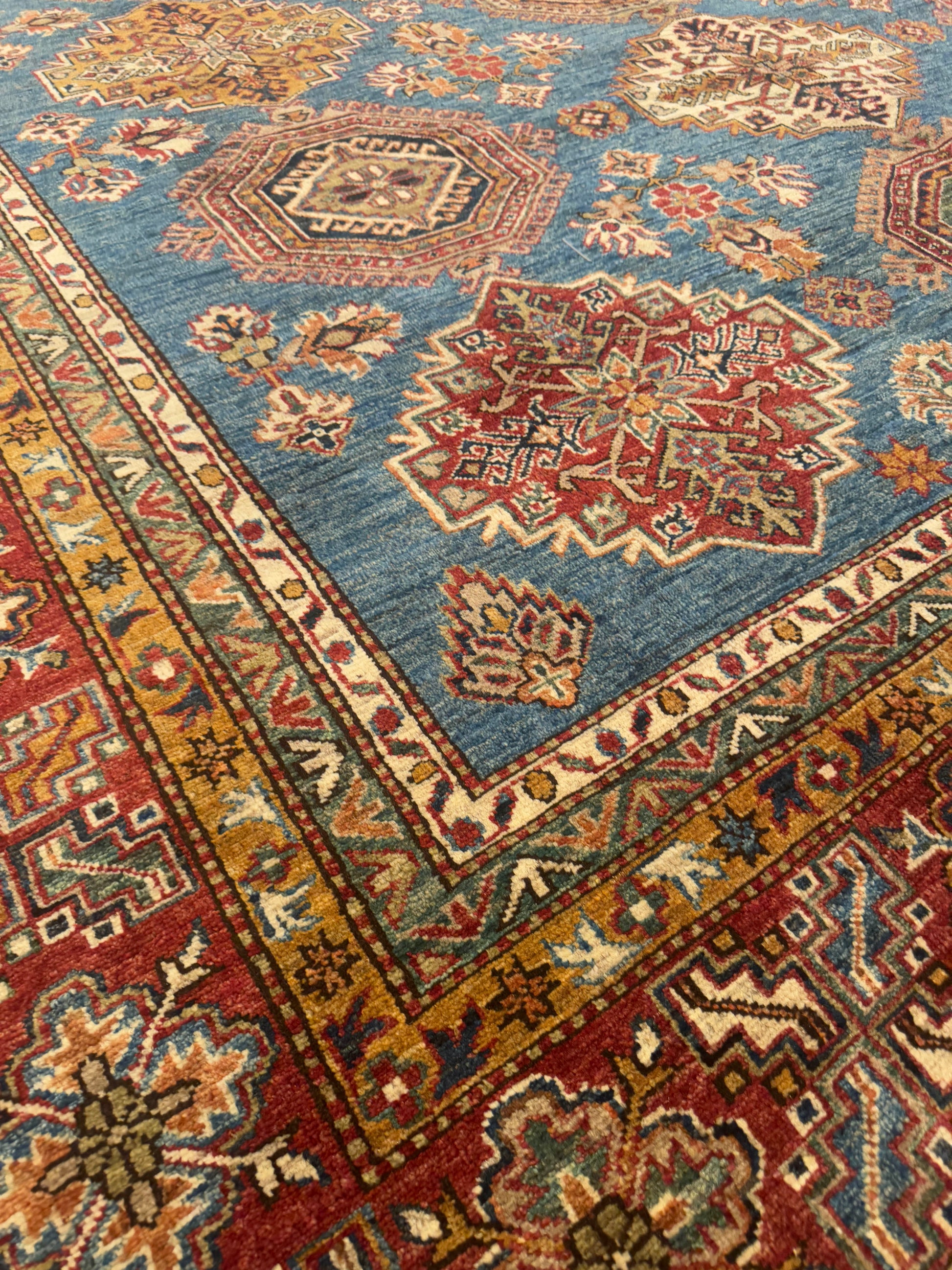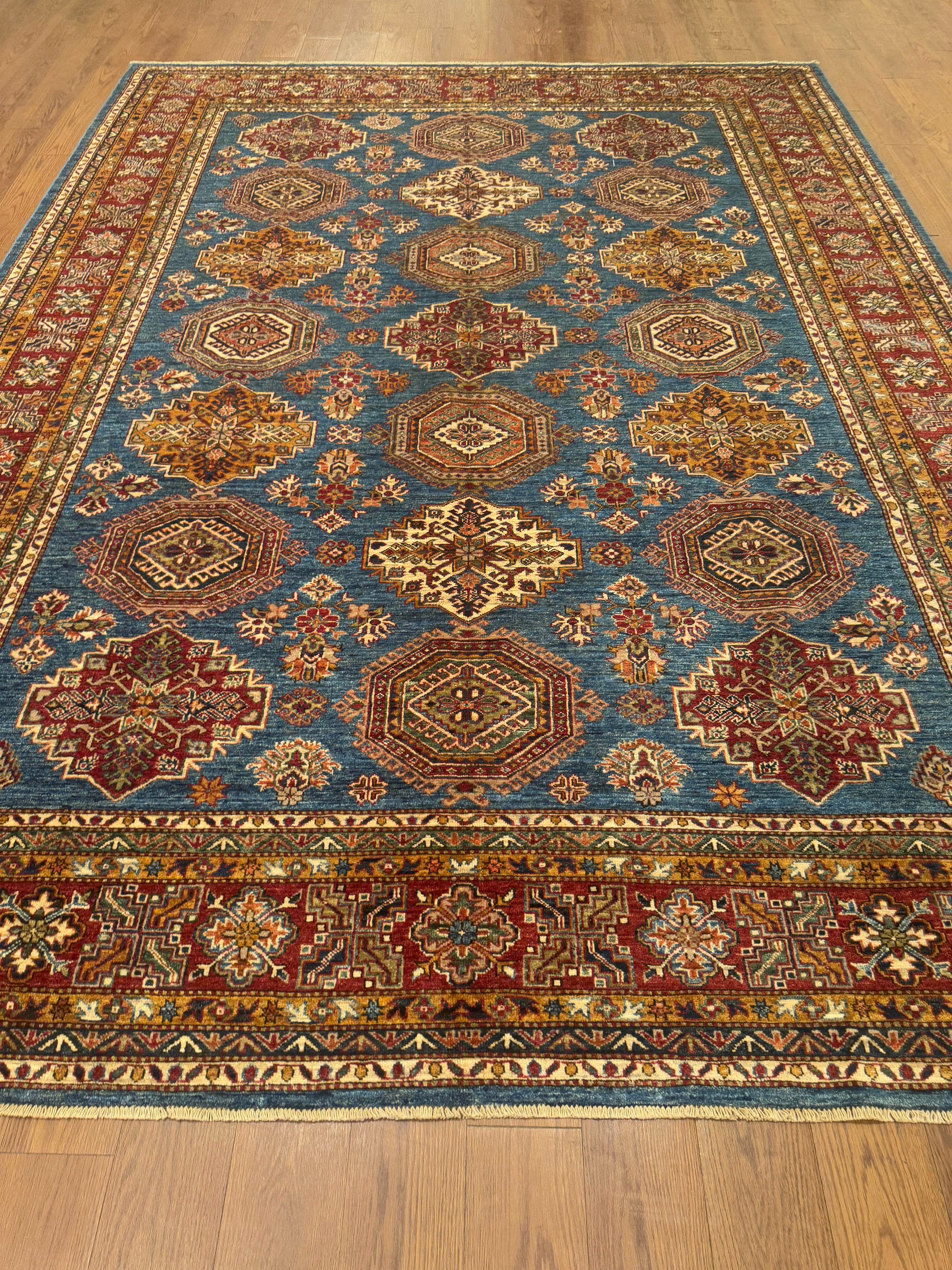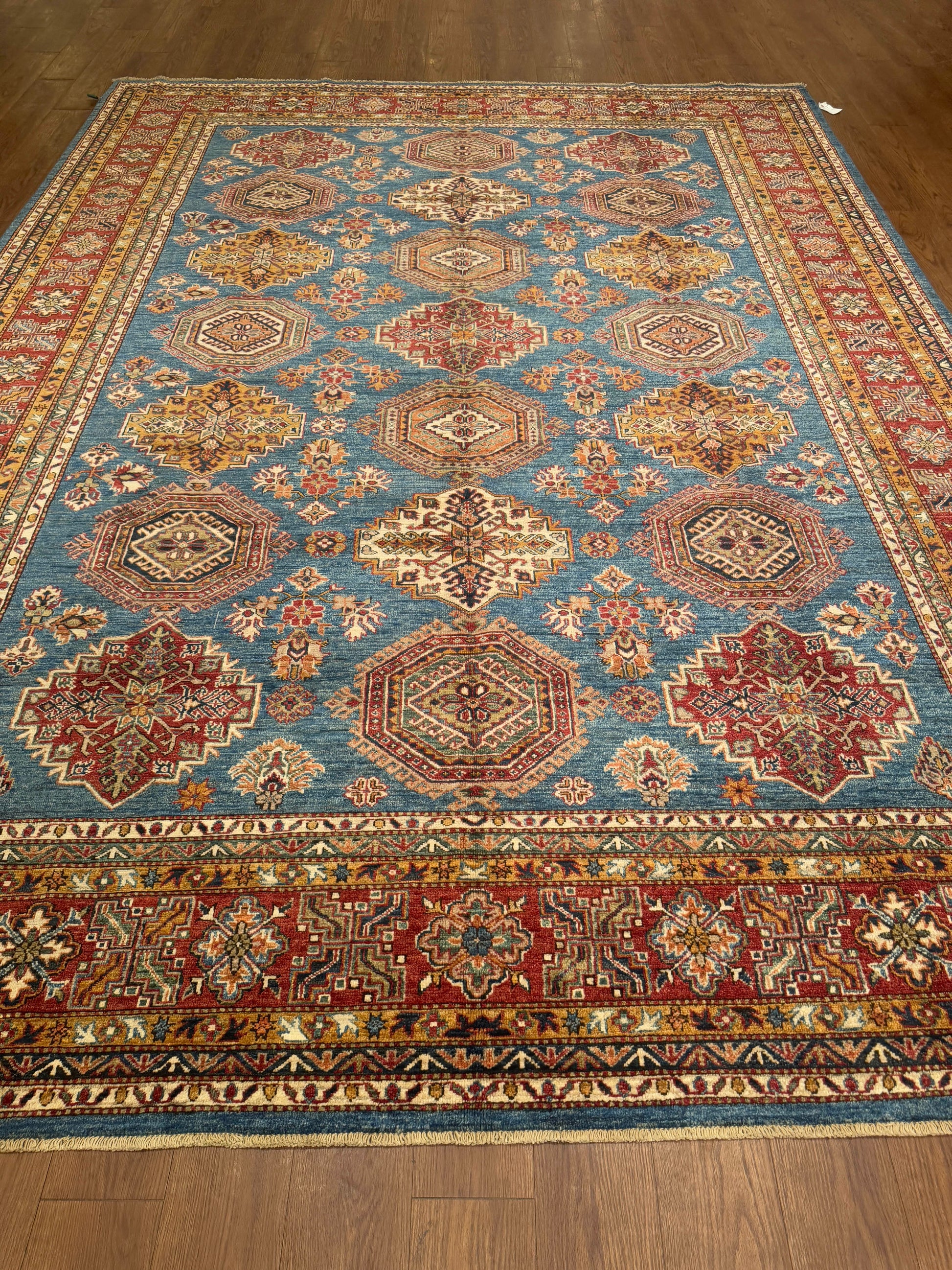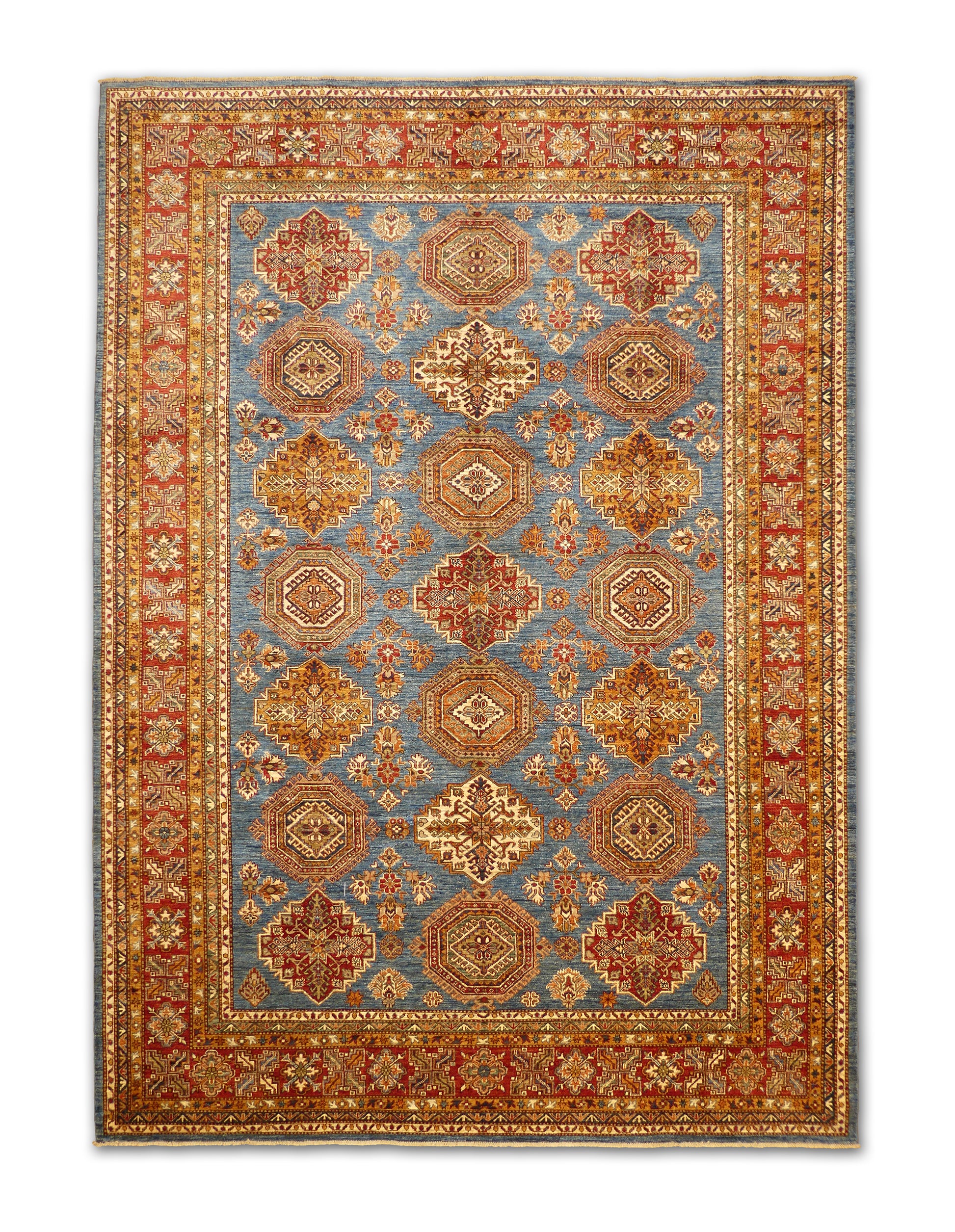 This handwoven rug features a striking arrangement of octagonal and floral medallions set against a rich sky-blue field. Accented with shades of rust, gold, ivory, and olive, the intricate motifs create a beautiful rhythm of symmetry and color. The layered borders with tribal detailing provide balance and definition, giving the rug a timeless elegance that enhances both classic and transitional interiors.