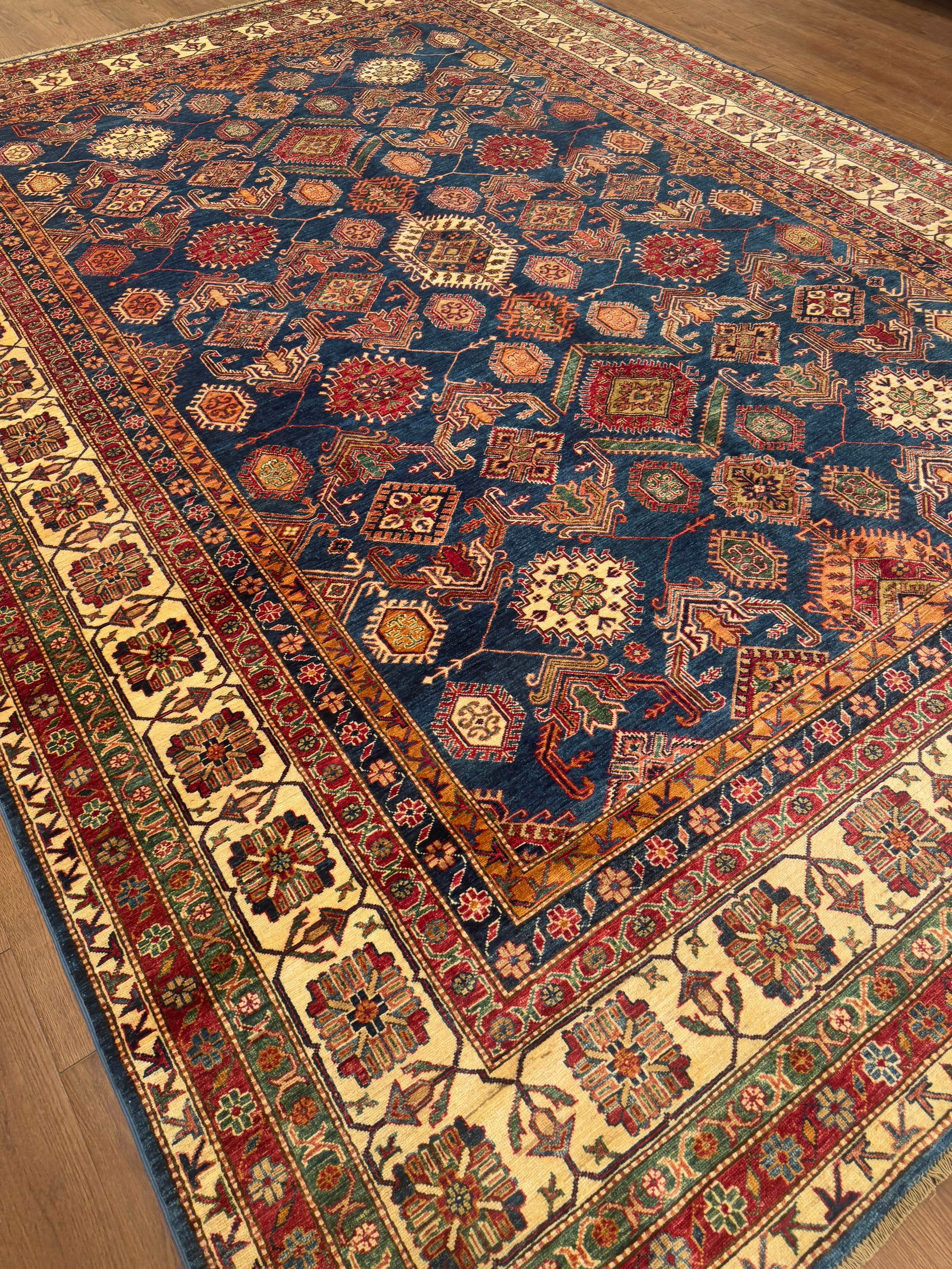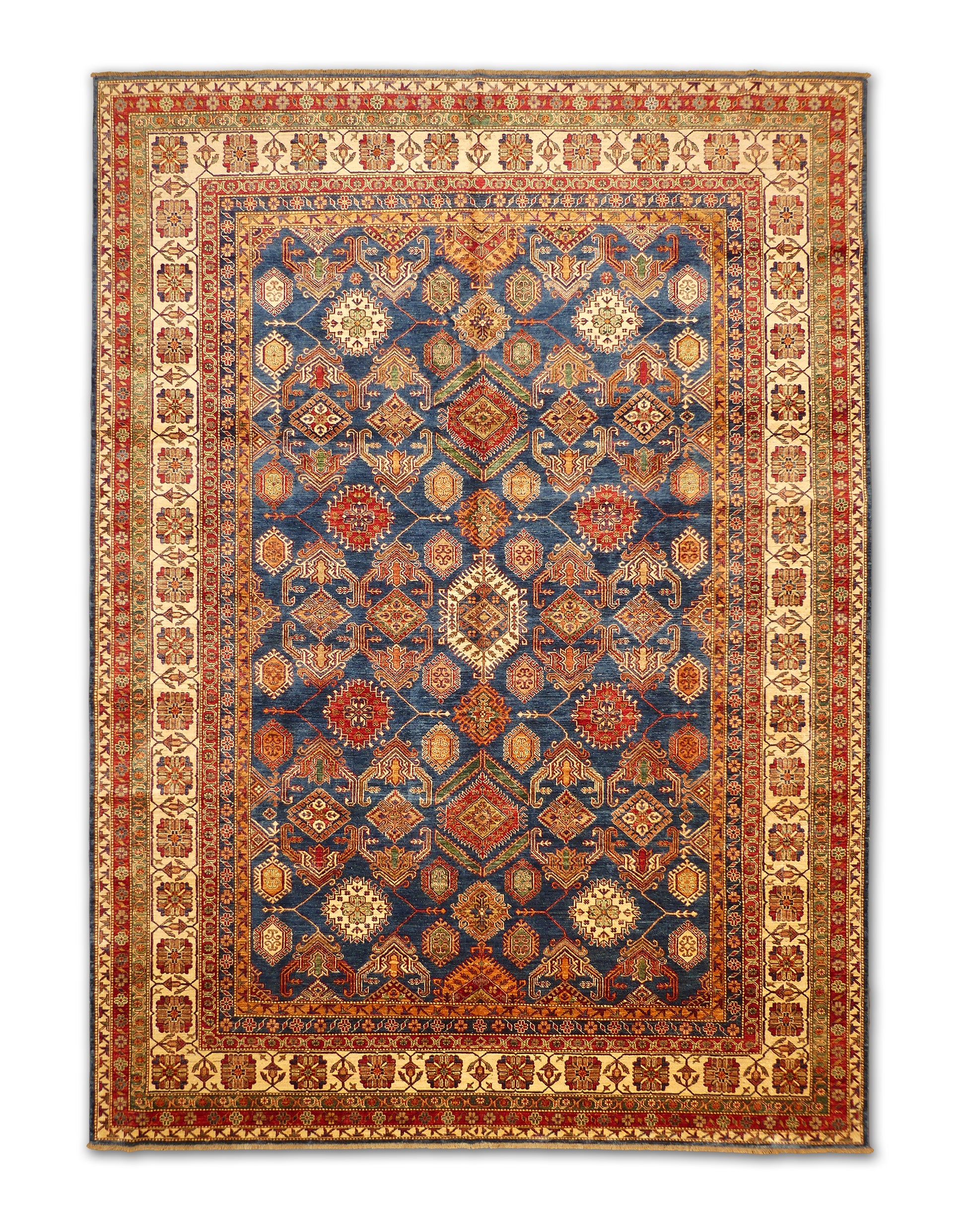 This handwoven rug showcases a striking lattice of diamond medallions on a rich blue field, framed by intricate ivory and red borders. The warm palette of gold, rust, and green highlights each geometric motif, creating both depth and movement. Crafted from high-quality wool, this rug embodies traditional craftsmanship with a bold tribal character, making it an elegant focal point for refined interiors.