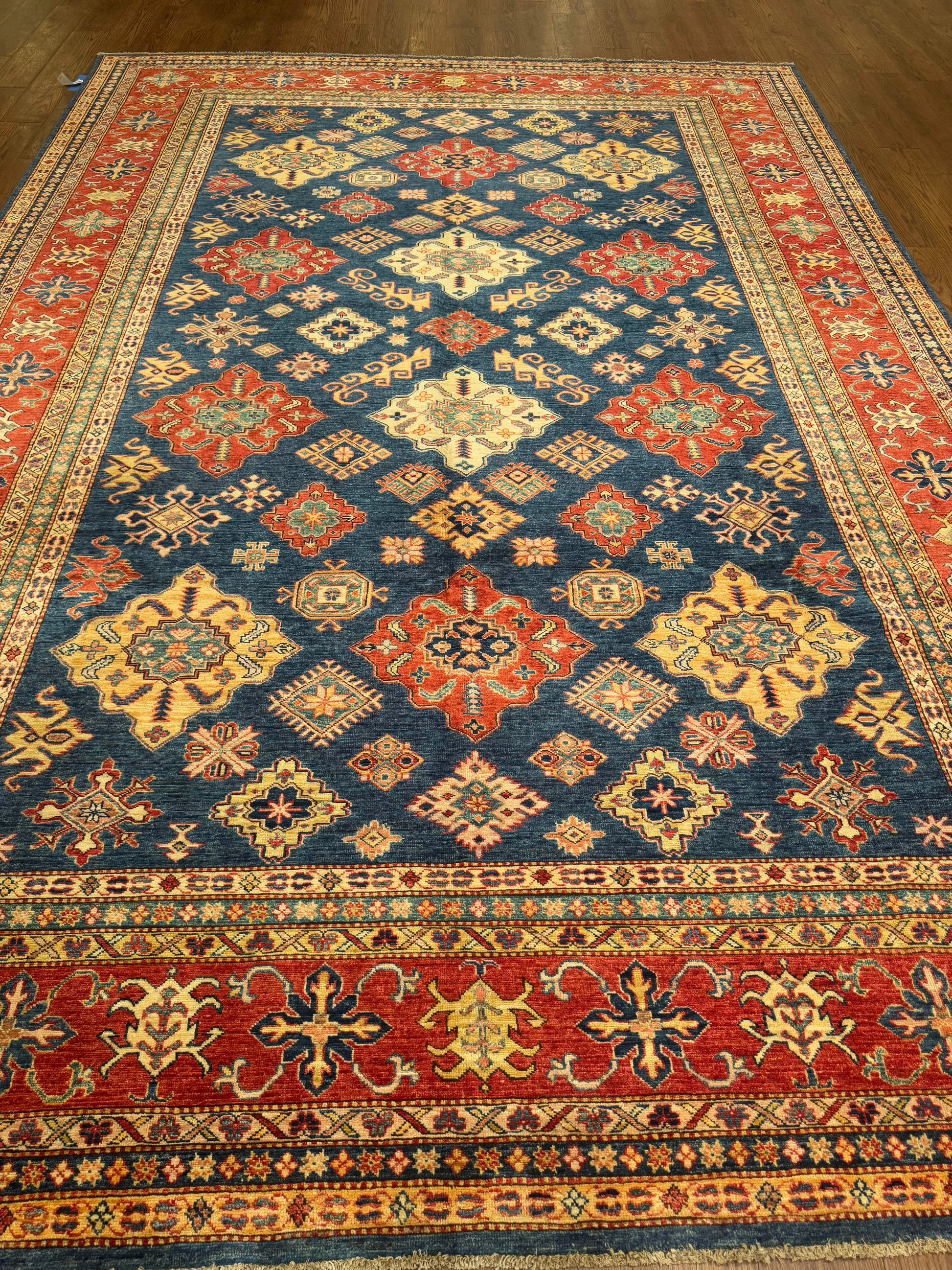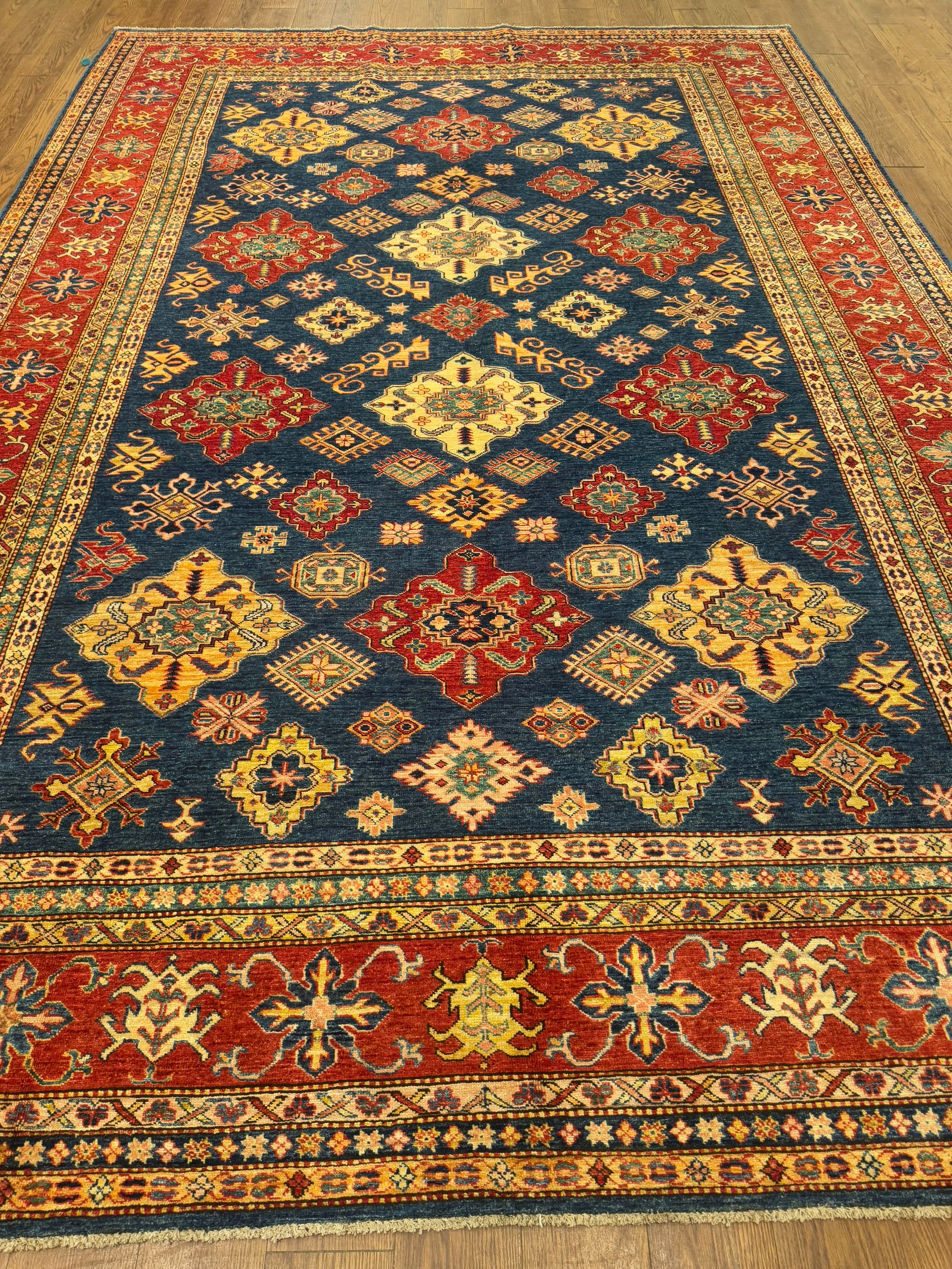 This handwoven rug displays a striking geometric pattern arranged in a diamond lattice formation across a rich navy-blue field. The motifs, rendered in hues of gold, rust, ivory, and soft green, bring a beautiful balance of vibrancy and harmony. Accented by a detailed red and gold border, this rug blends tribal character with refined craftsmanship, offering warmth and depth to any space.