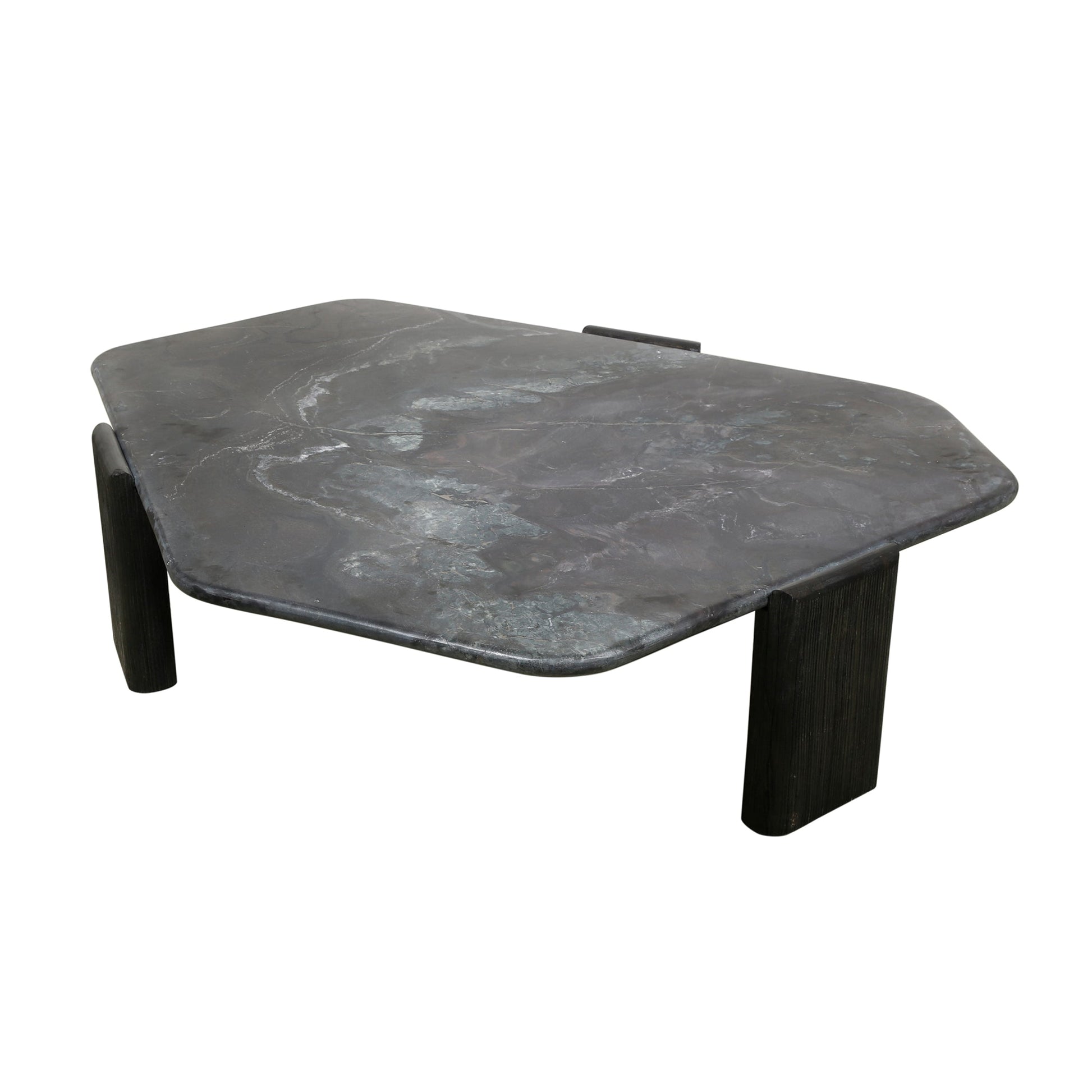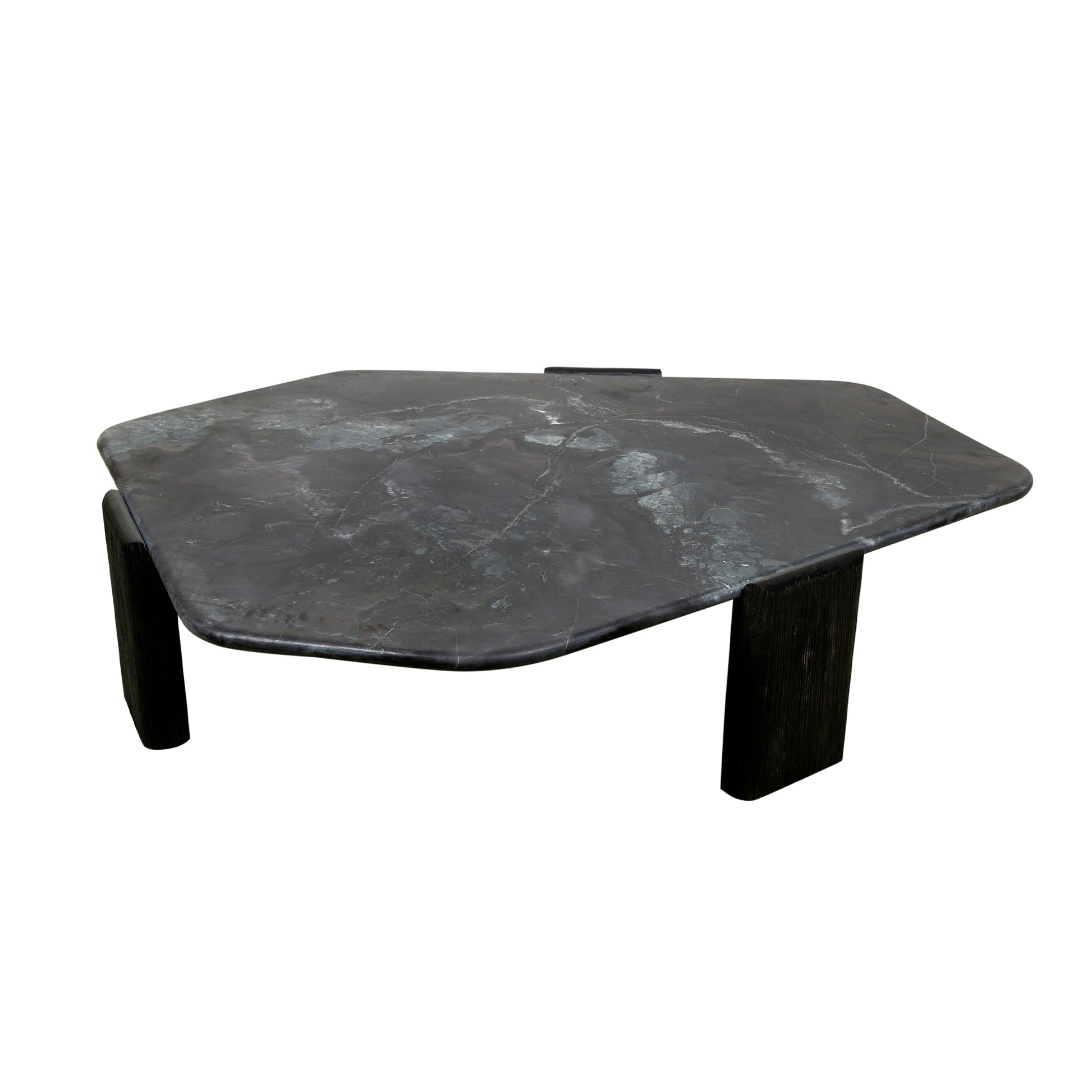 This coffee table makes a bold architectural statement with its geometric design and rich material pairing. The hexagonal lava marble top displays dynamic veining in deep earth tones, creating a natural pattern that shifts with the light. The solid mango wood base in a dark finish provides structure and warmth, grounding the piece with sculptural balance. Designed for spacious interiors, it serves as a striking centerpiece that blends organic texture with refined craftsmanship.