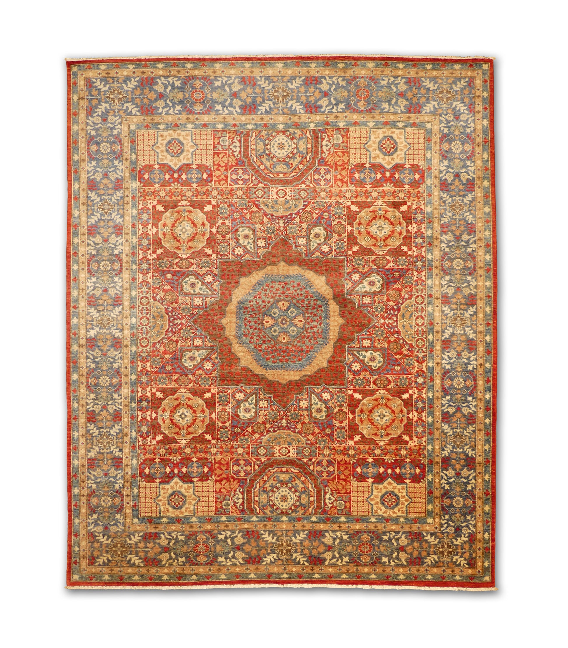 This hand-knotted rug showcases the classic symmetry of Mamluk design, with a bold central medallion framed by layers of octagons and geometric stars. The rust-red field is enlivened with intricate blue, ivory, and beige motifs, creating a detailed yet harmonious composition. A richly decorated border completes the look, adding depth and balance. Its precise craftsmanship and vibrant palette make it a striking choice for both traditional and eclectic interiors.