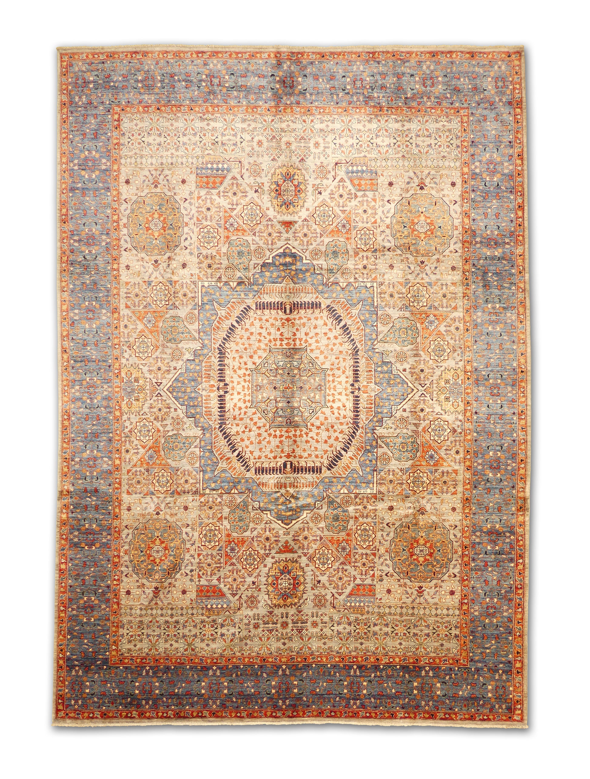 This handmade rug features an intricate central medallion surrounded by a complex field of geometric motifs and floral rosettes, all balanced within a structured framework. The soft ivory ground beautifully contrasts with the faded coral, denim blue, and muted teal tones, lending it an airy and vintage charm. The detailed craftsmanship and harmonious color transitions create a refined yet inviting presence, ideal for both classic and transitional interiors.