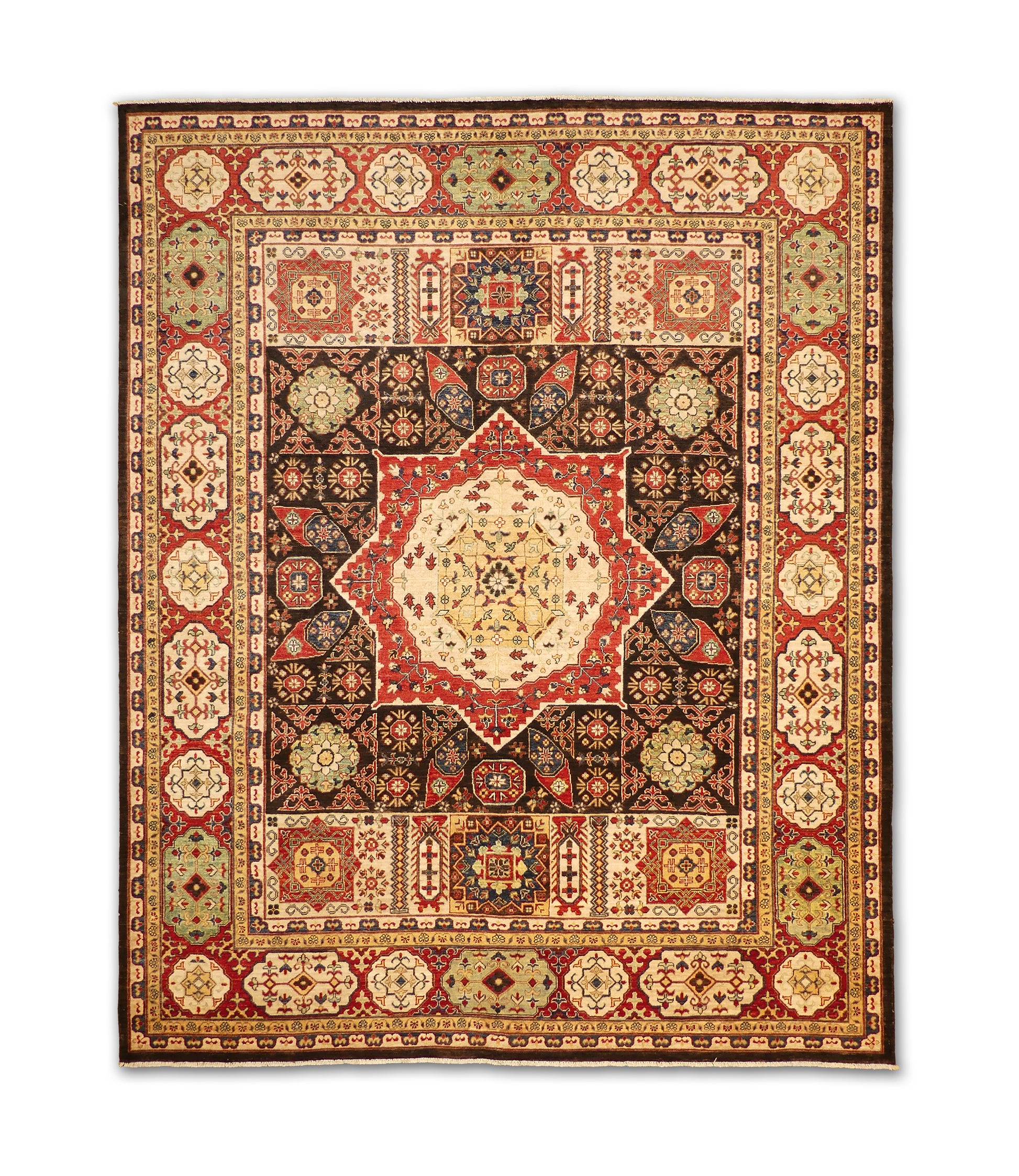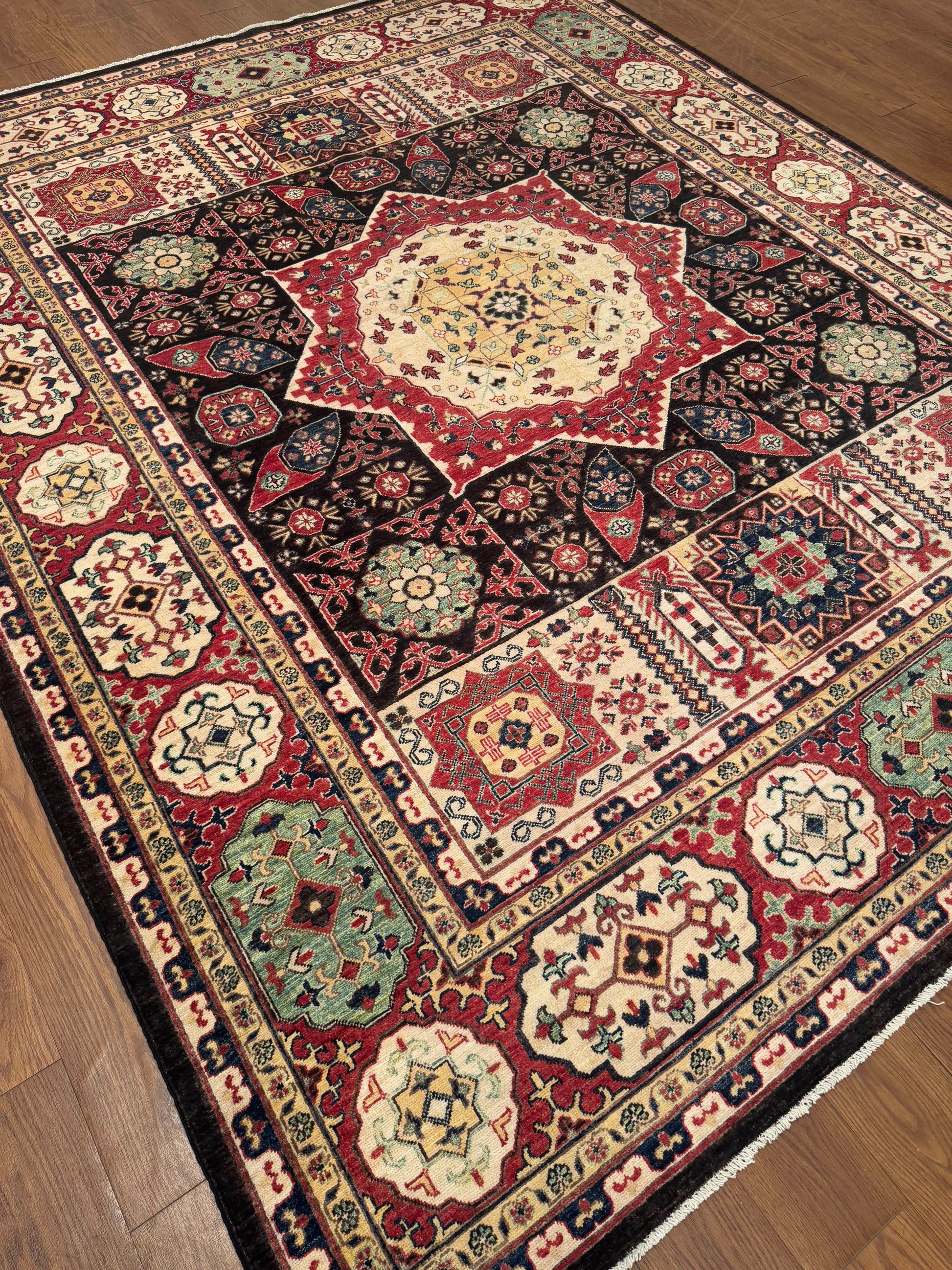 This handwoven rug features a striking central medallion in ivory and red, set against a deep black field filled with intricate floral and geometric motifs. Accents of green, navy, and cream bring depth and balance, while the detailed border frames the piece with symmetry and refinement. Woven from fine wool, this rug blends durability with timeless artistry, making it a bold statement in any room.