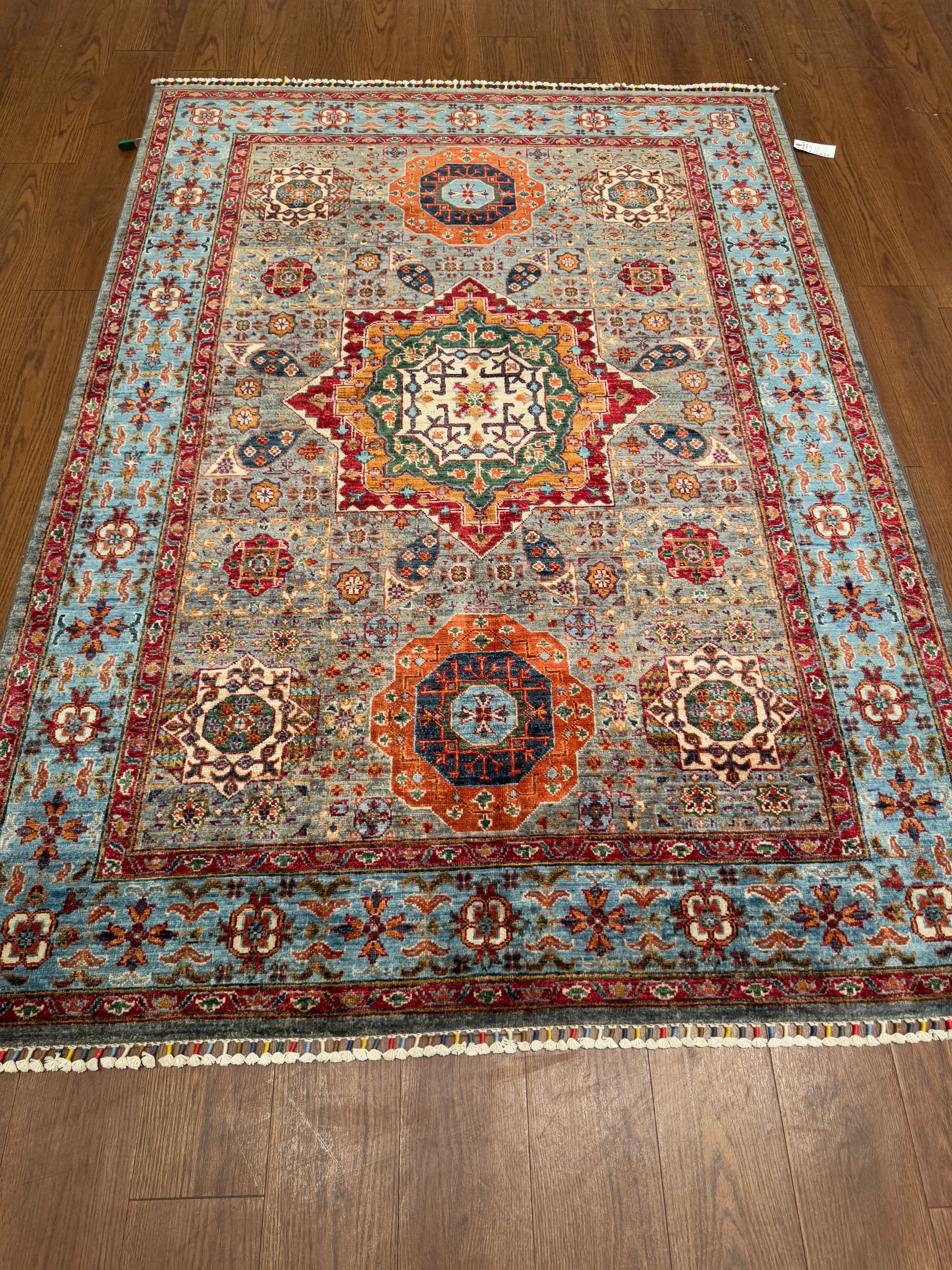 This handwoven Caucasian rug displays a captivating design centered around a large multi-colored medallion, framed by smaller octagonal medallions across a soft grey-blue field. The intricate border features sky-blue bands filled with stylized floral and geometric motifs, adding balance to its bold structure. With hues of red, orange, green, blue, and ivory, the rug radiates both vibrance and tradition, making it a statement piece for any room.