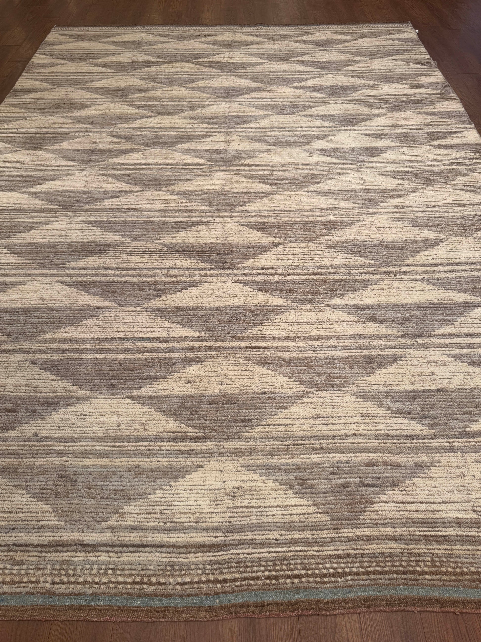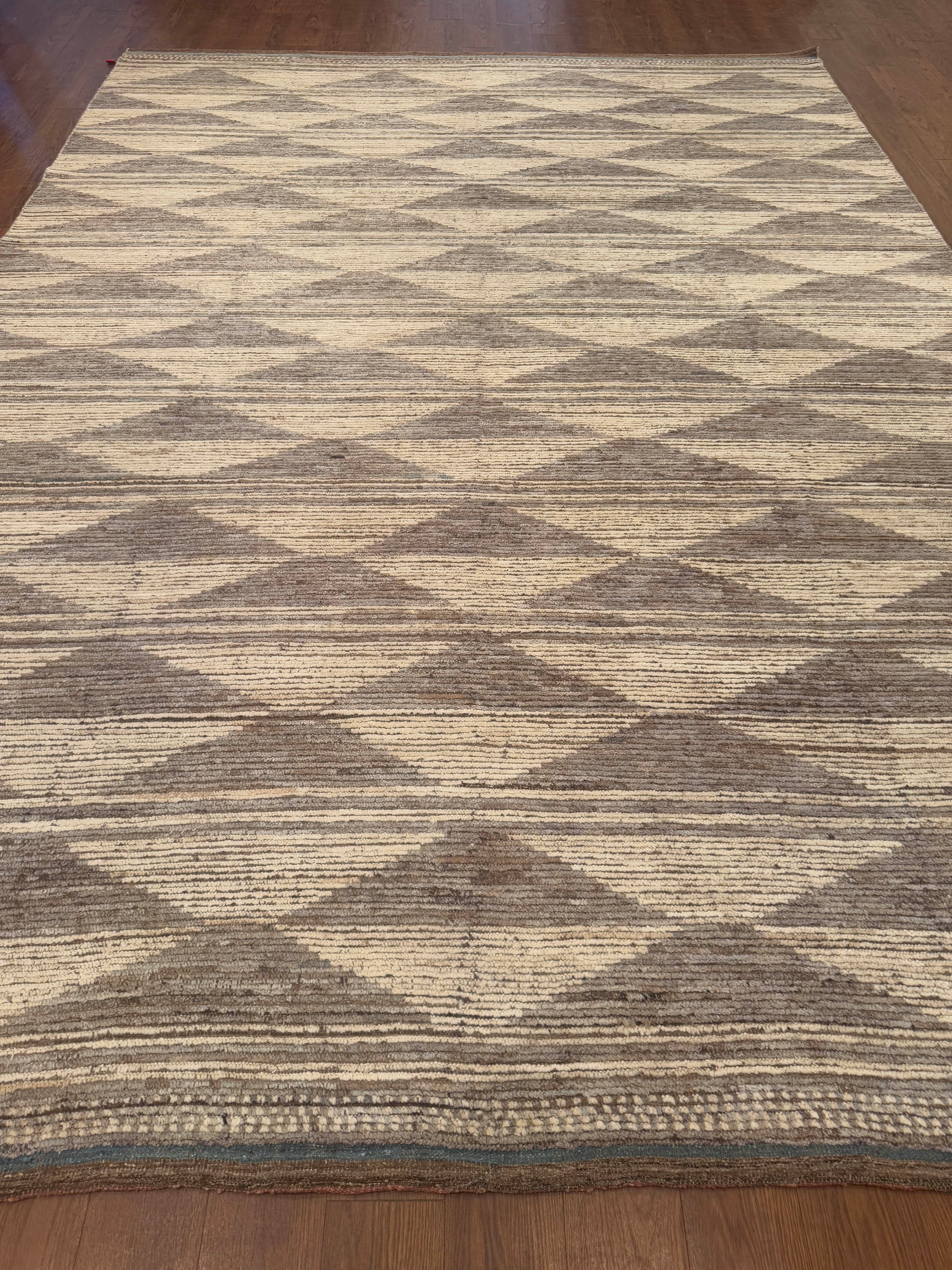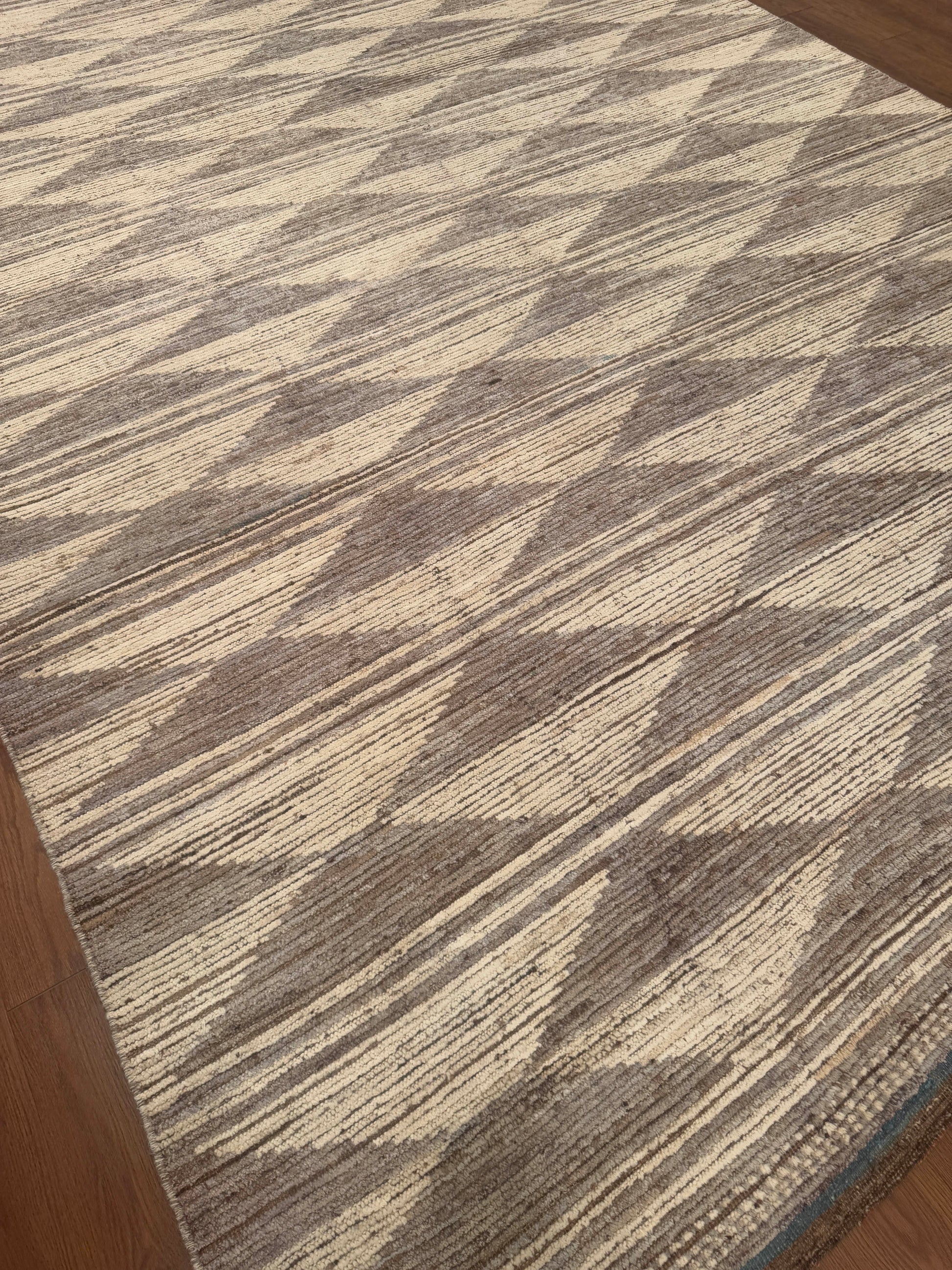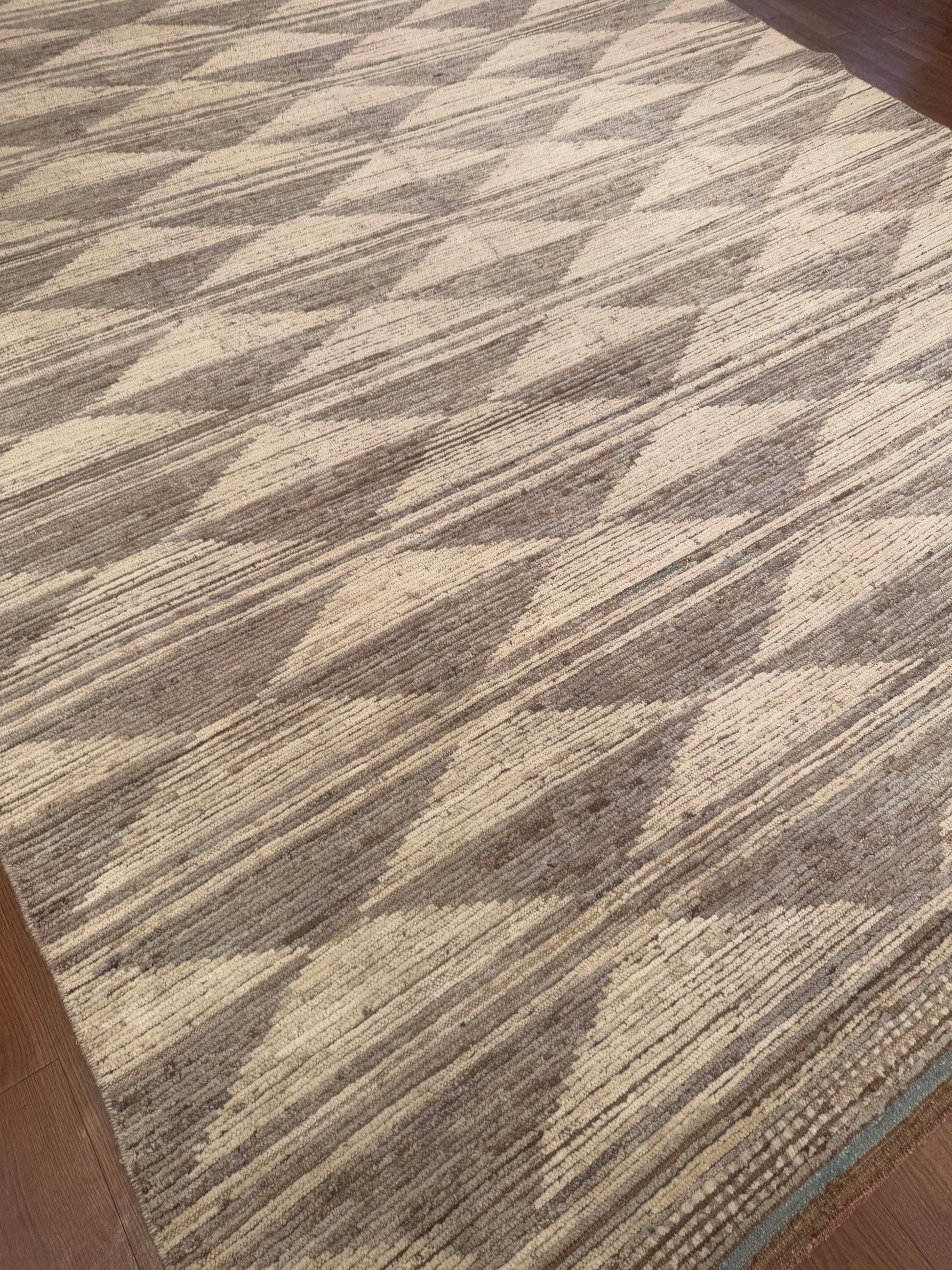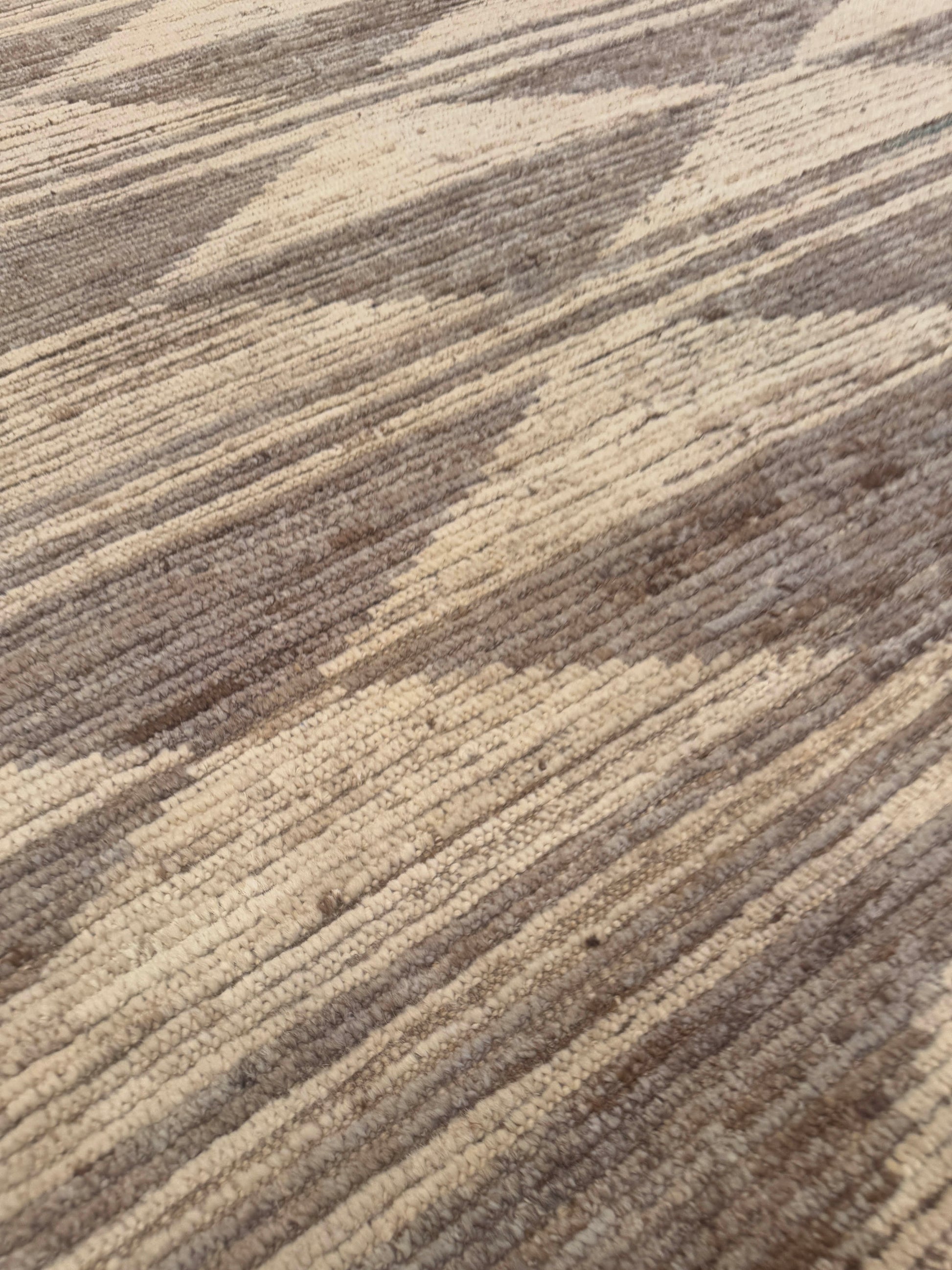 This handwoven rug features a minimalist tribal aesthetic with repeating diamond motifs arranged in horizontal rows. The neutral palette of beige and taupe creates a soft, earthy tone that highlights the simple geometry. Its understated elegance makes it adaptable for both modern and rustic spaces, providing texture without overwhelming the room.