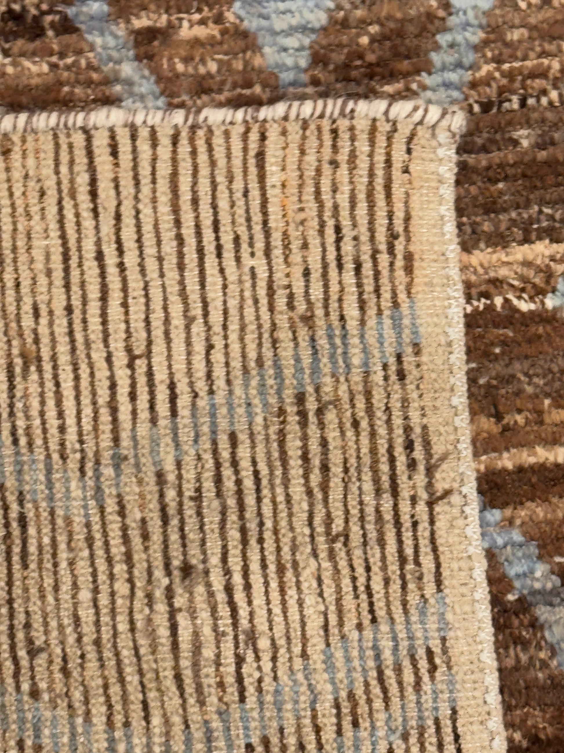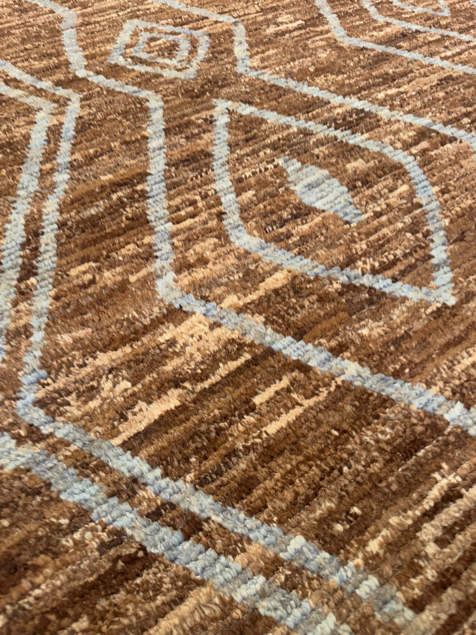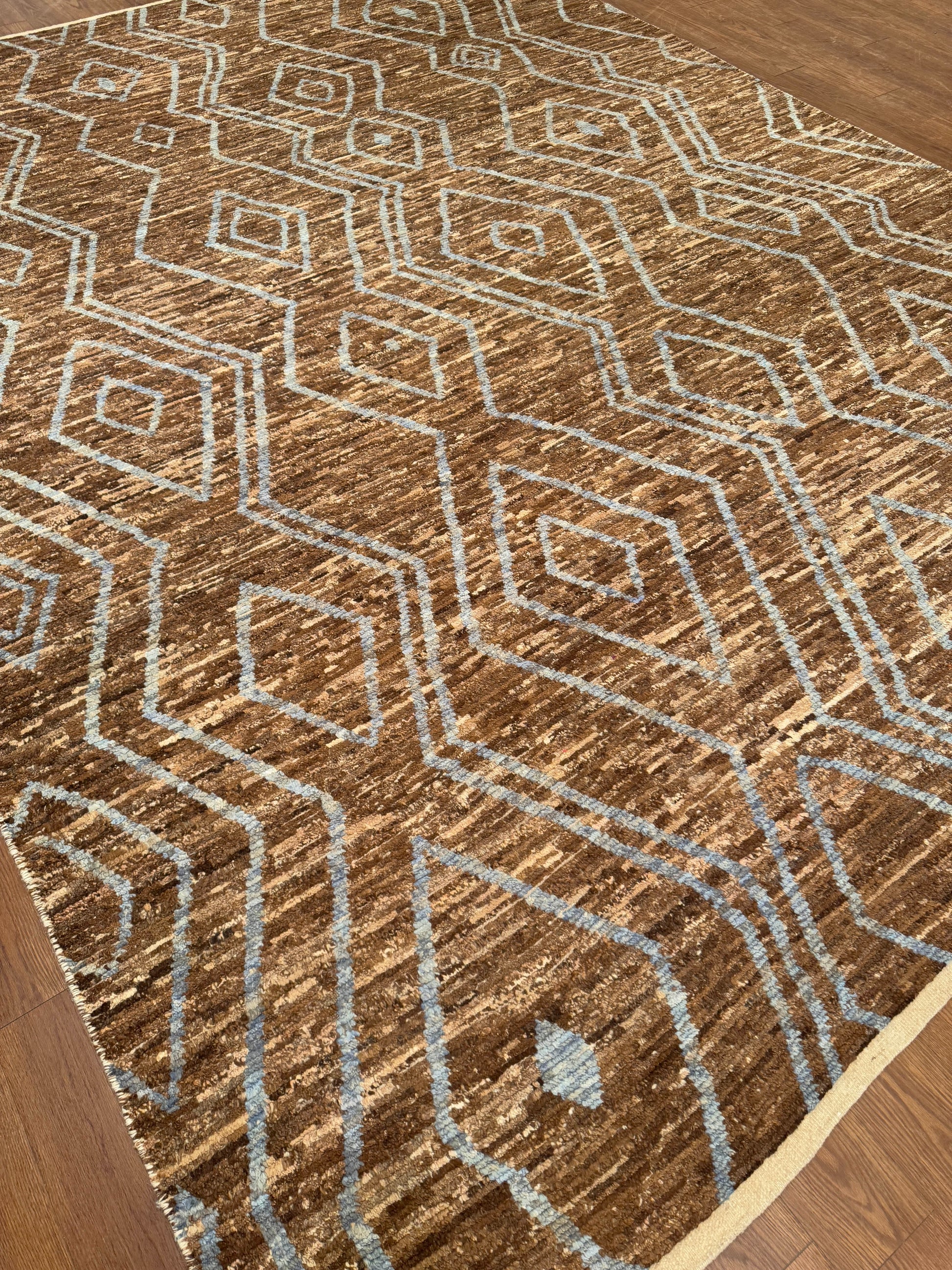 This striking handwoven rug features layered geometric diamond motifs outlined in soft blue over a rich brown field. The design creates a sense of movement and depth, blending tribal inspiration with a modern edge. Crafted from wool, it offers both warmth and durability while adding a bold statement to any room.