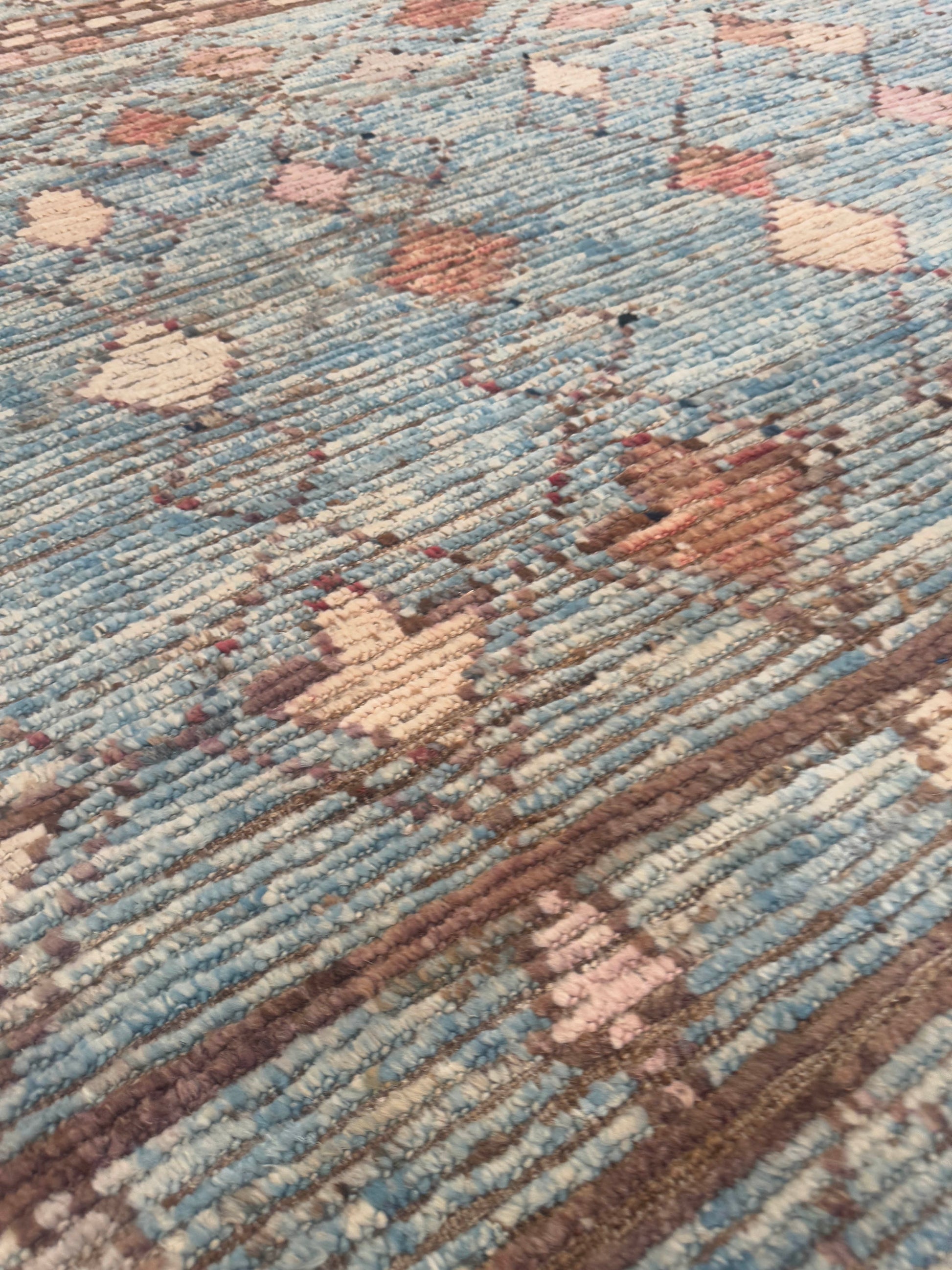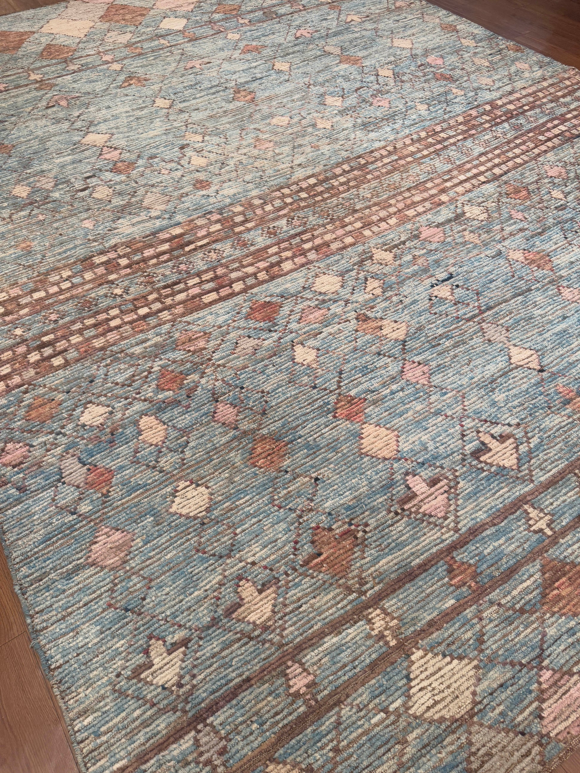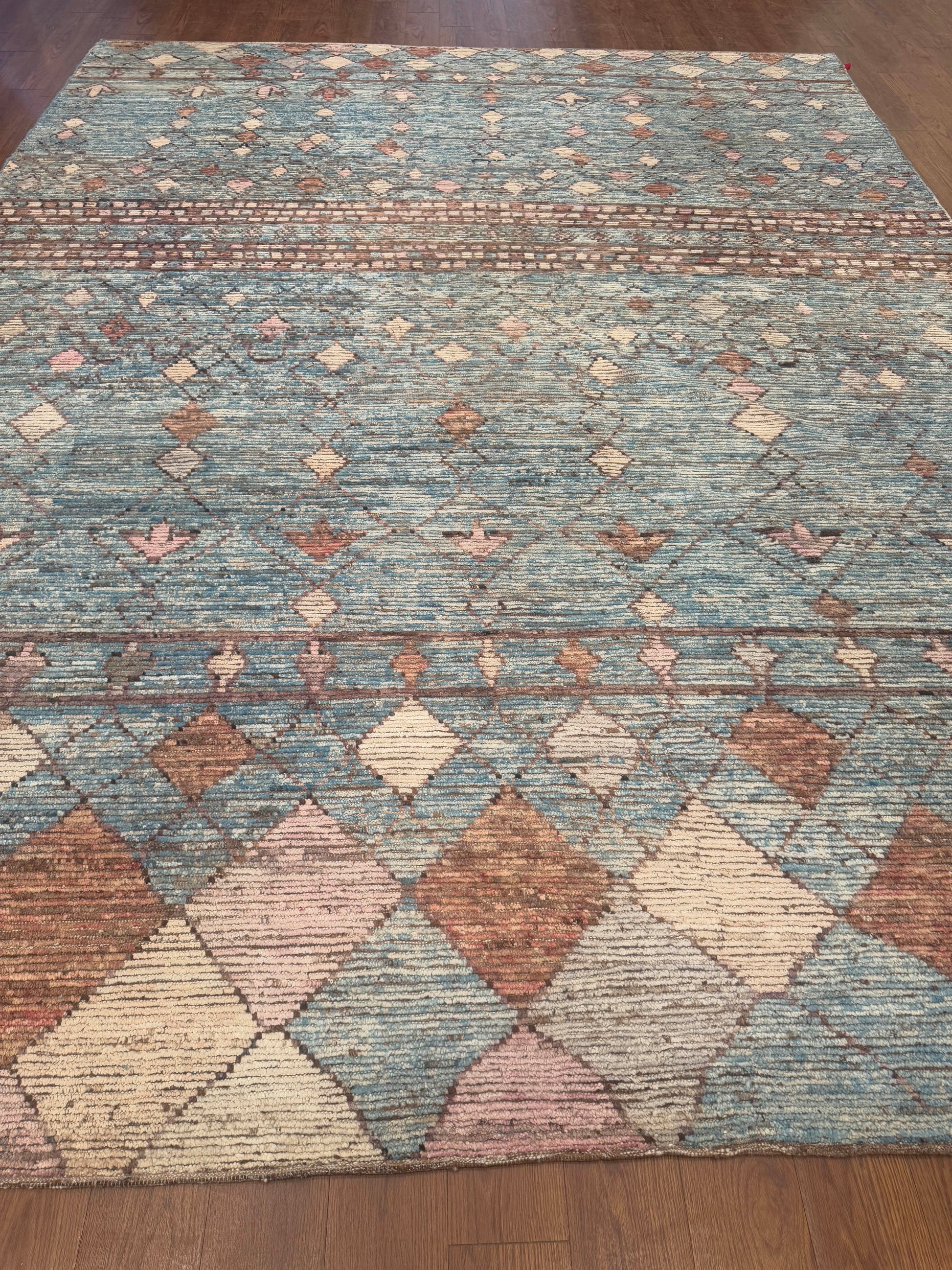 This handwoven rug features a striking tribal-inspired diamond lattice pattern across a soft blue ground with accents of ivory, blush, and earthy browns. The layered, geometric design is balanced by subtle color variations, giving it a vintage-meets-modern appeal. Its wool texture provides both durability and warmth, making it a timeless statement piece.