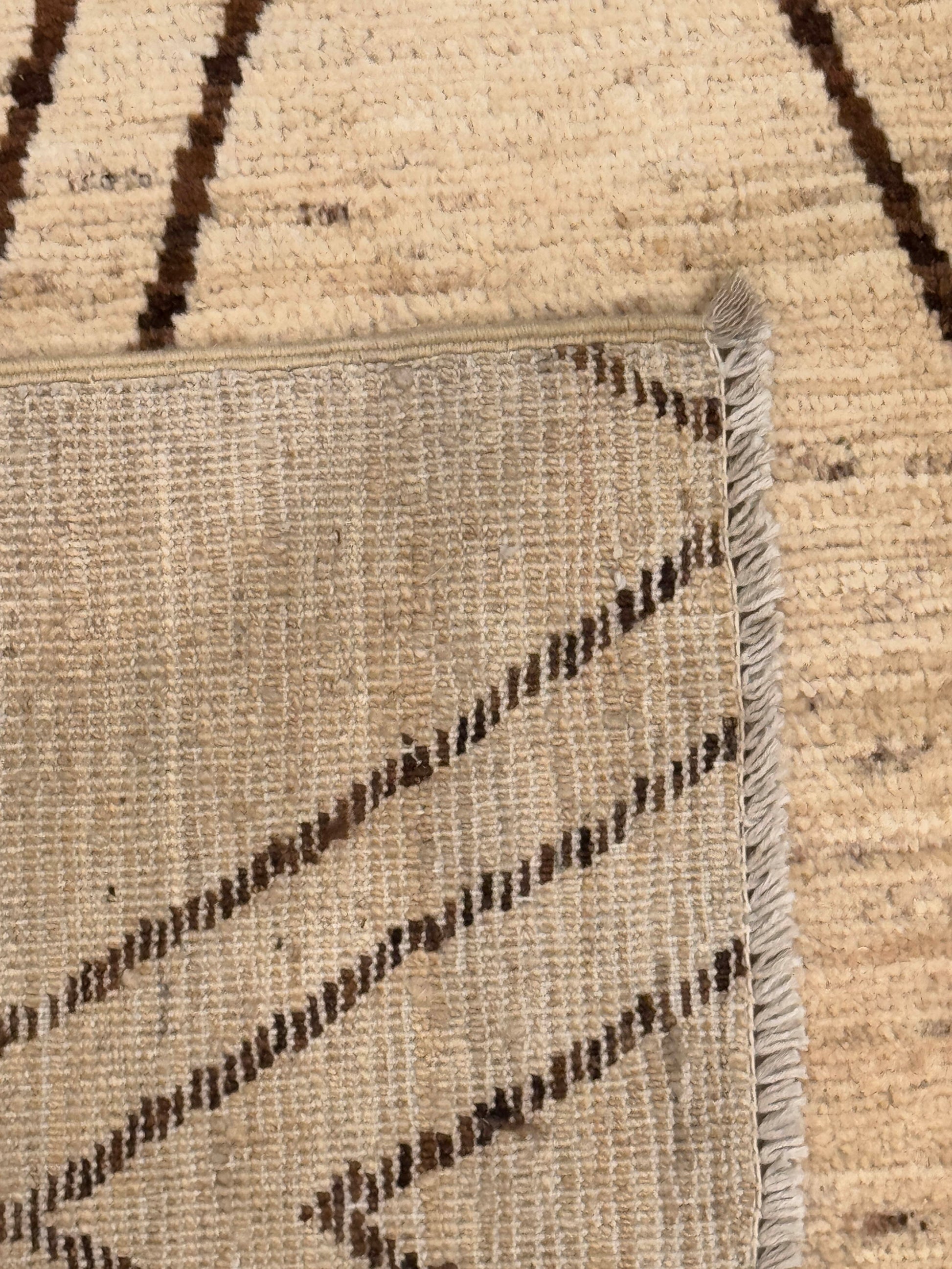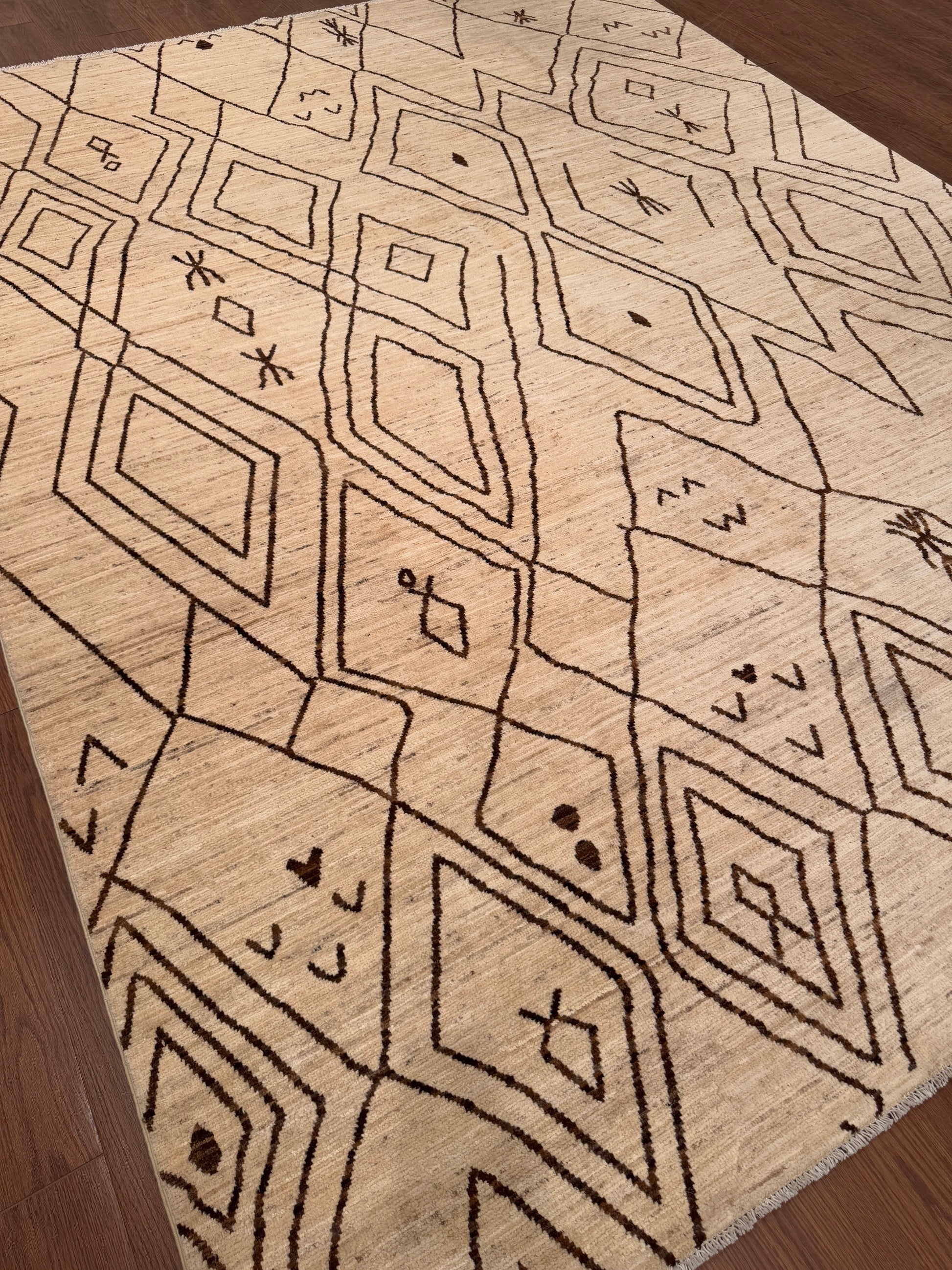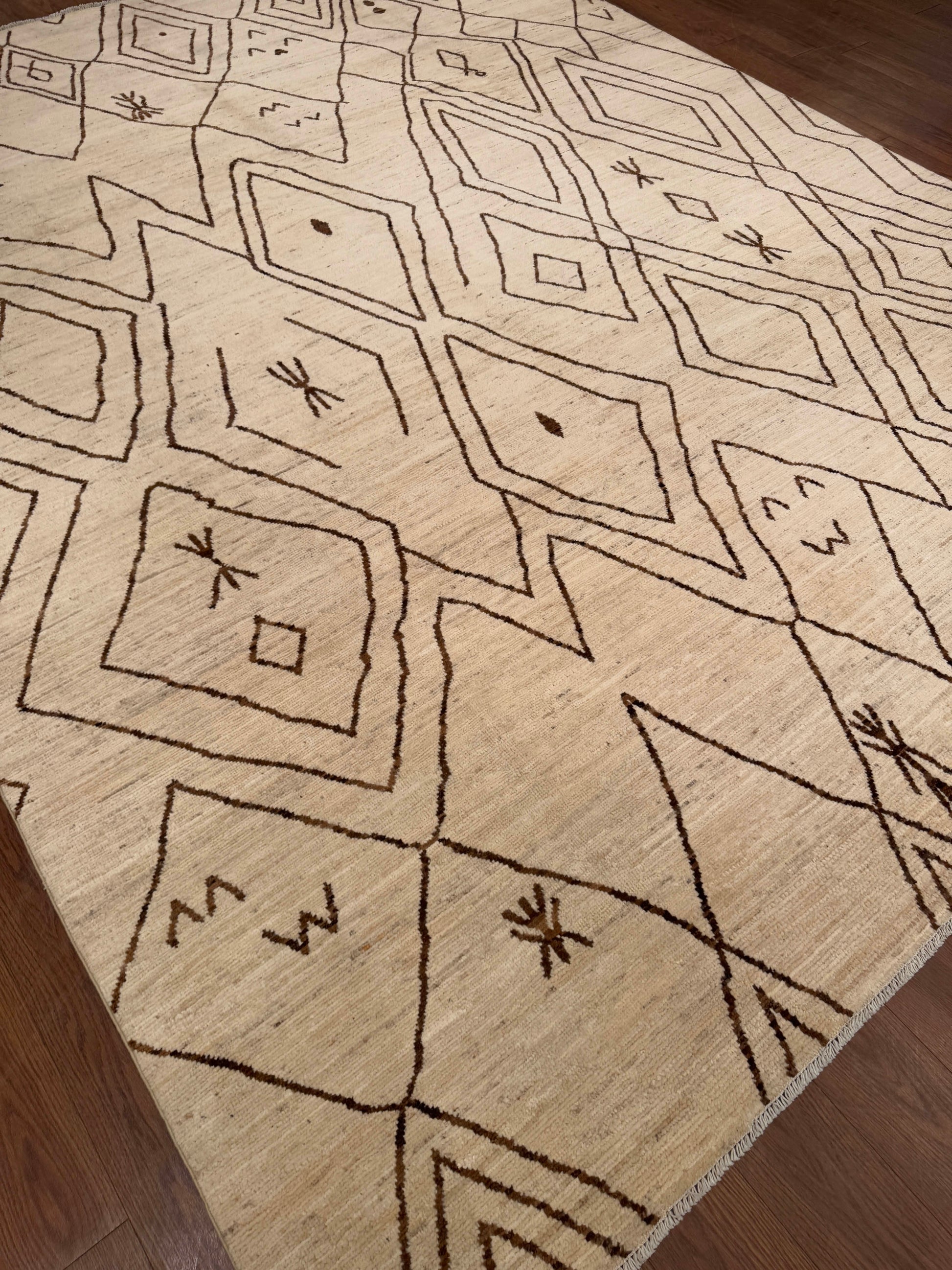 This handmade rug showcases a minimalist geometric design inspired by tribal artistry. The cream base is accented by bold brown linear patterns, forming diamonds and abstract symbols that convey both rhythm and balance. Its neutral palette and modern simplicity make it a versatile piece for a range of interiors, from bohemian to Scandinavian-inspired homes.
