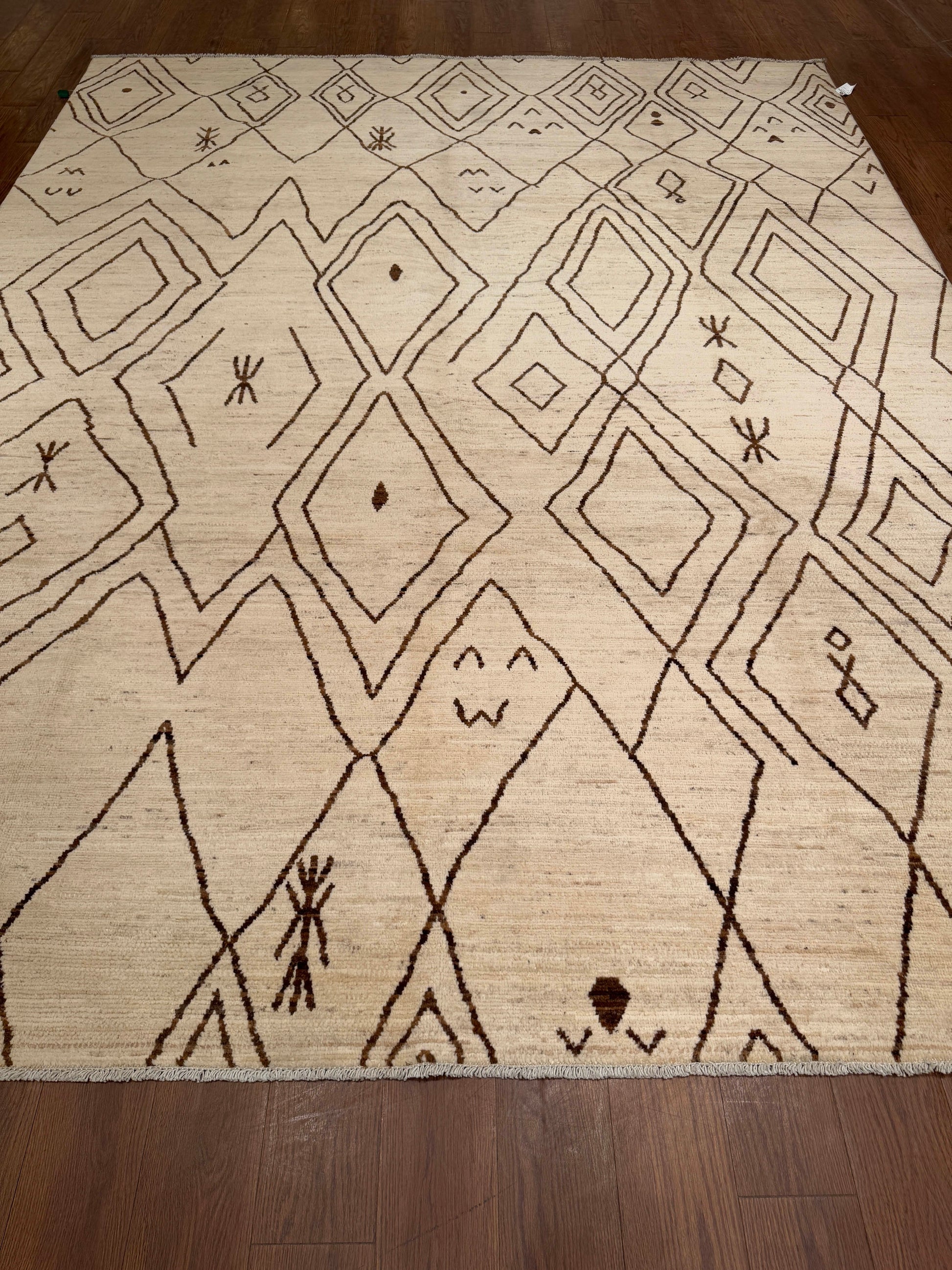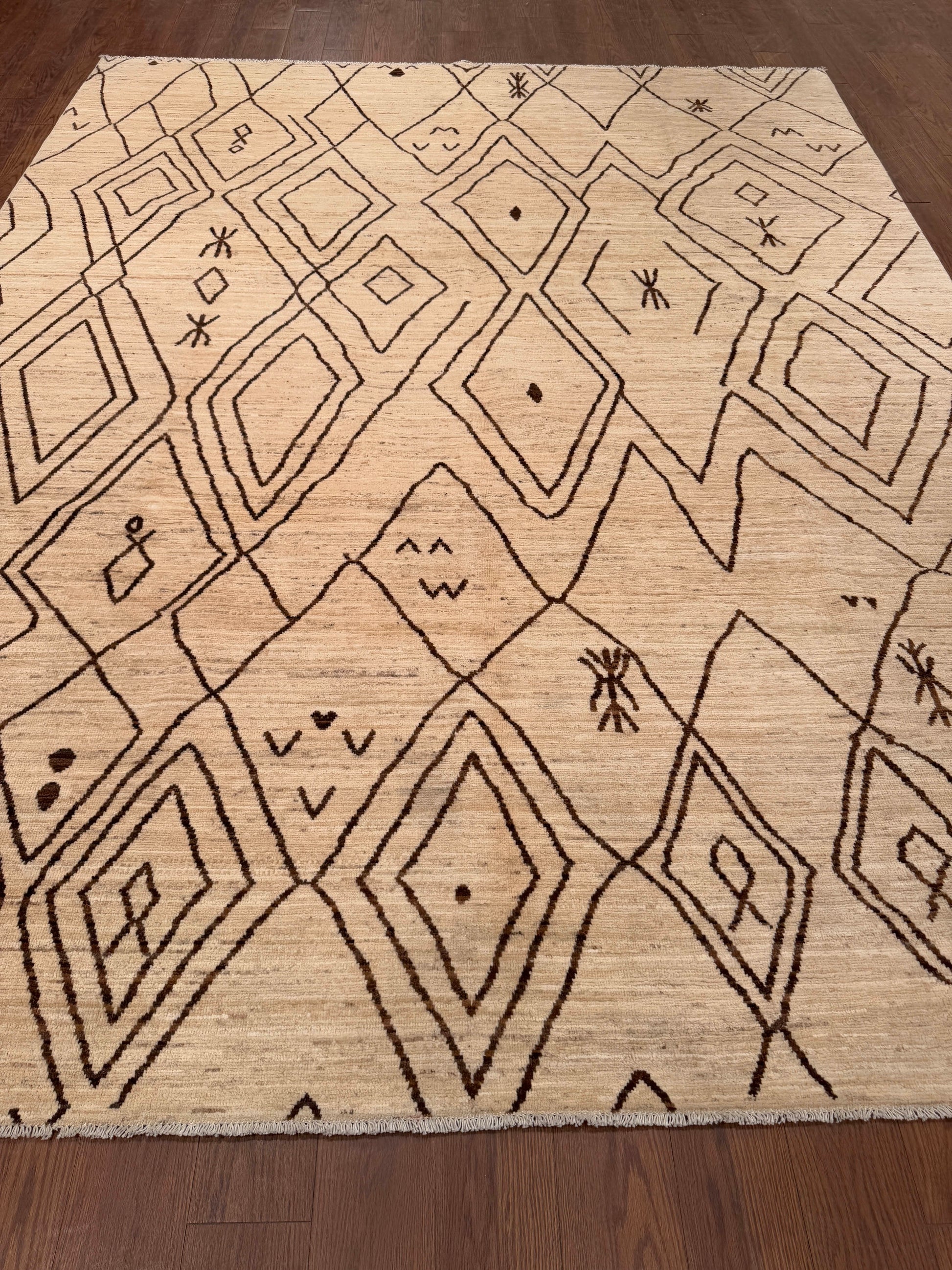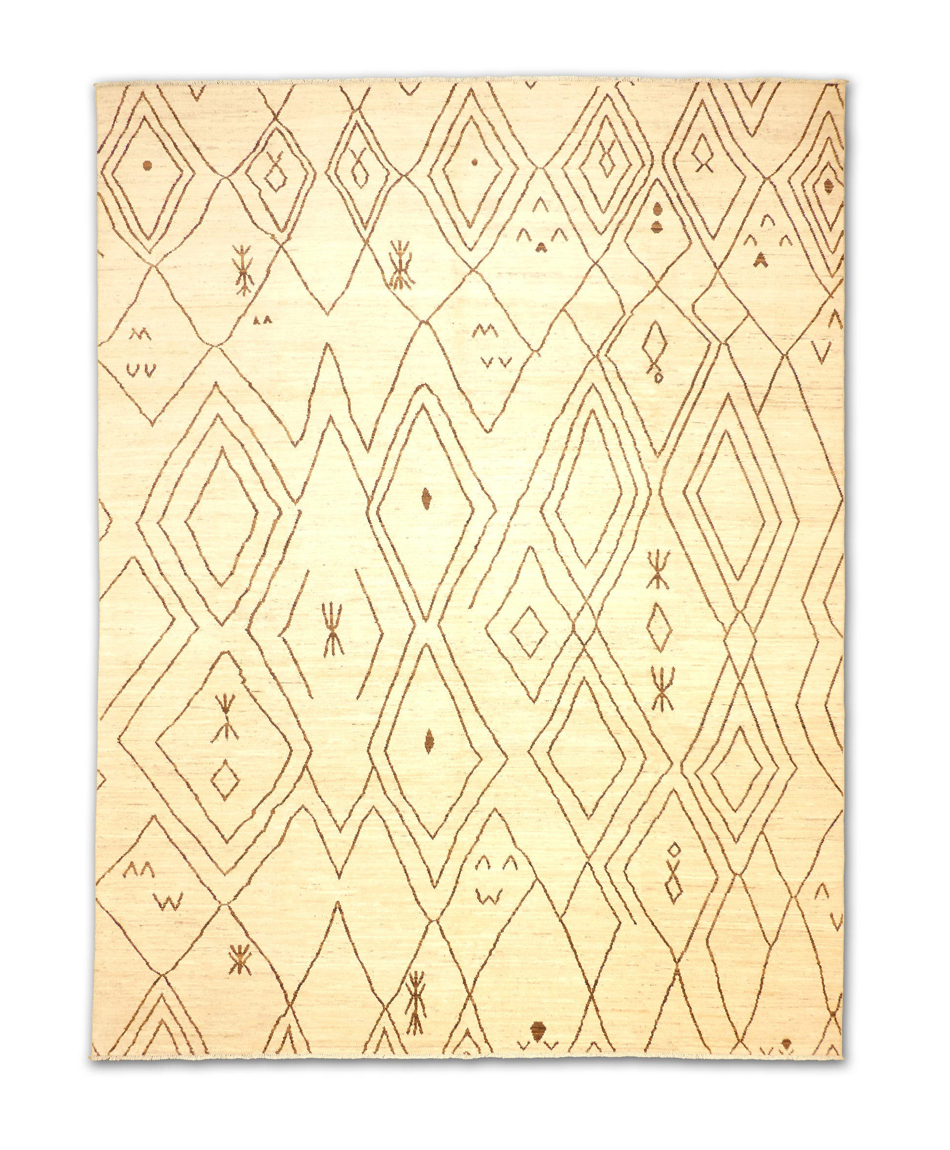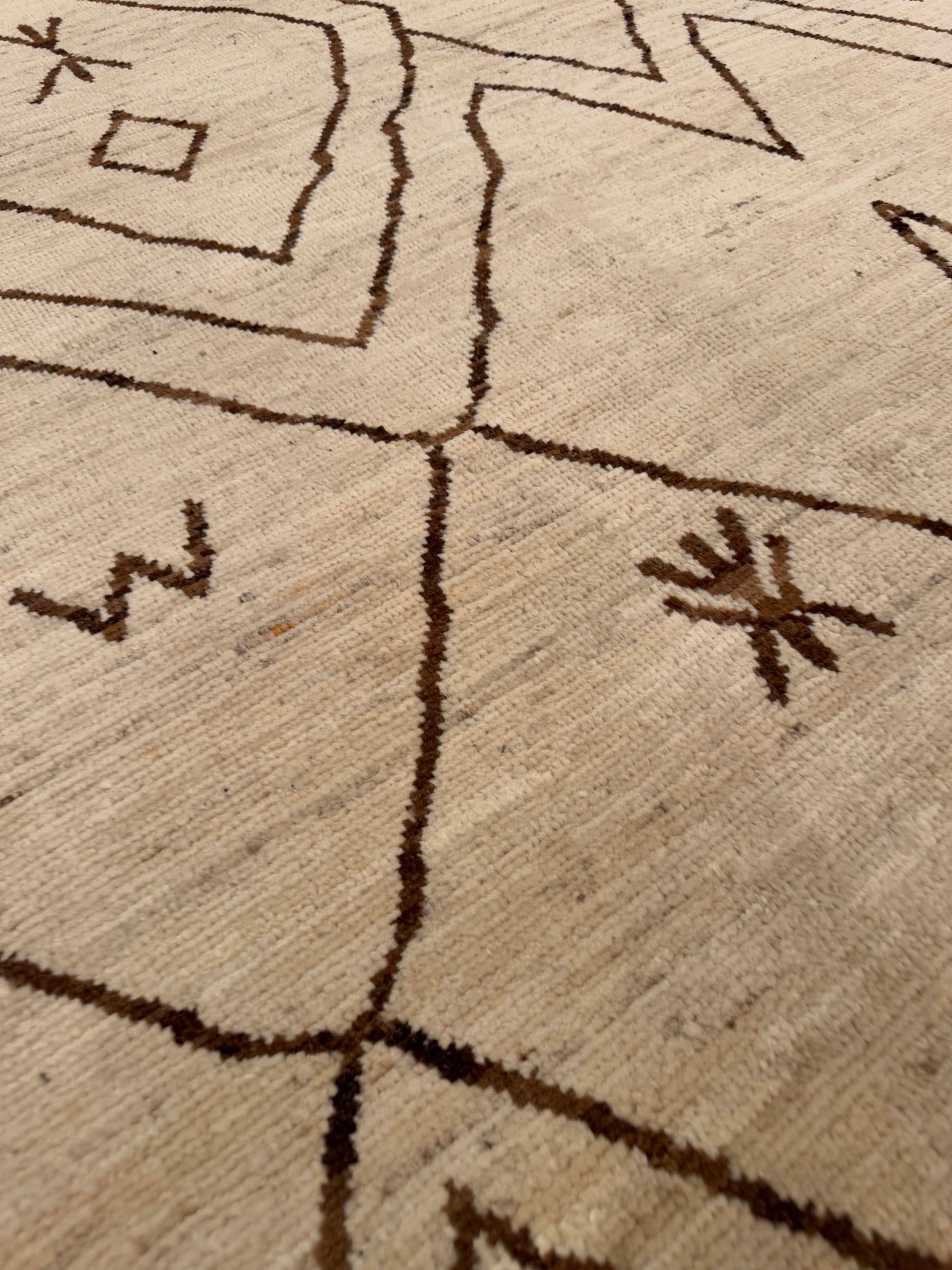 This handmade rug showcases a minimalist geometric design inspired by tribal artistry. The cream base is accented by bold brown linear patterns, forming diamonds and abstract symbols that convey both rhythm and balance. Its neutral palette and modern simplicity make it a versatile piece for a range of interiors, from bohemian to Scandinavian-inspired homes.