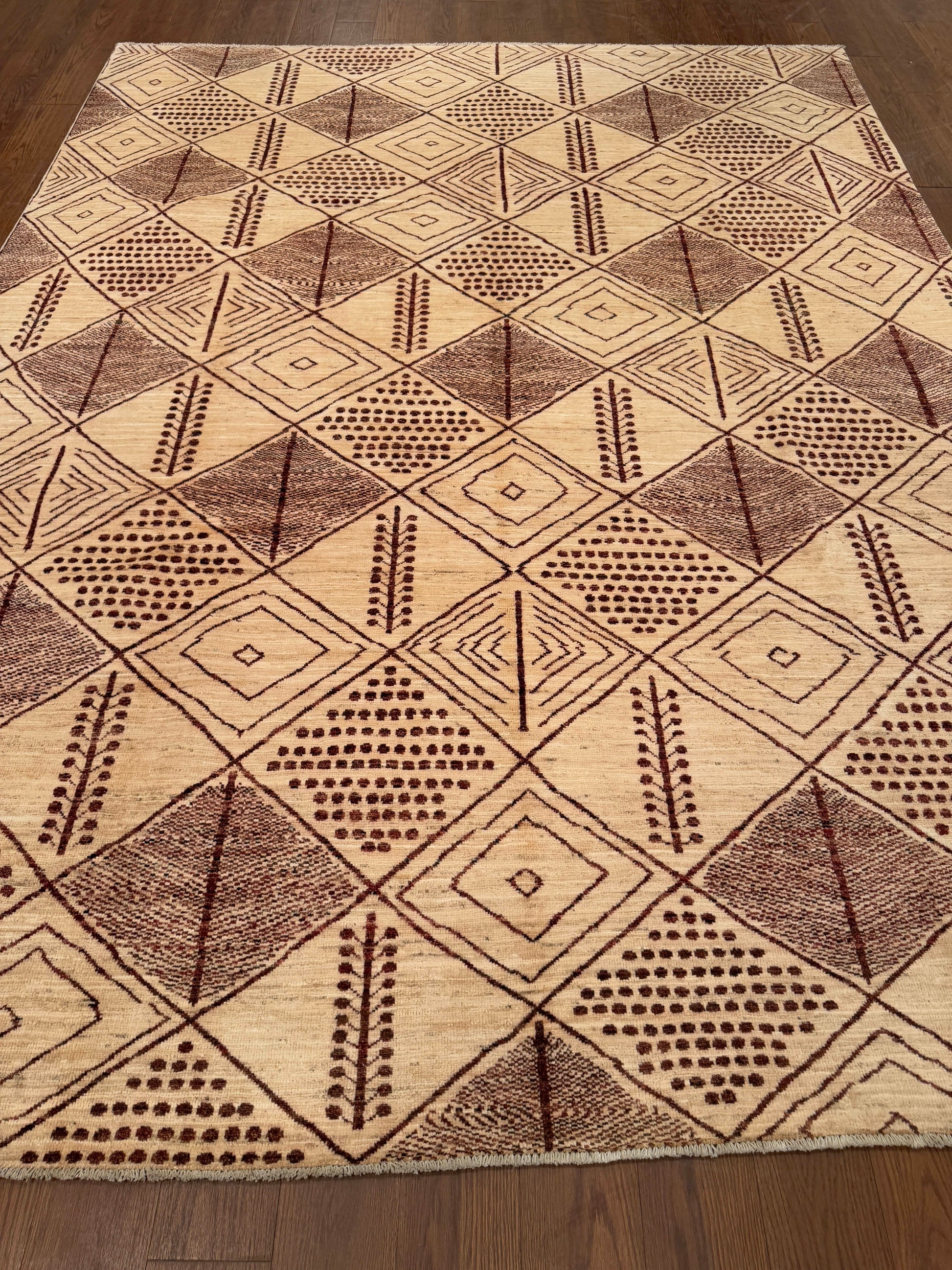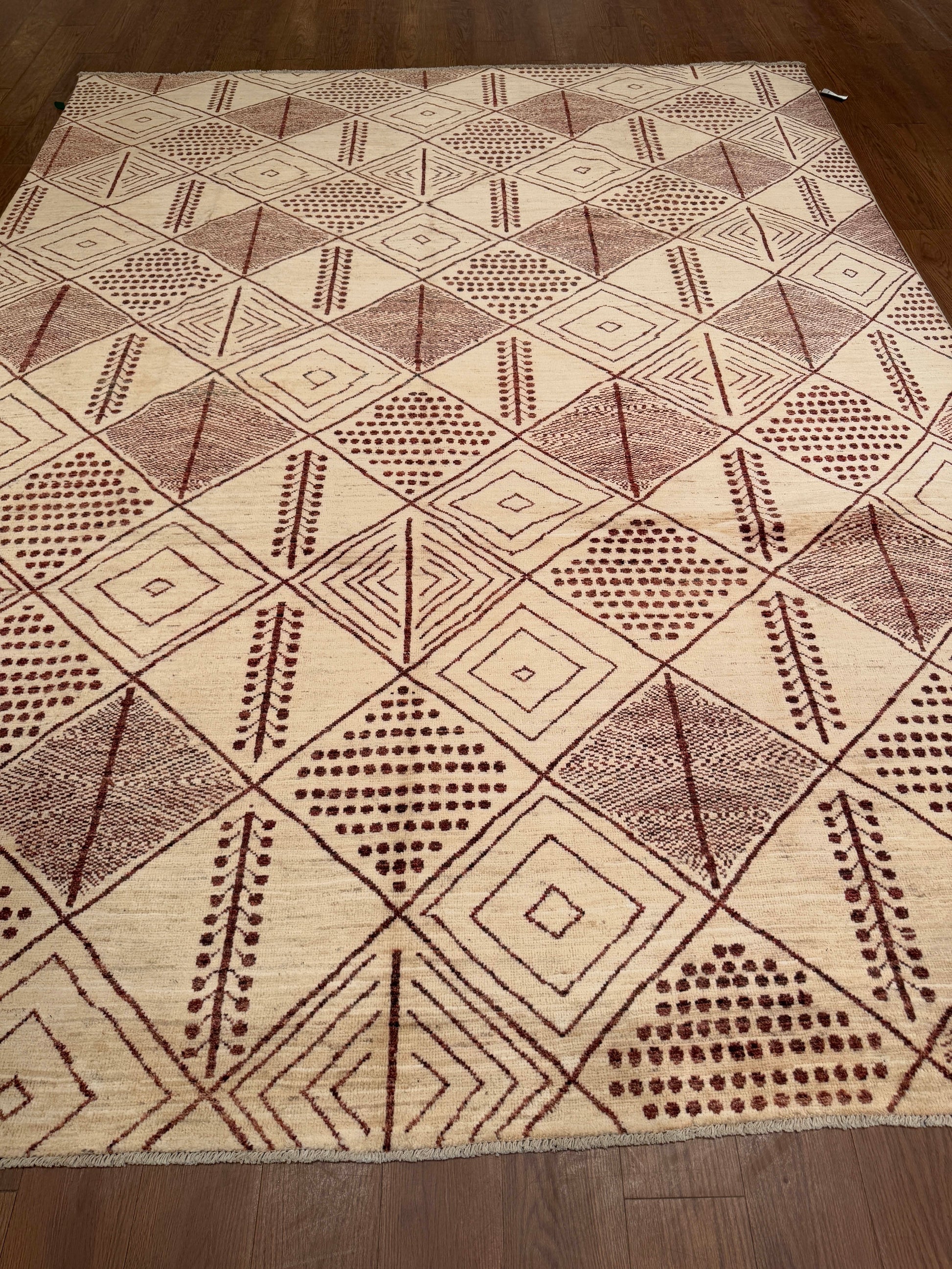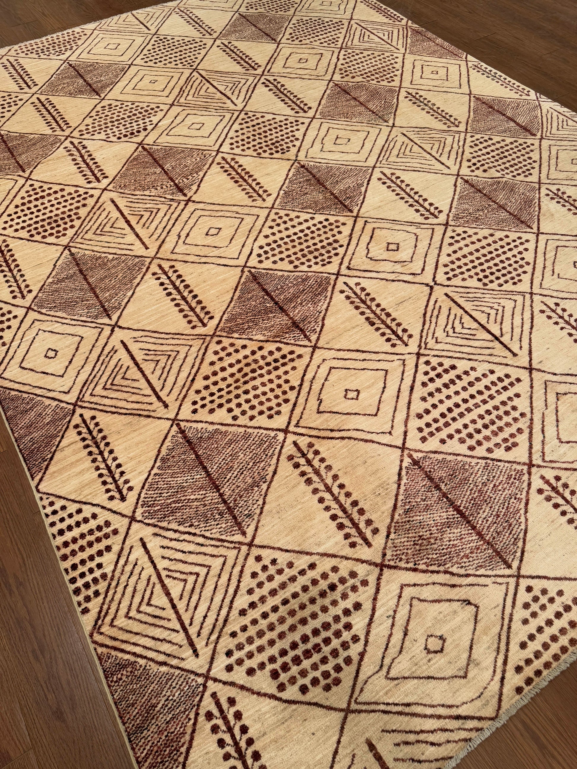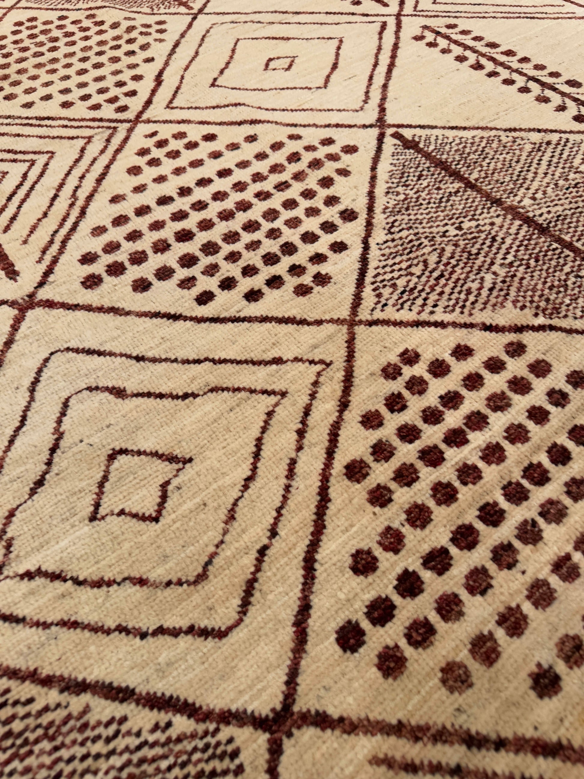 This handmade rug showcases a striking geometric lattice of diamond motifs, each filled with varied linear and dotted patterns that create texture and rhythm. The soft ivory background beautifully contrasts with the warm terracotta and rust tones, lending it a contemporary yet organic appeal. Its playful symmetry and earthy palette make it an ideal statement piece for modern, boho, or eclectic interiors.