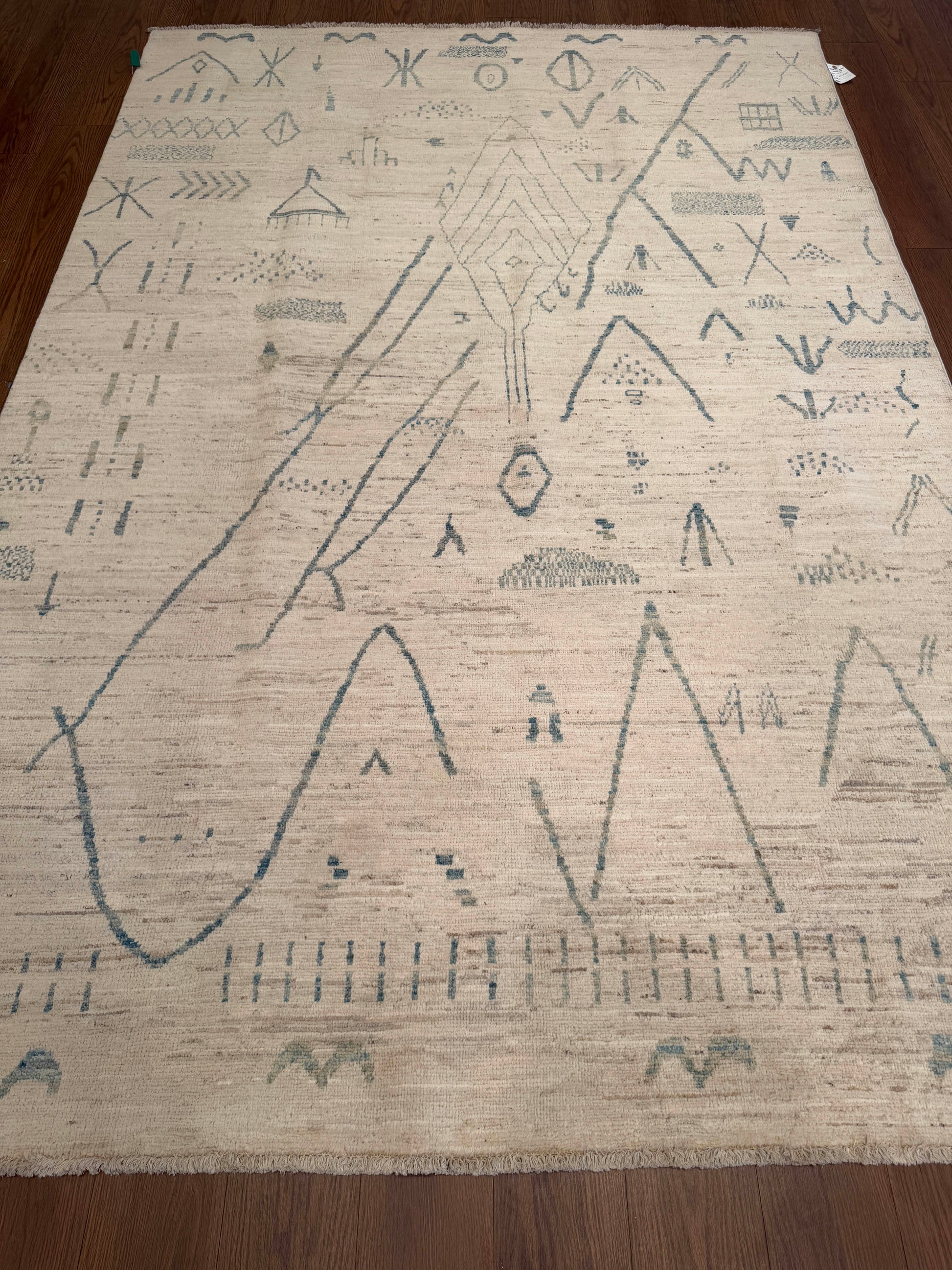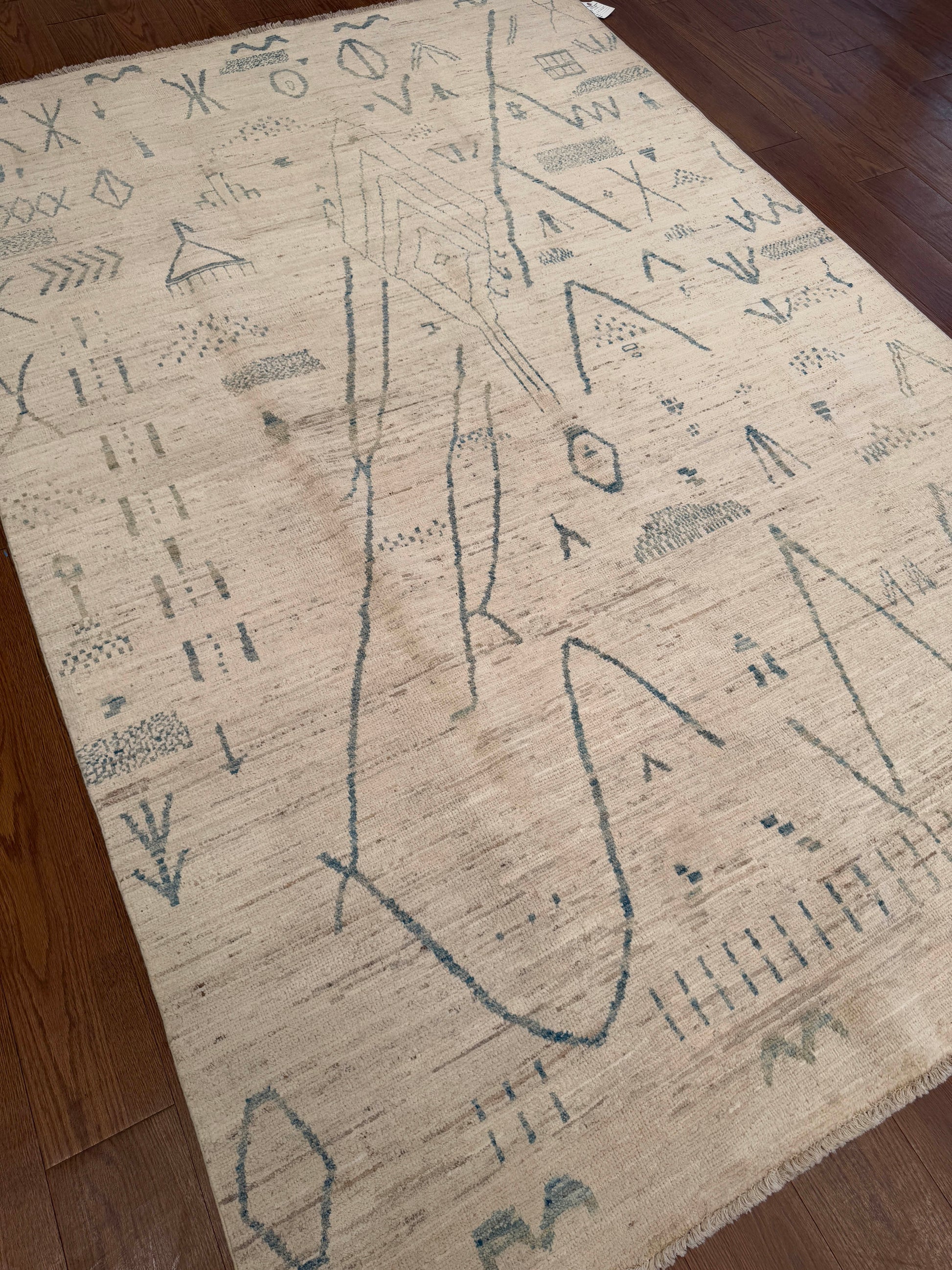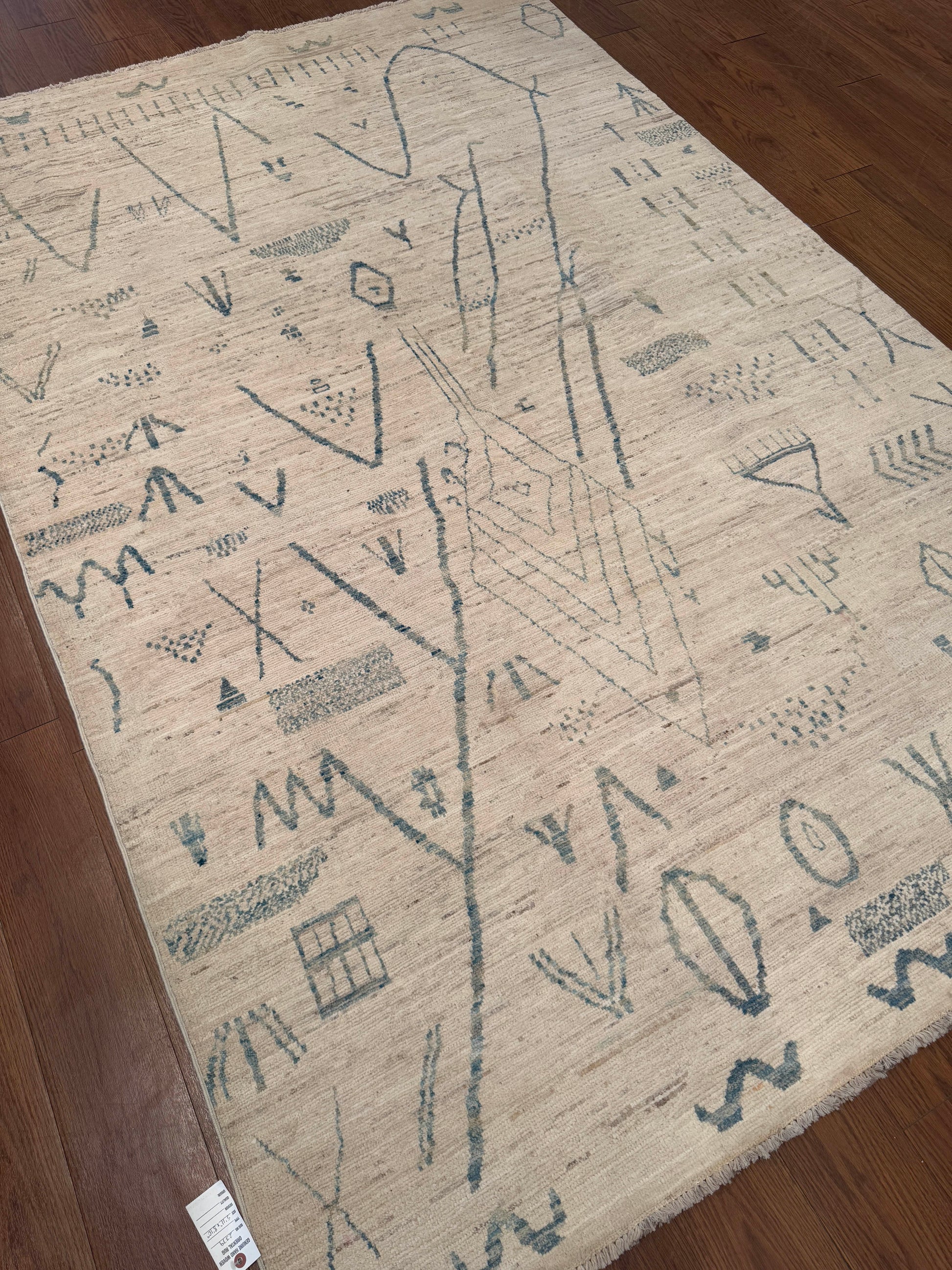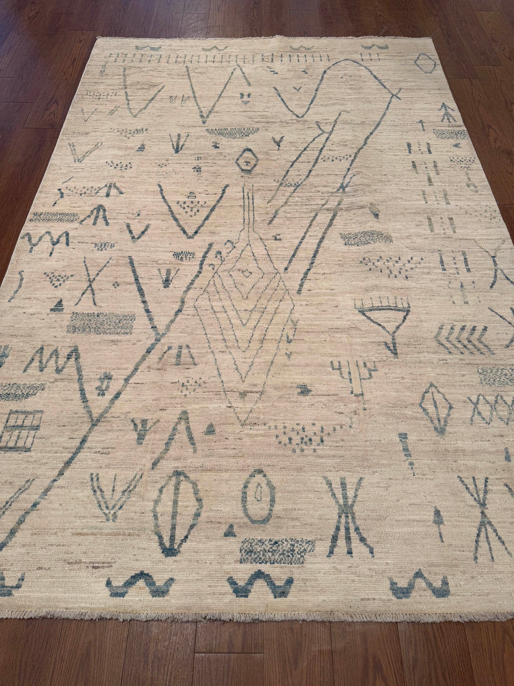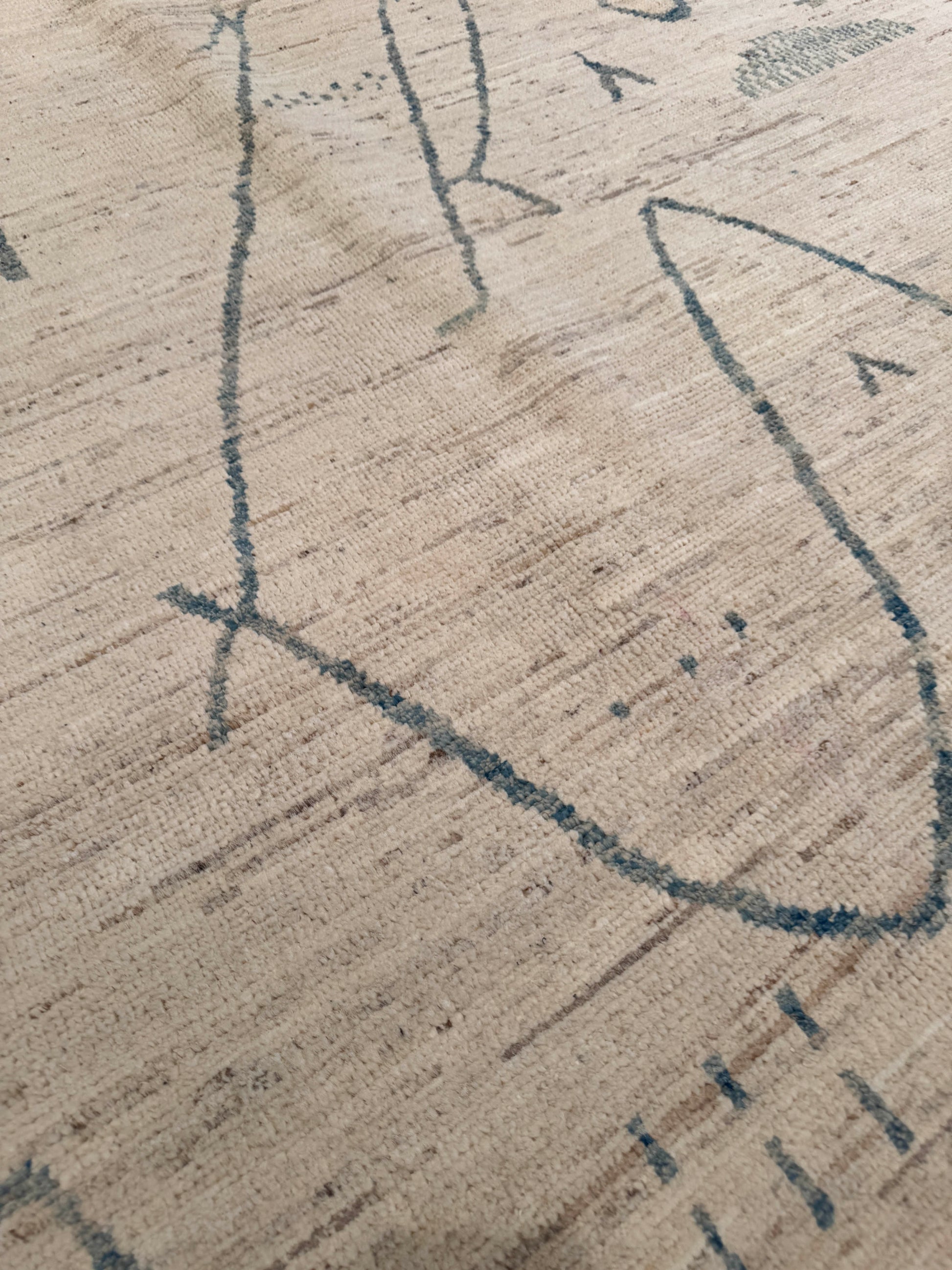 This handwoven wool rug features a minimalist, tribal-inspired design with abstract linear and geometric motifs. Its neutral beige field is accented by subtle blue-gray patterns, giving it a modern yet organic appeal. With its understated elegance, this piece effortlessly bridges traditional craftsmanship and contemporary style.