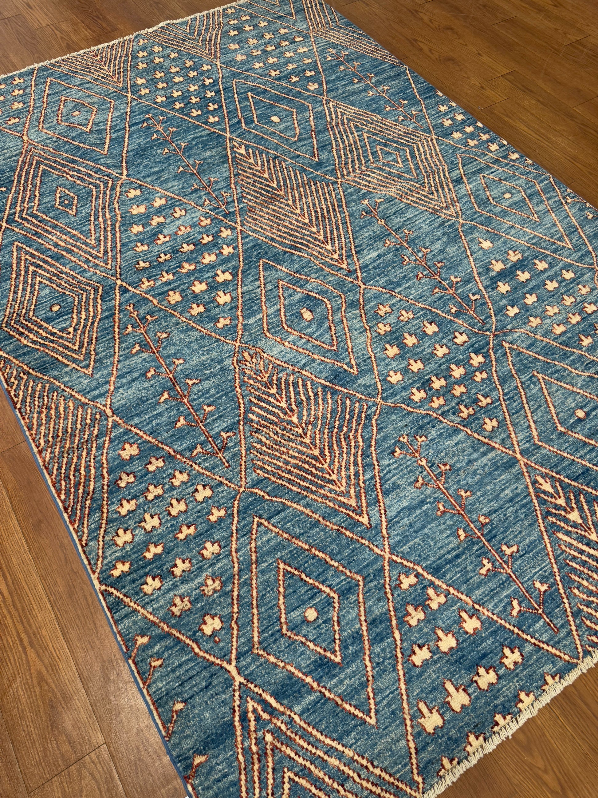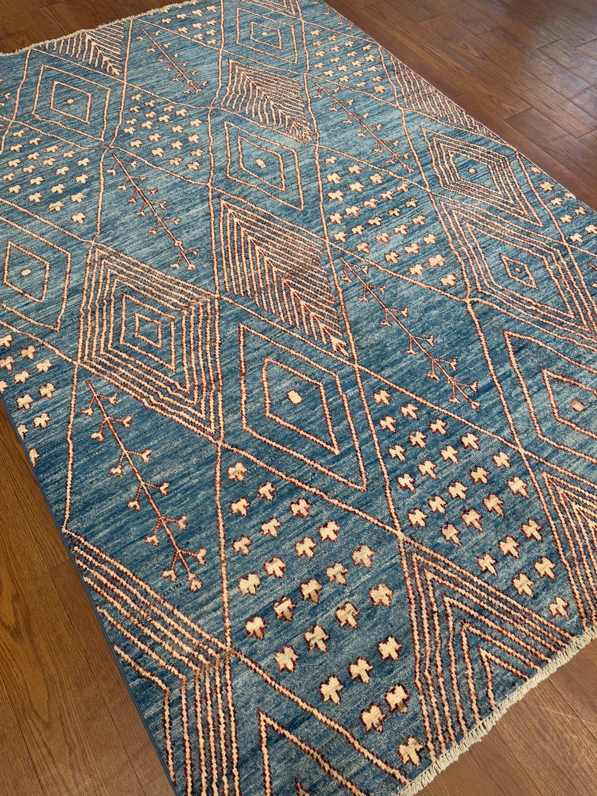 This handmade rug features a striking tribal-inspired design with diamond motifs, geometric lines, and abstract accents. The deep blue field is beautifully contrasted by warm ivory and rust patterns, giving it both vibrancy and depth. Woven from high-quality wool, it offers durability and timeless style for modern or eclectic interiors.