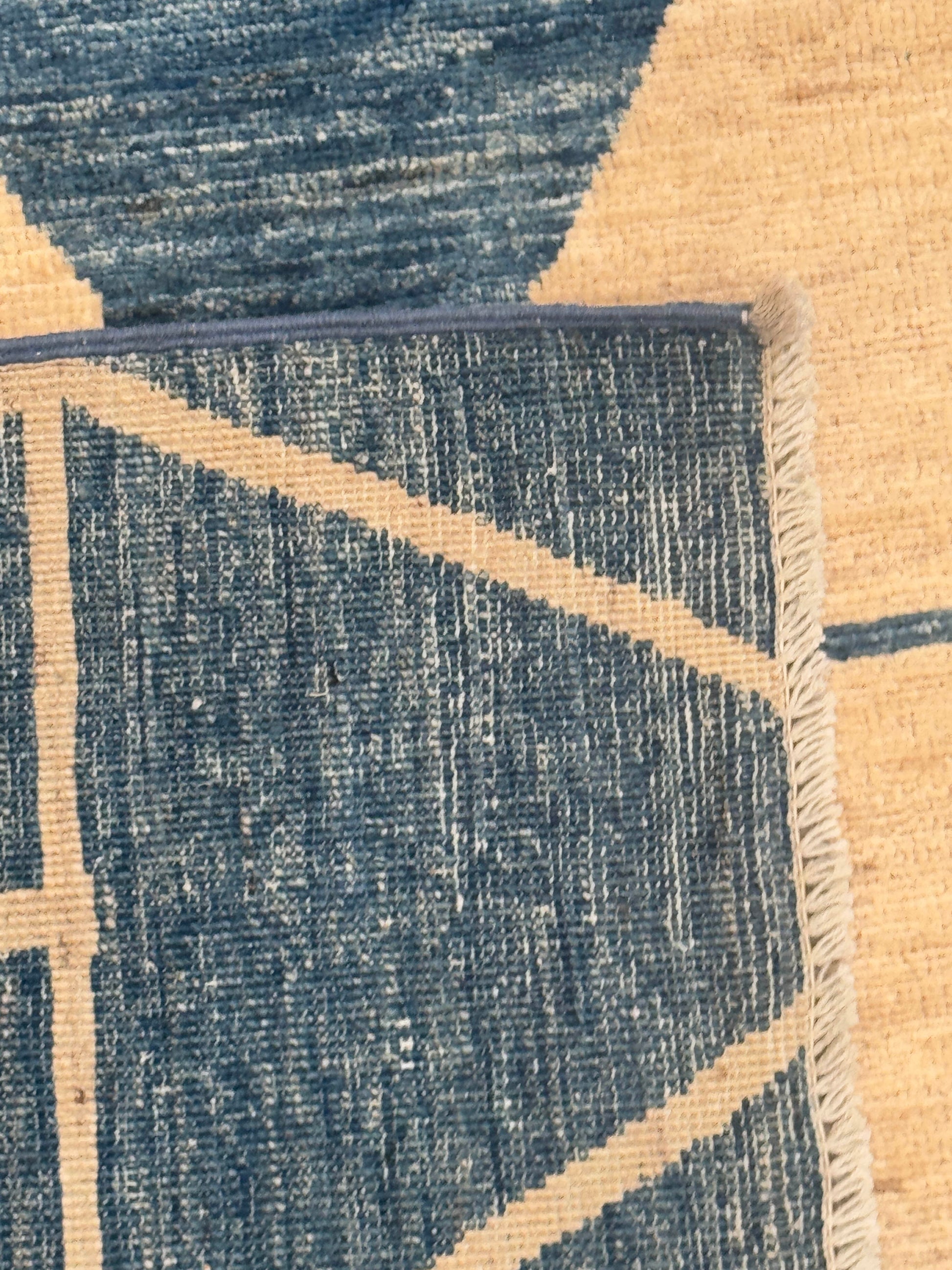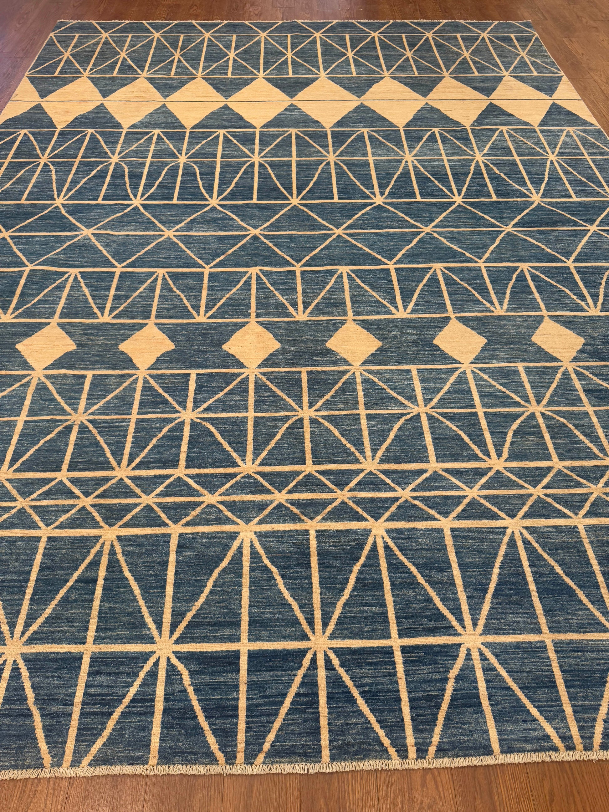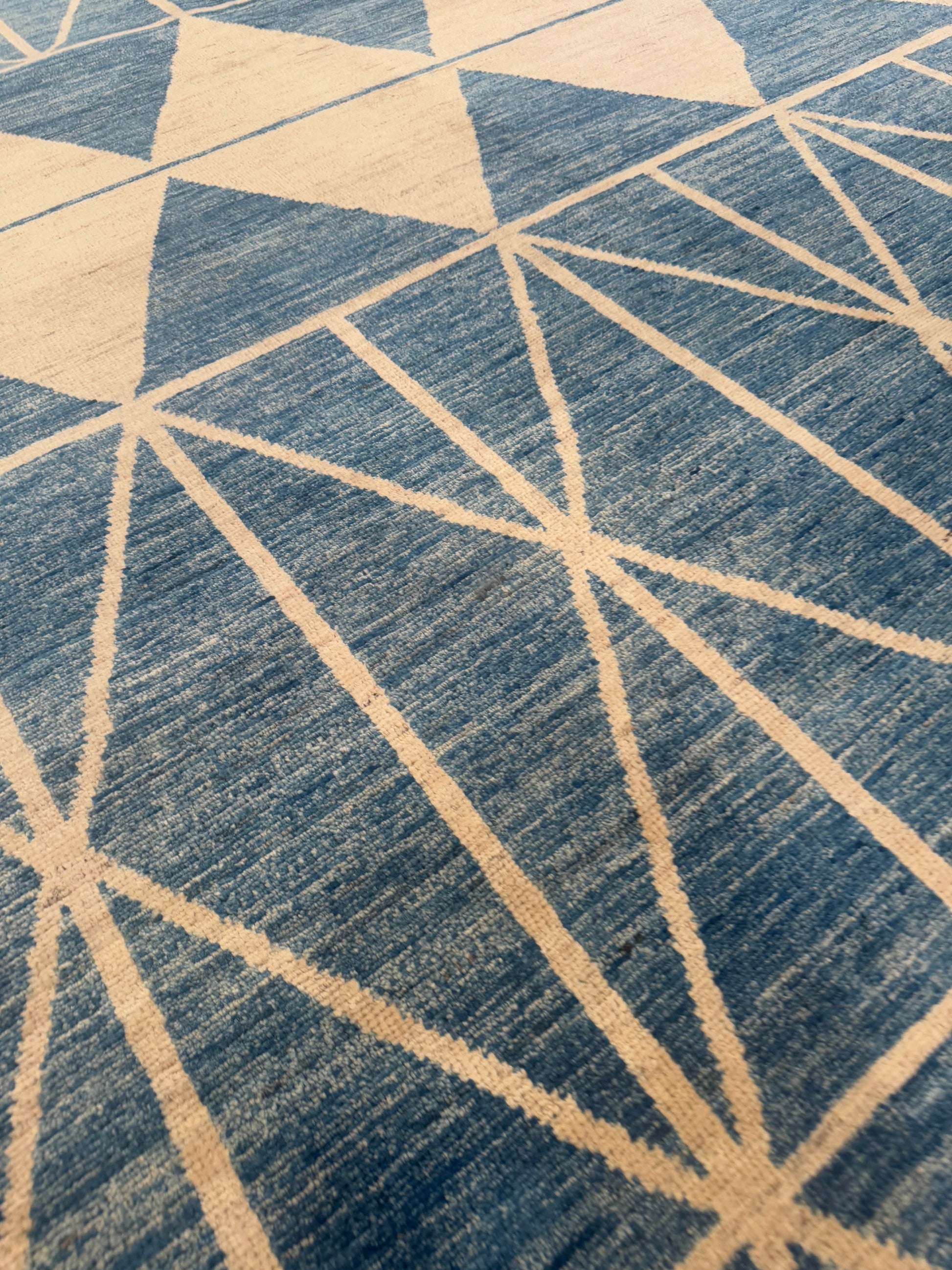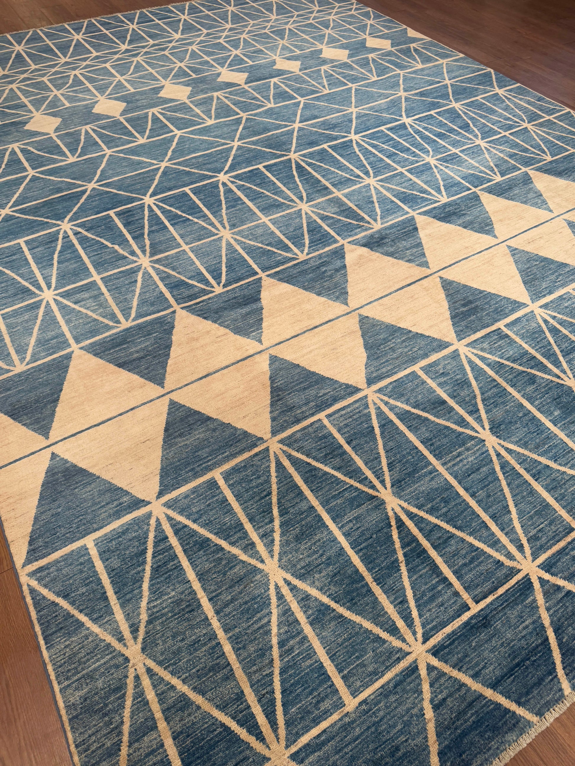 This handmade wool rug presents a striking geometric pattern with bold symmetry. The deep blue background is accented by ivory triangular and diamond forms, creating a clean, modern aesthetic. Its sharp lines and balanced composition make it a versatile piece for contemporary interiors seeking sophistication with artisanal character.