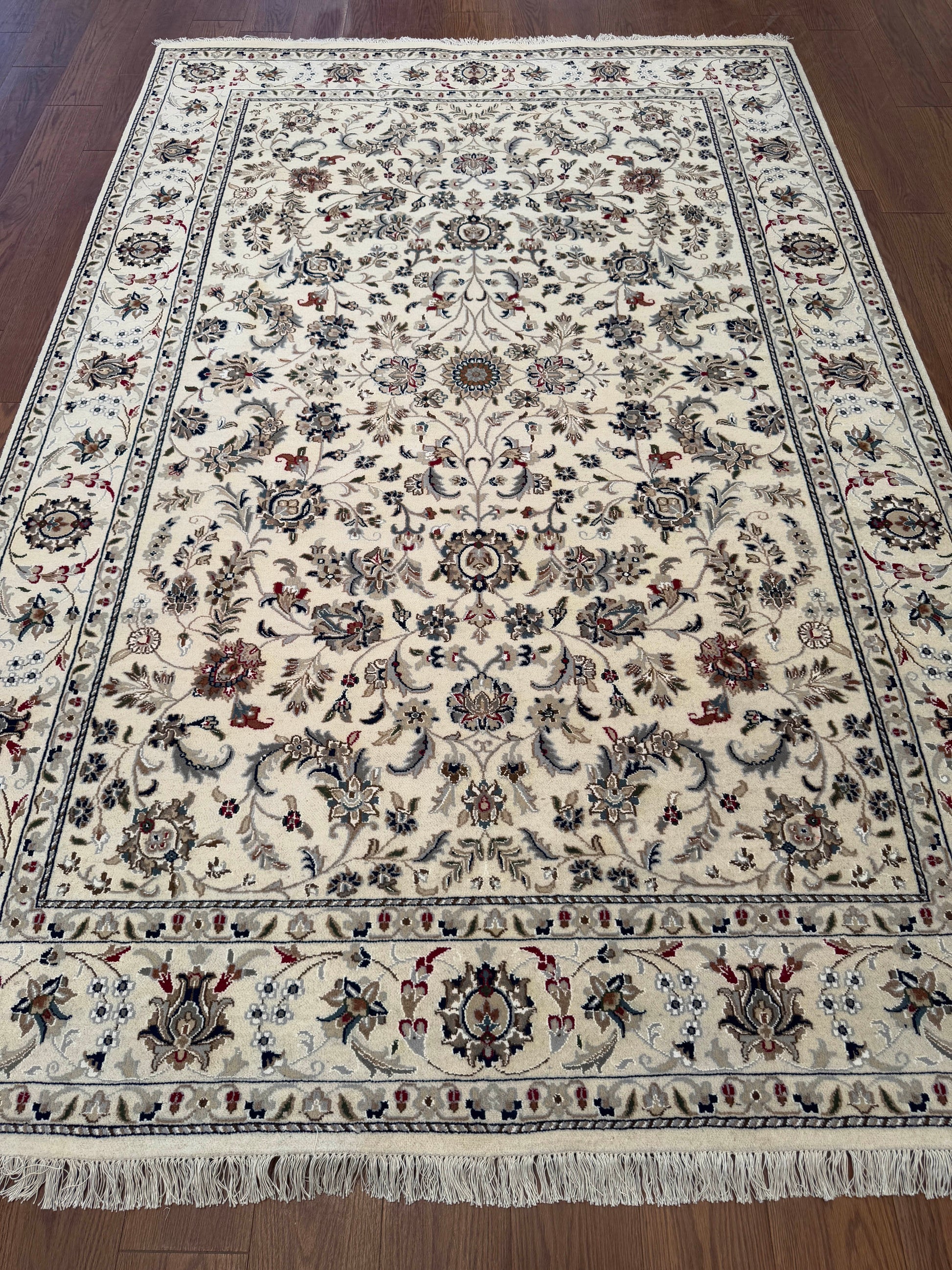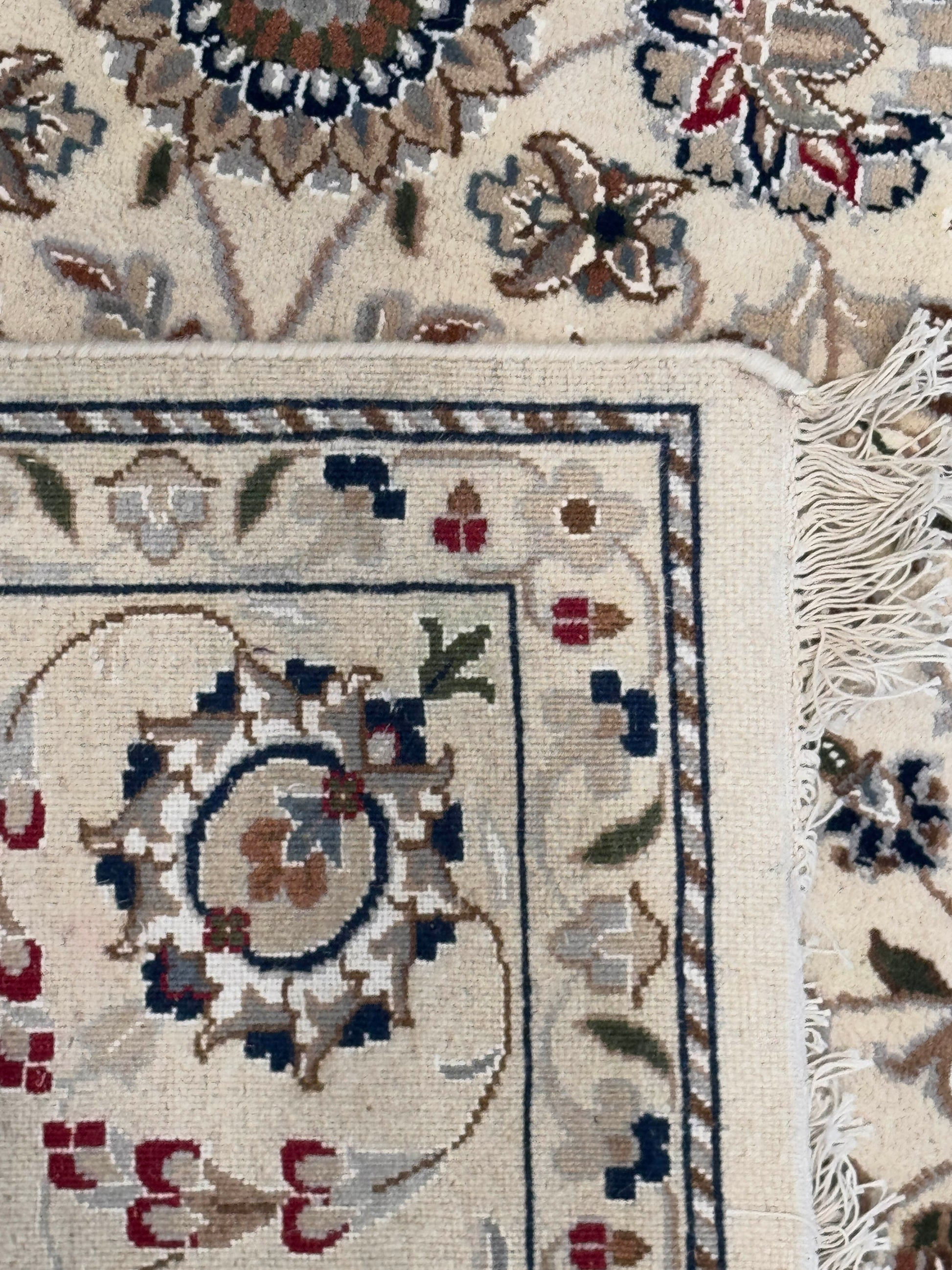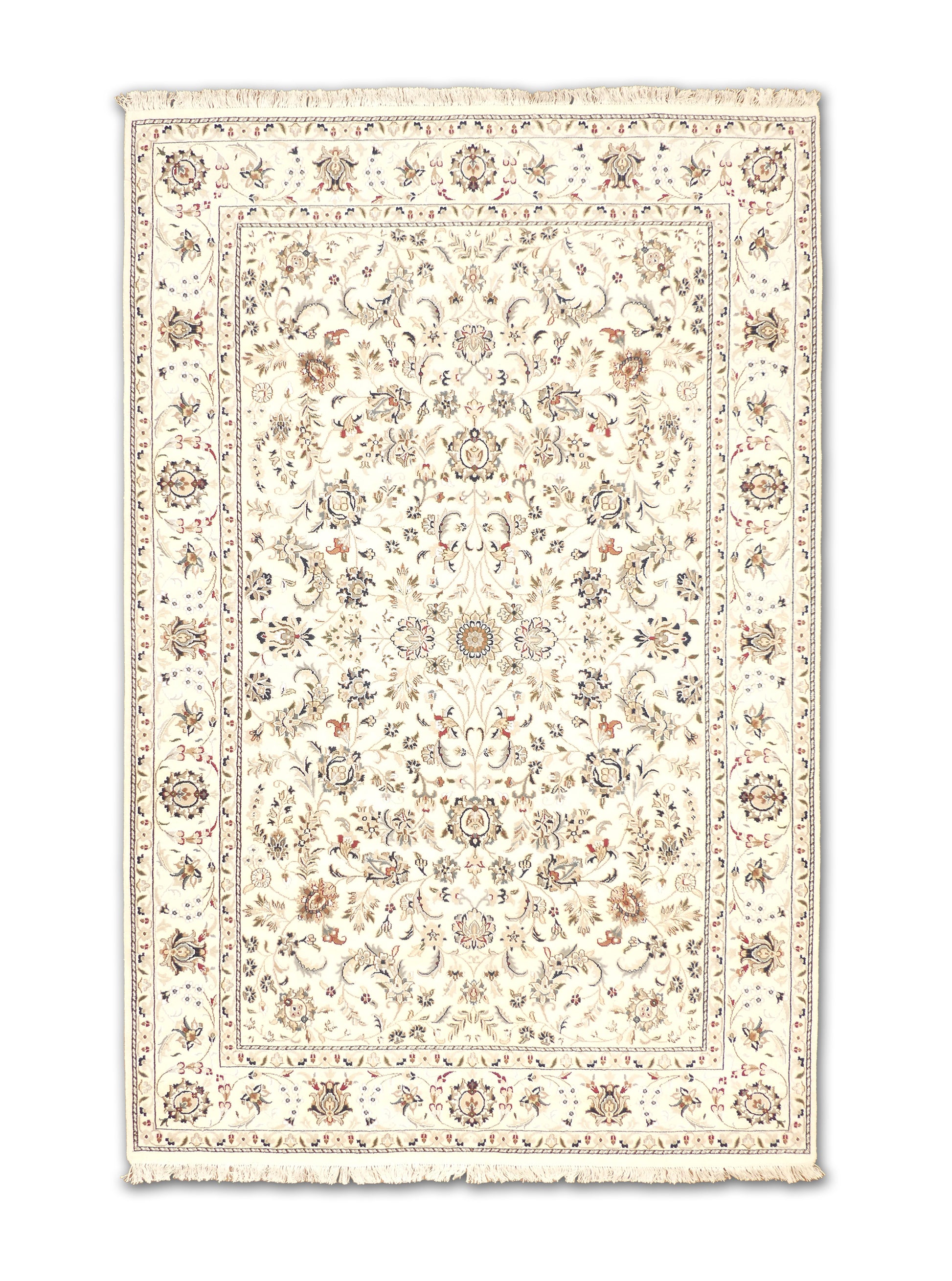 This refined hand-knotted rug features a cream background beautifully adorned with scrolling floral vines and intricate rosettes, giving it a light and graceful appearance. Its balanced pattern is framed by a classic border of palmettes and arabesque details, emphasizing its elegance and sophistication. The soft contrast of muted tones ensures versatility in both traditional and transitional interiors.