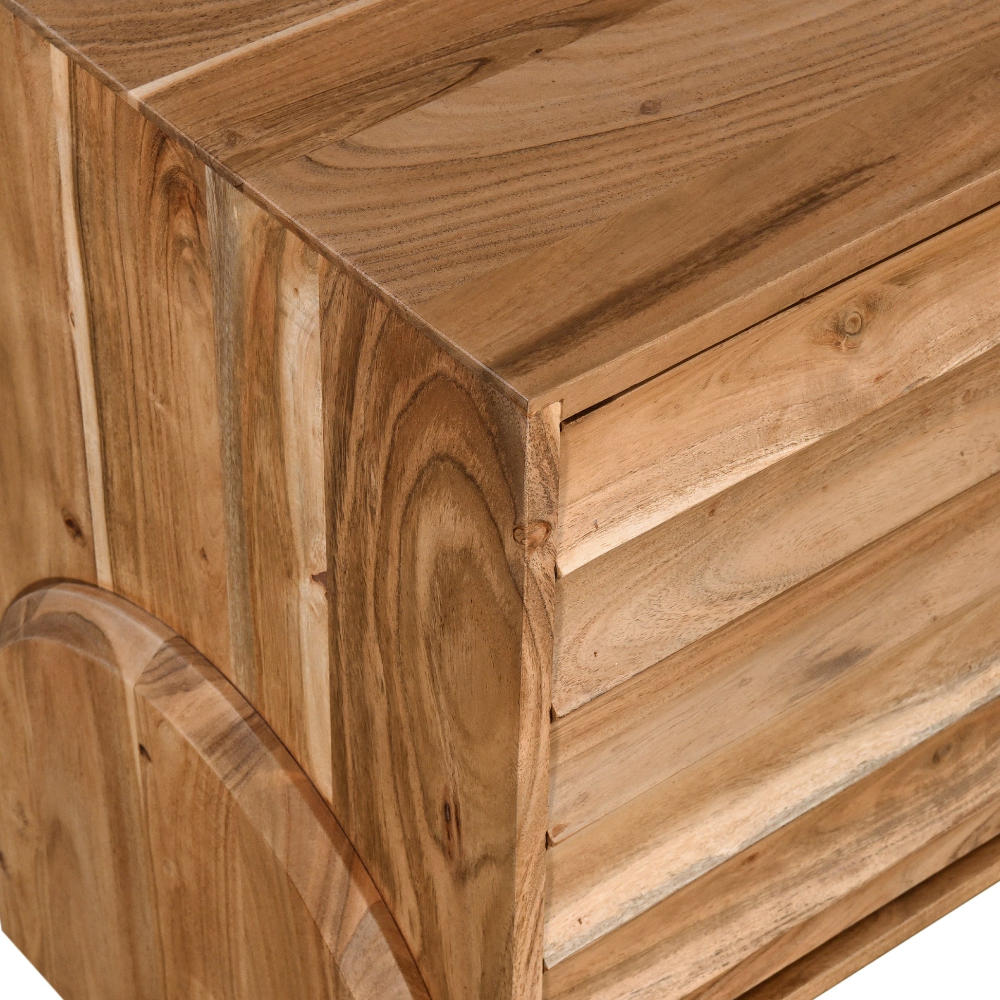 This media cabinet showcases the organic warmth of acacia wood in a clean, modern silhouette. The smooth natural finish highlights distinctive grain patterns, bringing texture and depth to contemporary interiors. Featuring spacious storage compartments behind streamlined doors, it offers both practicality and understated elegance for media organization or display. Designed for versatile use, it blends craftsmanship and simplicity, making it a timeless addition to any living space.
